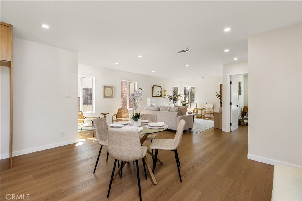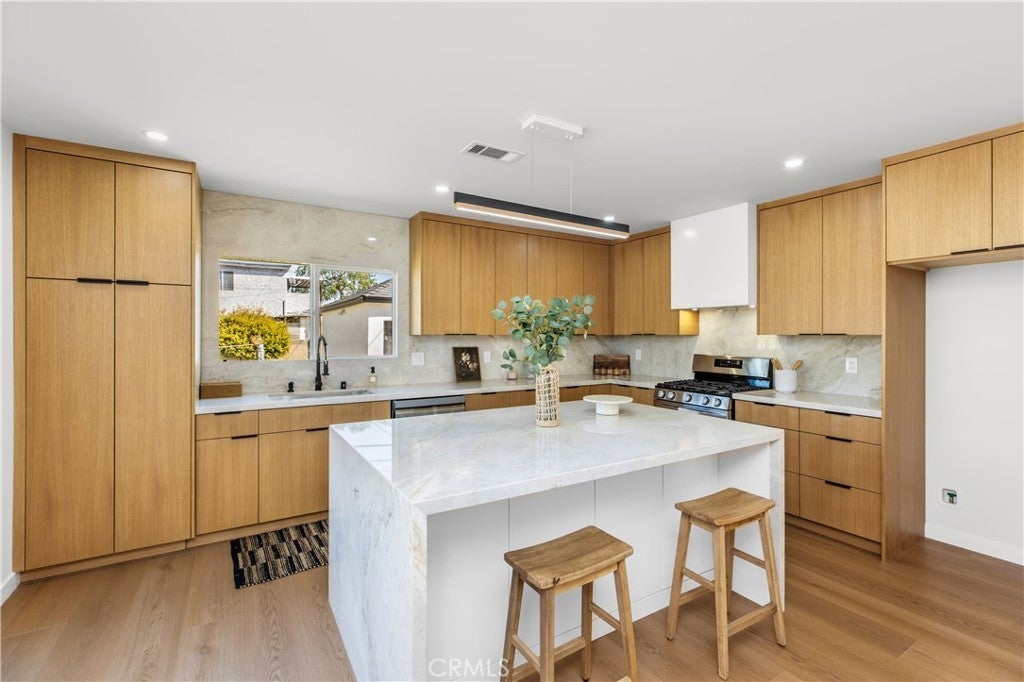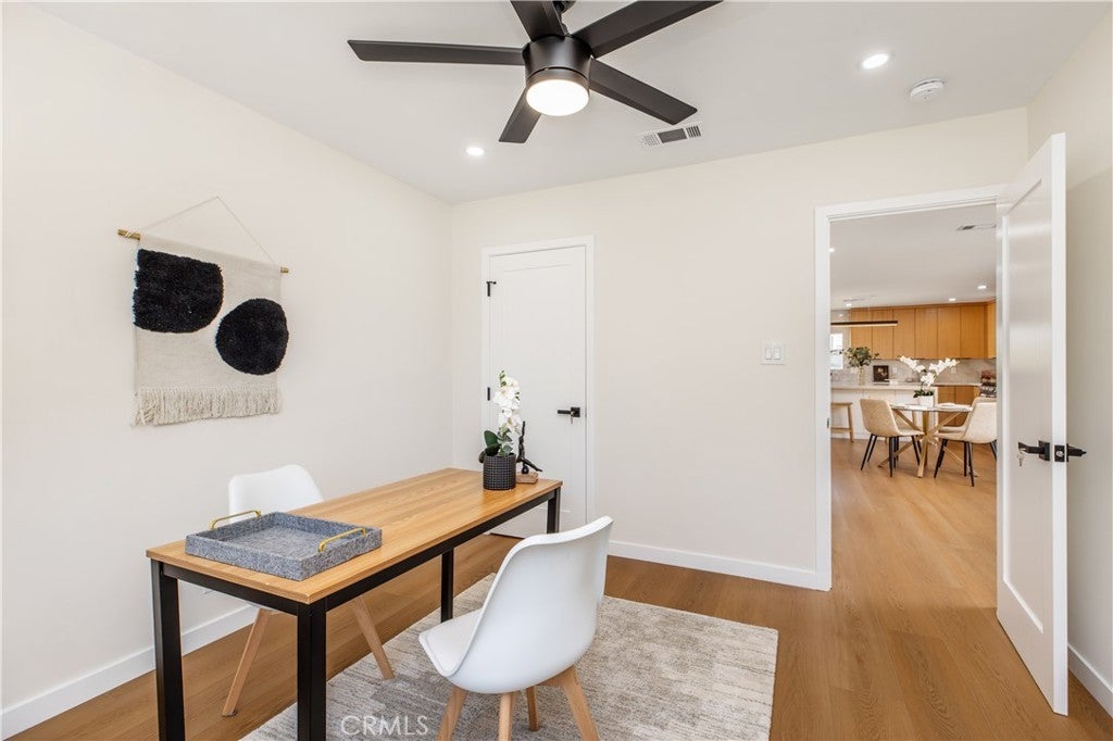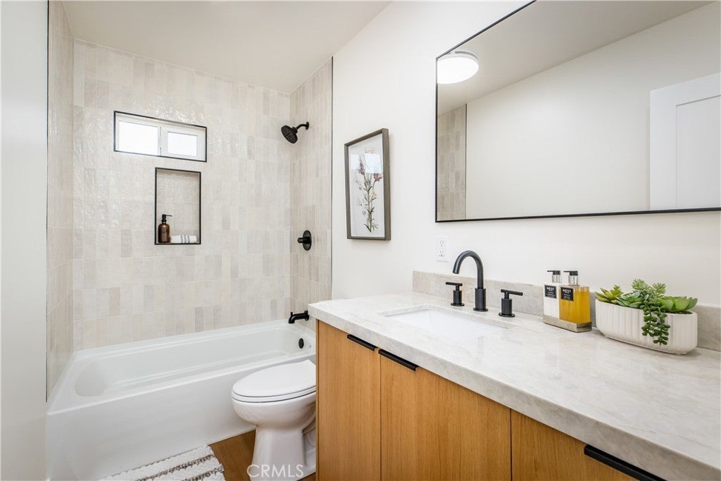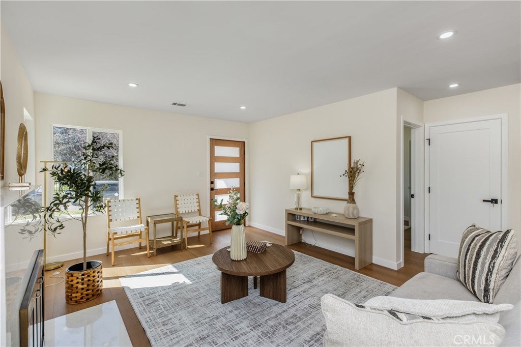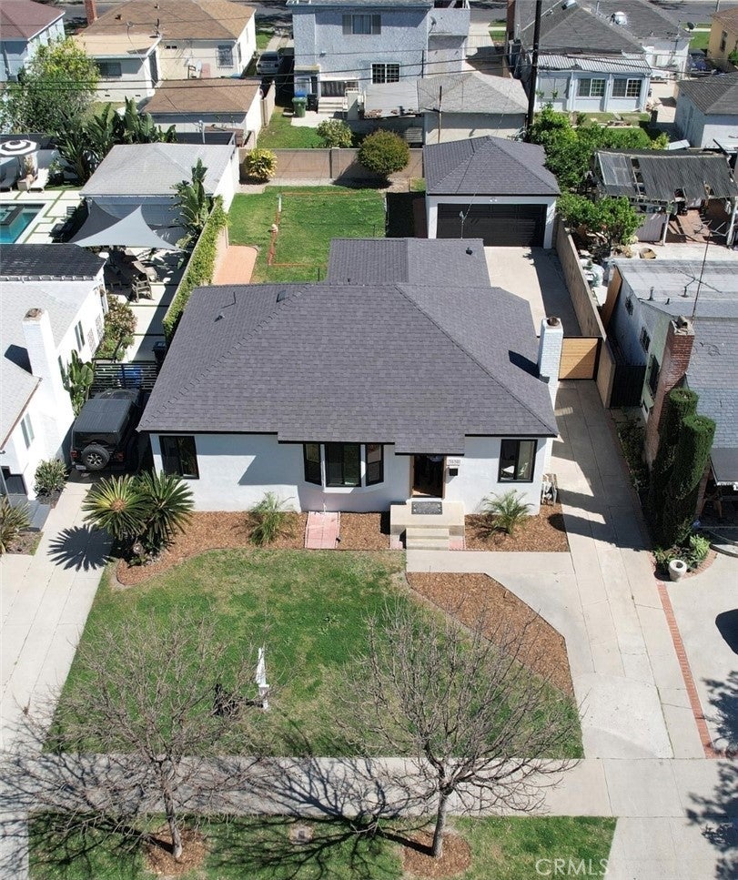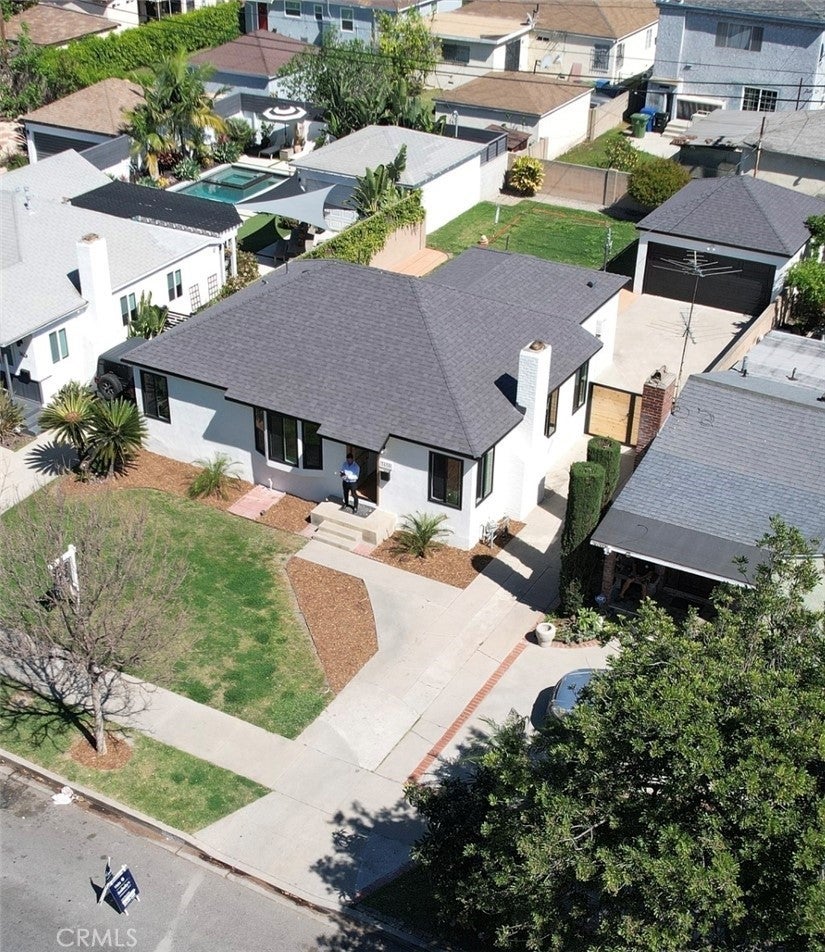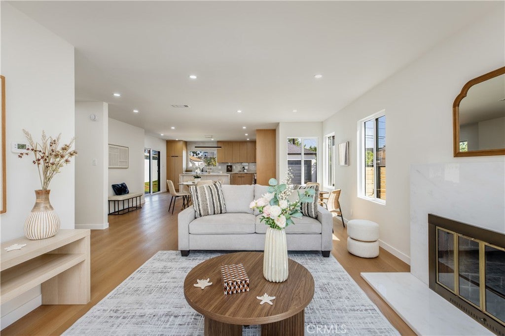 This beautifully updated, chic home offers the perfect balance of historic charm and modern amenities. The property has been thoughtfully remodeled with quality materials and modern upgrades throughout. Upon arrival, you are welcomed by a grassy front yard and a solid mahogany front entry door, setting the tone for the craftsmanship found inside. The home features a spacious open-concept layout with 3 bedrooms and 2 full bathrooms, including a primary suite with a private en-suite bath. Inside, the home showcases luxury oak flooring, new insulation, new drywall, new interior doors, fresh interior and exterior paint, and new LED lighting installed throughout the home. These upgrades were thoughtfully completed with energy efficiency in mind. The vibrant open living space is anchored by a stunning quartz slab fireplace, creating a warm focal point that seamlessly flows into the formal dining area. The modernized kitchen is designed for both functionality and style, featuring: Taj Mahal natural stone countertops and island — a beautiful and durable natural stone. Soft-closing white oak cabinetry with oversized pantry-style storage Large barn-style sink Down bar seating for casual dining Stainless steel appliances, including an LG dishwasher, Cosmo built-in microwave, and 4-burner stove with oven Both bathrooms feature white oak cabinetry, Taj Mahal countertops, and waterproof accented tile finishes, combining durability with elegant design. Wireless ceiling fans with integrated LED lighting in the bedrooms The new dual-pane windows are farmhouse-style black retrofitted vinyl and doors installed throughout the property, improving both energy efficiency and architectural appeal. The backyard Trex composite waterproof deck and sitting area, overlooking a large grass sports yard, perfect for outdoor activities, gatherings, and entertaining. a separate two-car garage, The backyard entrance is secured with a custom oak and steel gate, providing privacy, security, and an elegant architectural touch to the property. Additional major upgrades include: NEW Roof just installed, New 4-ton A/C- HVAC system with heat pump. New 200-amp electrical service, New Tankless water heater. Even more allCopper plumbing exist. This home offers modern living with peace of mind, where major systems and finishes have been upgraded for comfort, efficiency, and long-term durability. Your children can walk to nearby schools, perfect to raise a family. Close to 10-fwy, 405-fwy & 110-fwy.