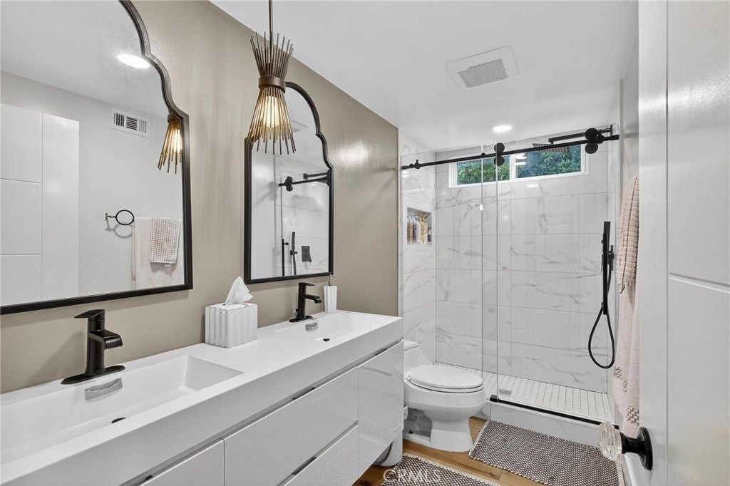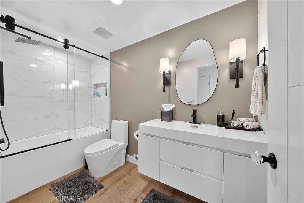 Rare single-level end unit with stunning panoramic city light views! Spectacularly remodeled. Enjoy breathtaking vistas that stretch from Downtown Los Angeles to the San Pedro Pier. This 3-bedroom, 2-bath home offers an expansive backyard and full-width patio — perfect for entertaining or quiet evenings under the lights. Beautifully updated with stainless steel appliances, quartz countertops, recessed lighting, and luxury vinyl and engineered wood flooring throughout. The spacious living room with fireplace opens to the patio, seamlessly blending indoor and outdoor living. The primary suite features large closets, a walk-in, an updated bath, and direct patio access. A two-car garage provides extra storage and a 220V outlet ready for an EV charger. Located in The Terraces, a prestigious 24-hour guard-gated community with pools, spas, tennis courts, clubhouse, and playground. A rare floor plan and exceptional opportunity — this one won’t last!