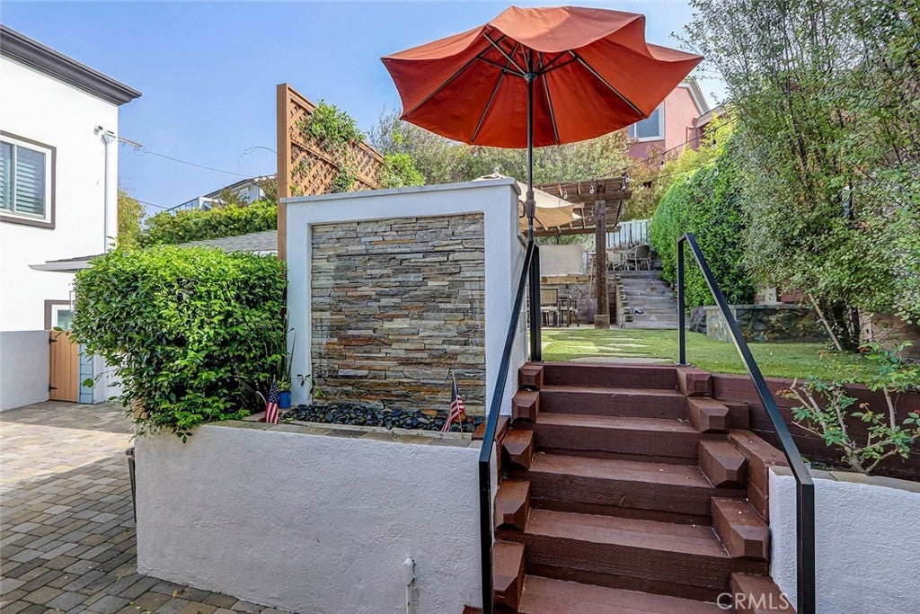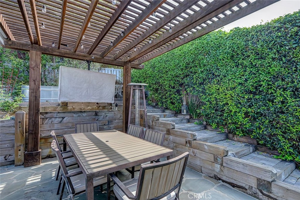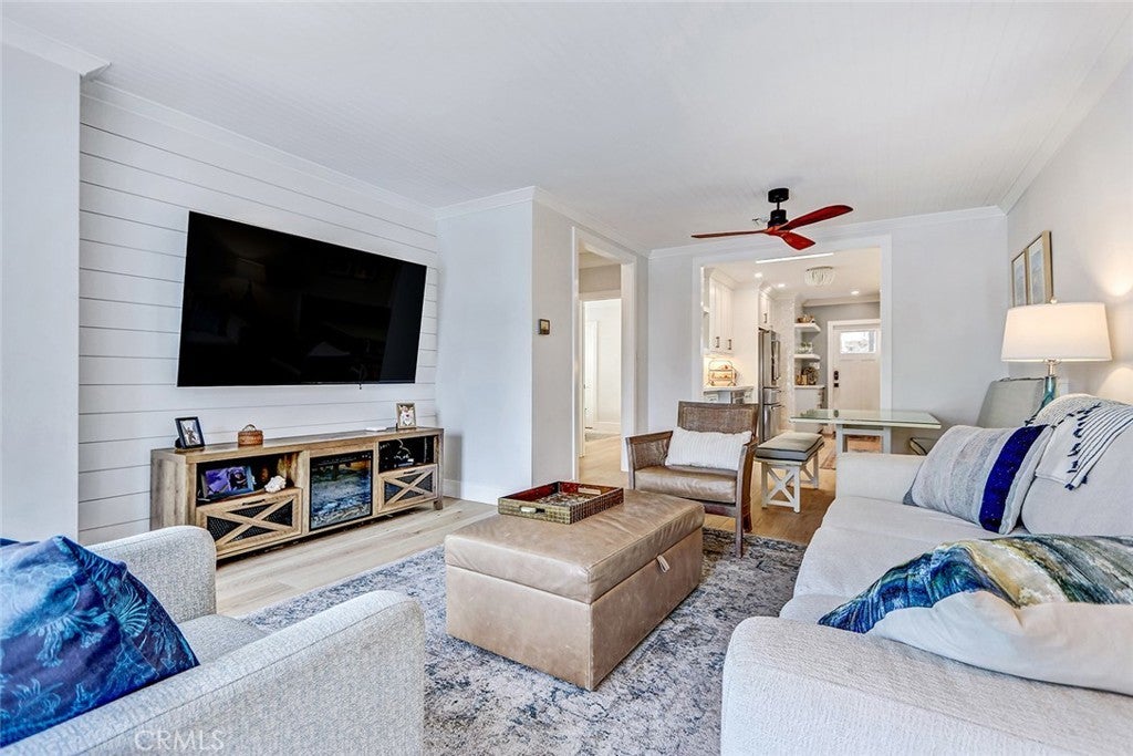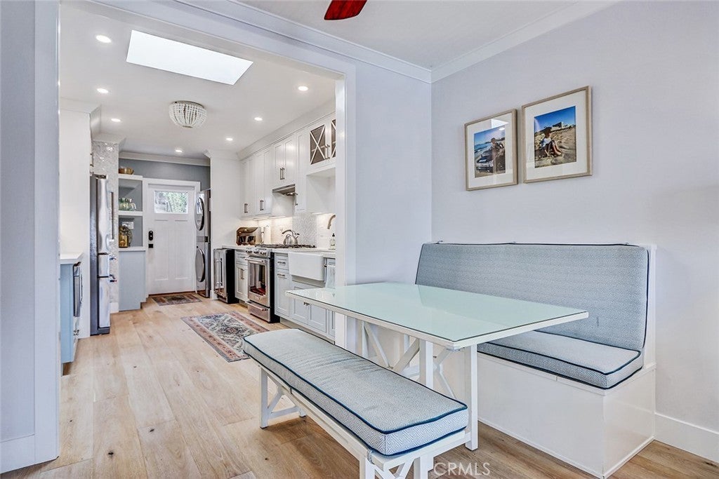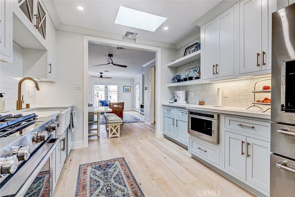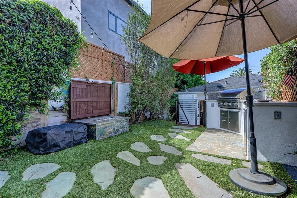 Tucked along a peaceful stretch of South Redondo, 517 Sapphire Street is a pristine beach cottage that radiates coastal charm and refined craftsmanship. Every inch of this immaculate home reflects thoughtful design—bright, balanced, and beautifully finished with magazine-worthy appeal. The living room welcomes you with a glass entry door and soft coastal textures. A beadboard ceiling and white slatboard accent wall add dimension, while ceiling fans keep the space cool on breezy days. Double French doors open to an elevated front deck, the perfect spot to enjoy ocean breezes and glowing sunsets—a seamless blend of indoor comfort and outdoor serenity. Wide-plank oak floors guide you into a sunlit kitchen where timeless design meets function. Quartz countertops, white shaker cabinetry above, and soft blue-green tones below create an elegant coastal palette accented by brushed gold hardware. A farmhouse sink, marble-and-mosaic backsplash, and skylight fill the space with light. High-end KitchenAid appliances, a beverage center, floating shelves, and a built-in dining nook make this kitchen both stylish and inviting. Both bedrooms echo the home’s relaxed sophistication, featuring crown molding, wide baseboards, and dual-pane windows for warmth and quiet. The primary bedroom embraces clean lines, while the west bedroom benefits from afternoon light. The bath is beautifully appointed with marble floors, a jetted soaking tub, and mosaic glass inlays that add subtle artistry. Step through the kitchen’s Dutch door to a private backyard designed for coastal entertaining. A custom pergola with retractable screens and built-in heater shades the outdoor kitchen, complete with stainless-steel BBQ, polished stone counters, and serving space. Tiered landscaping features low-maintenance turf, stone accents, and raised garden beds with a drip system. The gas fire pit—its flame flickering through glass rocks—sets the tone for relaxed evenings under the stars while a stone water feature adds the soothing sound of nature. Additional amenities include air conditioning, automatic sprinklers, a paver driveway, and a spacious two-car garage with extra storage. 517 Sapphire Street is a coastal retreat where craftsmanship, comfort, and California sunlight converge.