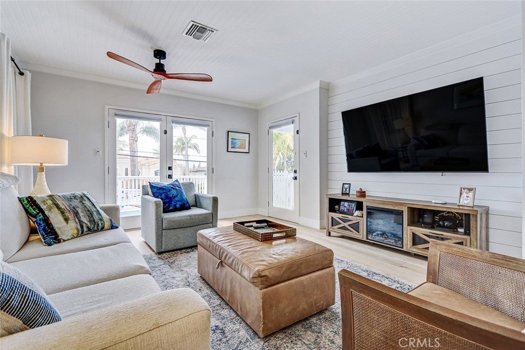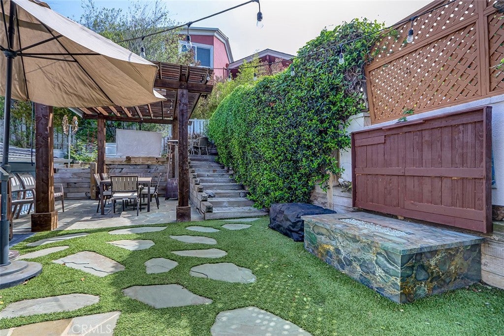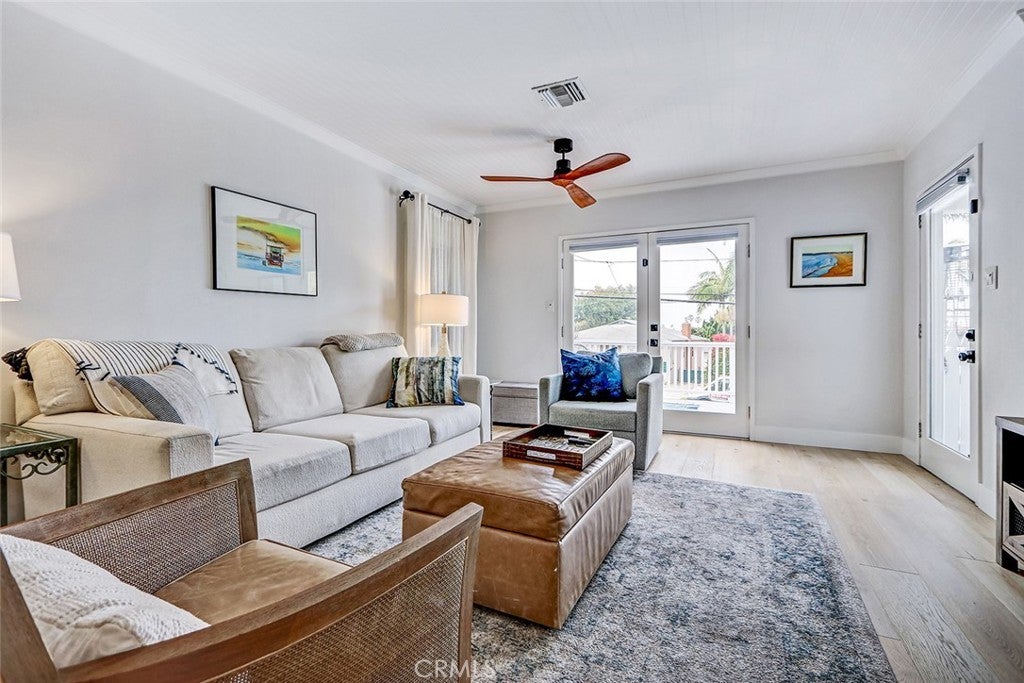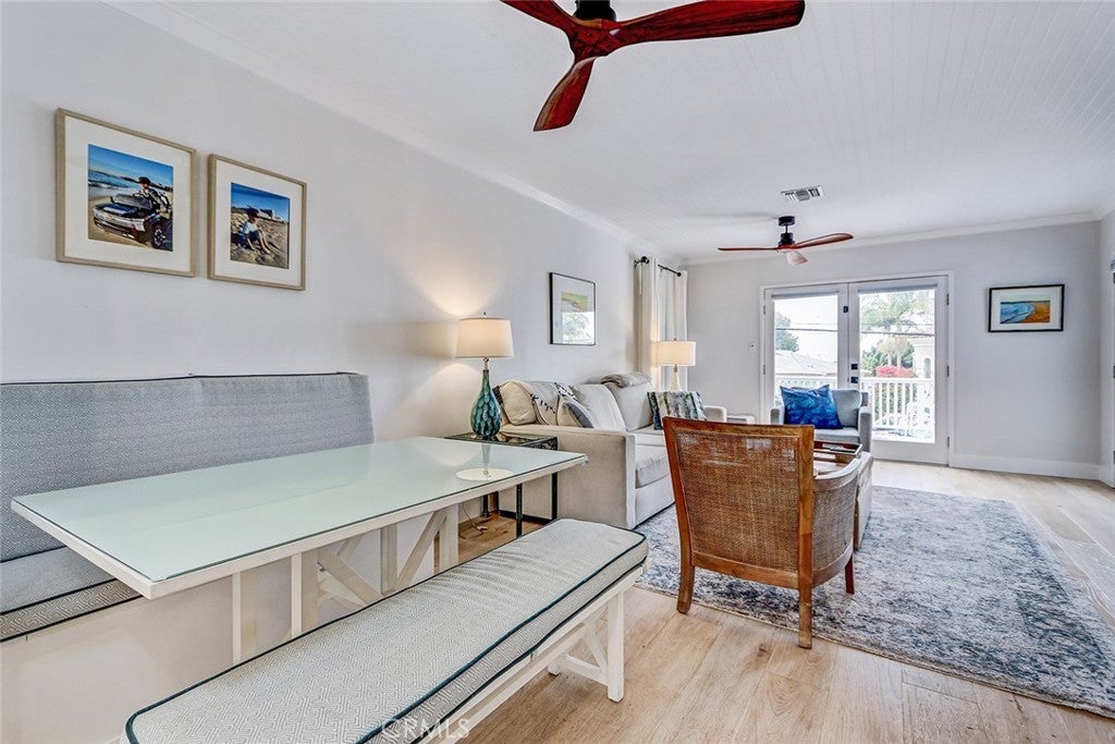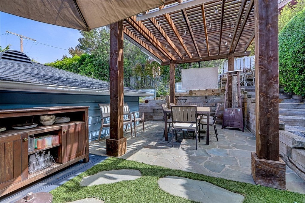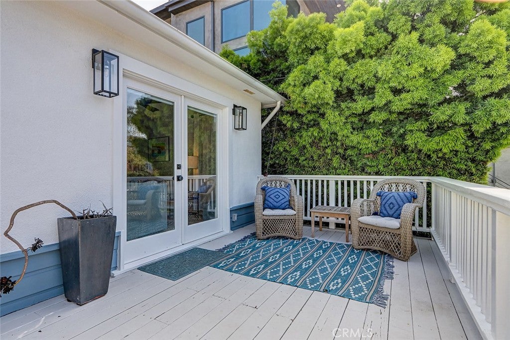 Tucked along a peaceful stretch of South Redondo, 517 Sapphire Street is a pristine beach cottage that radiates coastal charm and refined craftsmanship. Every inch of this immaculate home reflects thoughtful design—bright, balanced, and beautifully finished with magazine-worthy appeal. The living room welcomes you with a glass entry door and soft coastal textures. A beadboard ceiling and white slatboard accent wall add dimension, while ceiling fans keep the space cool on breezy days. Double French doors open to an elevated front deck, the perfect spot to enjoy ocean breezes and glowing sunsets—a seamless blend of indoor comfort and outdoor serenity. Wide-plank oak floors guide you into a sunlit kitchen where timeless design meets function. Quartz countertops, white shaker cabinetry above, and soft blue-green tones below create an elegant coastal palette accented by brushed gold hardware. A farmhouse sink, marble-and-mosaic backsplash, and skylight fill the space with light. High-end KitchenAid appliances, a beverage center, floating shelves, and a built-in dining nook make this kitchen both stylish and inviting. Both bedrooms echo the home’s relaxed sophistication, featuring crown molding, wide baseboards, and dual-pane windows for warmth and quiet. The primary bedroom embraces clean lines, while the west bedroom benefits from afternoon light. The bath is beautifully appointed with marble floors, a jetted soaking tub, and mosaic glass inlays that add subtle artistry. Step through the kitchen’s Dutch door to a private backyard designed for coastal entertaining. A custom pergola with retractable screens and built-in heater shades the outdoor kitchen, complete with stainless-steel BBQ, polished stone counters, and serving space. Tiered landscaping features low-maintenance turf, stone accents, and raised garden beds with a drip system. The gas fire pit—its flame flickering through glass rocks—sets the tone for relaxed evenings under the stars while a stone water feature adds the soothing sound of nature. Additional amenities include air conditioning, automatic sprinklers, a paver driveway, and a spacious two-car garage with extra storage. 517 Sapphire Street is a coastal retreat where craftsmanship, comfort, and California sunlight converge.