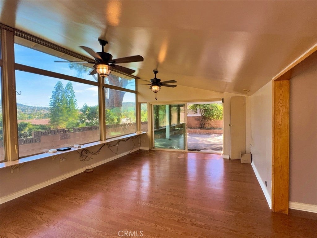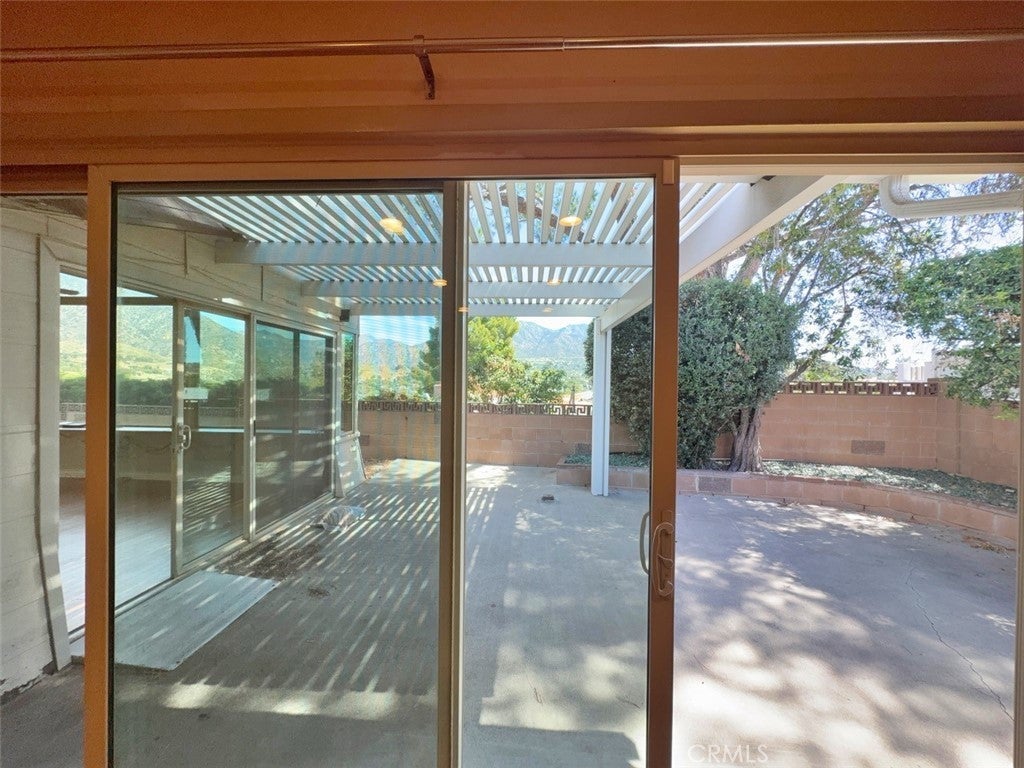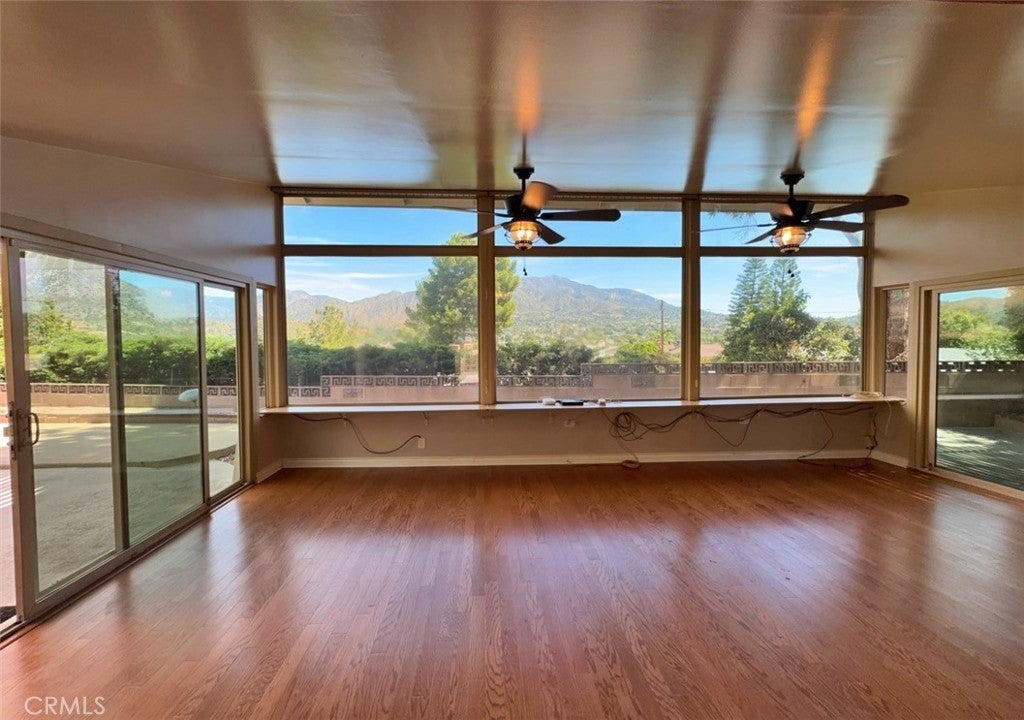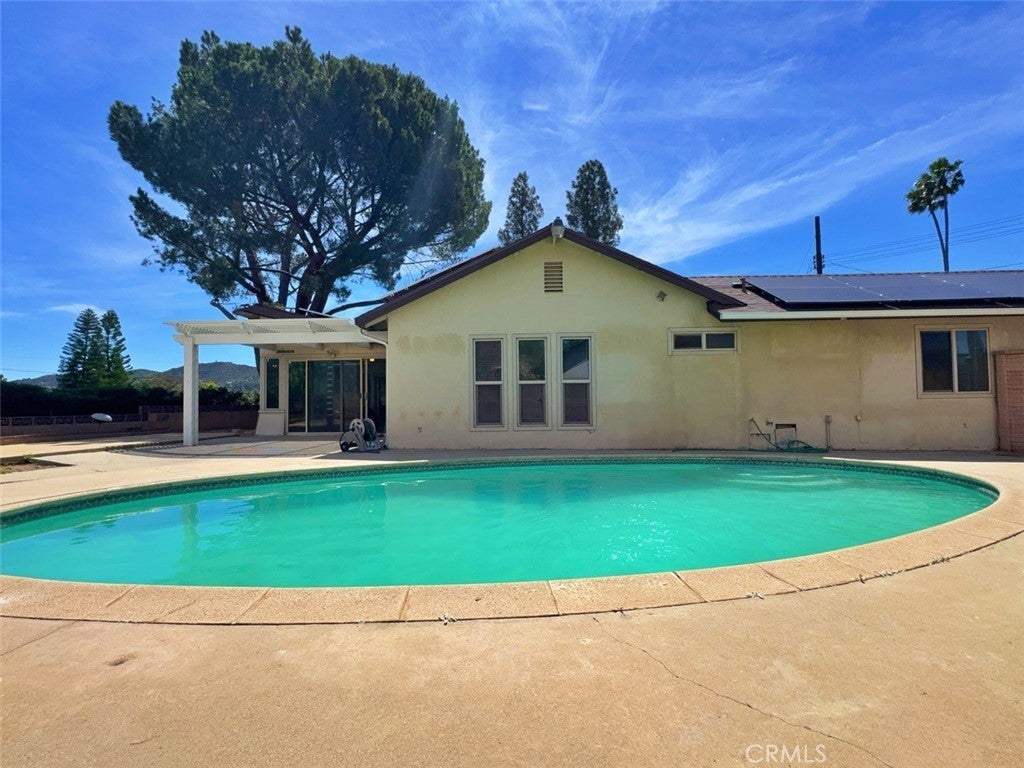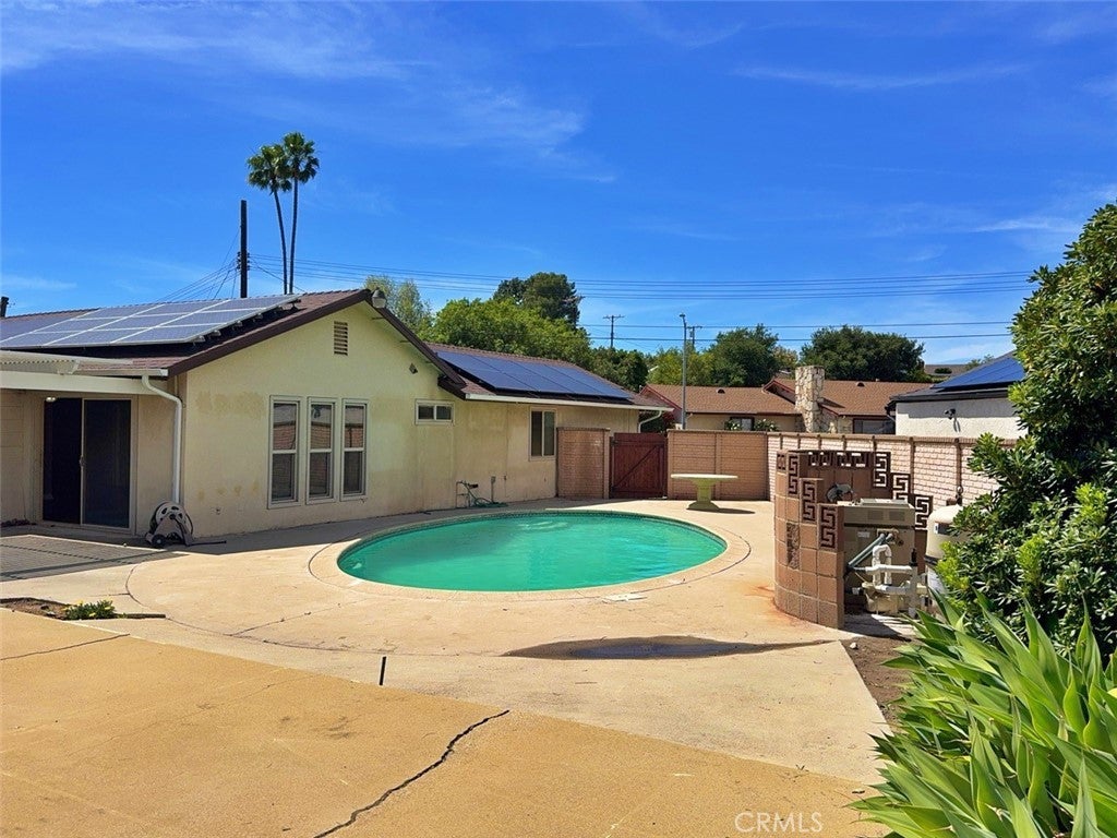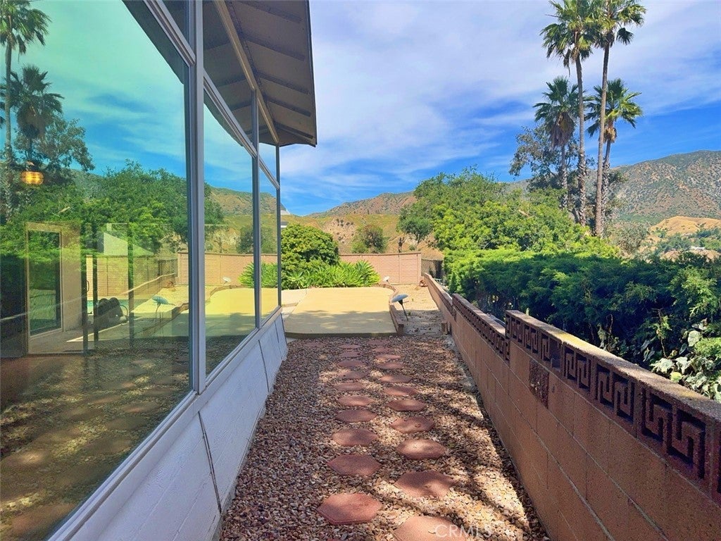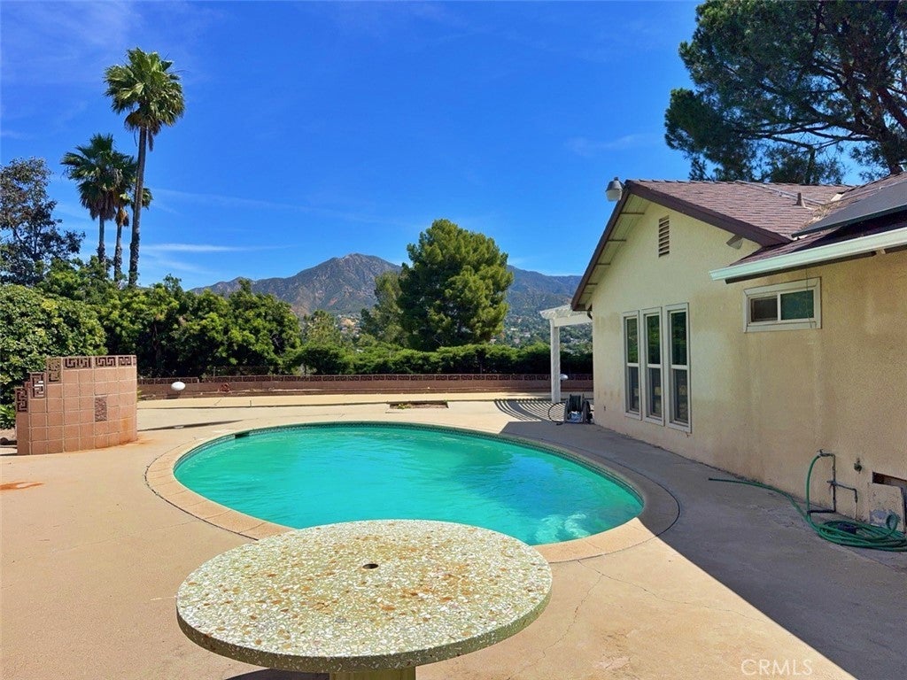 Welcome to 8811 Riderwood Drive, a special home nestled in a quiet neighborhood with breathtaking mountain views that create a true sense of peace and retreat. Lovingly cared for over the years, this single-story 3-bedroom, 2-bathroom pool home offers warmth, character, and a setting that's hard to find. The true showpiece is the expansive sunroom, where walls of panoramic windows frame the Verdugo Mountains beneath a vaulted ceiling with dual ceiling fans. Filled with natural light and finished with hardwood floors, this room is perfect for enjoying the surrounding scenery year-round. Hardwood floors flow throughout the open living and dining areas, which connect to a well-appointed kitchen featuring oak cabinetry, dark granite countertops, a gas range, and recessed lighting. Large sliding glass doors open to a covered patio with a charming pergola, ideal for al fresco dining with mountain views as your backdrop. The generous primary suite features a striking natural stone fireplace, recessed lighting, and direct sliding-door access to the pool and backyard. The ensuite bathroom offers a beautifully tiled walk-in shower with marble-style tilework and a decorative mosaic accent band. Two additional bedrooms with hardwood floors and ample closet space share an updated hall bathroom with tile surround and glass-enclosed shower. Step outside to your own private oasis. A sparkling pool with a generous deck is framed by mature palm trees and mountain views, creating the perfect setting for entertaining or quiet relaxation. A side yard with stepping stones and decorative mid-century block walls adds architectural charm. Additional highlights include energy-saving solar panels, drought-tolerant landscaping with lush synthetic turf out front for zero-maintenance curb appeal, central A/C and heating, a 2-car attached garage with laundry, and no HOA. Whether you're relaxing with a morning coffee or gathering with friends and family, this home offers an inviting indoor-outdoor flow. With its serene surroundings, beautiful views, and timeless appeal, this is a rare opportunity to own a home that has been truly cherished and is ready for its next chapter.