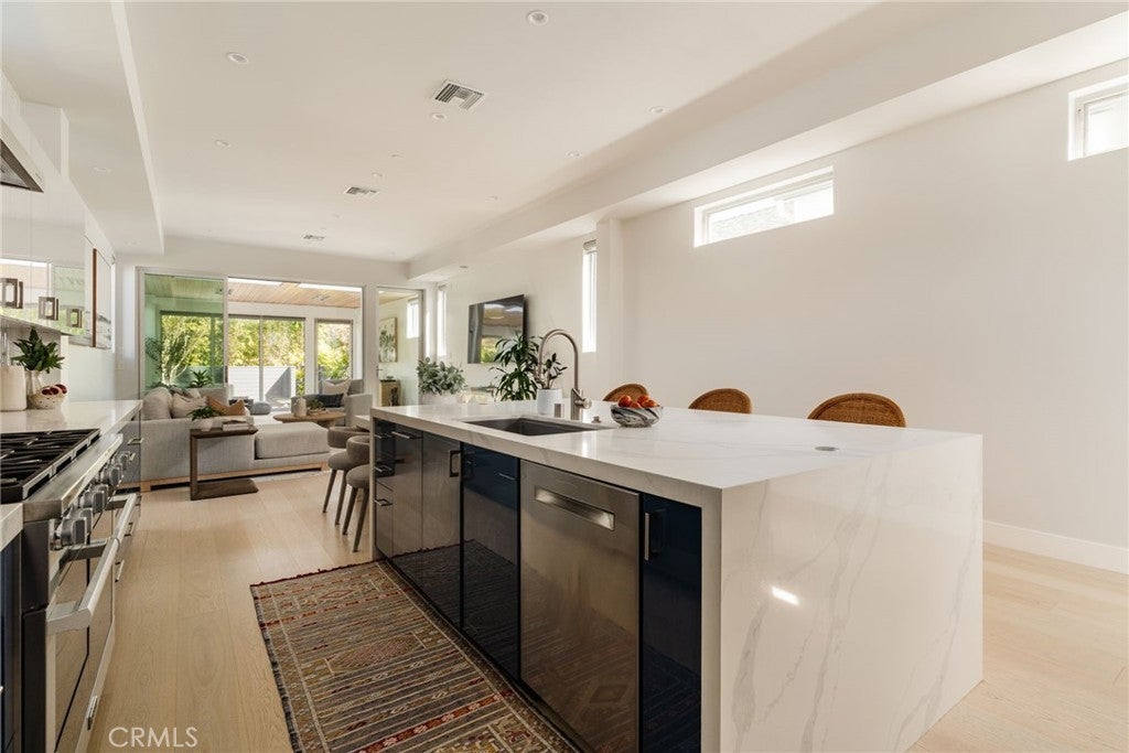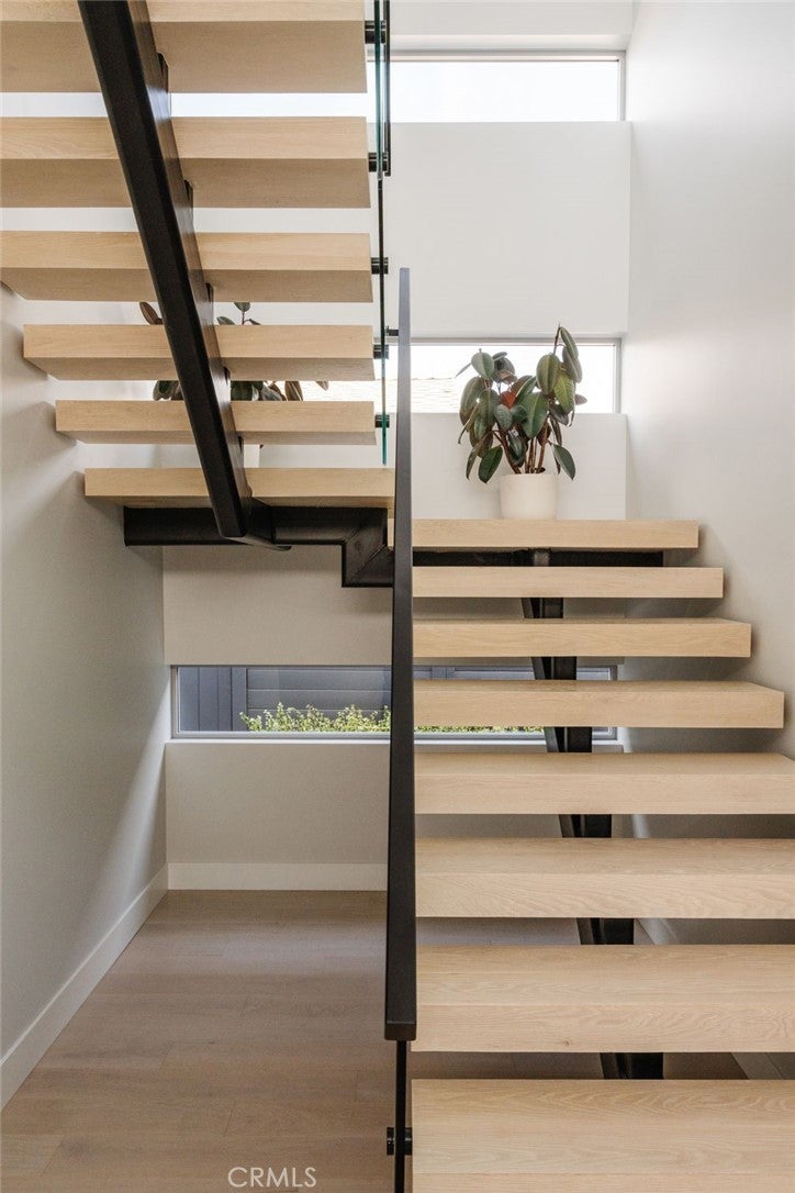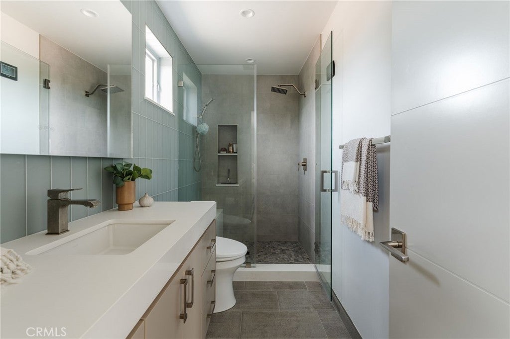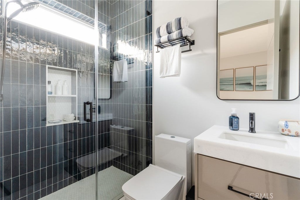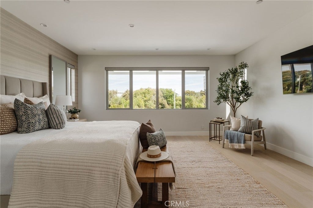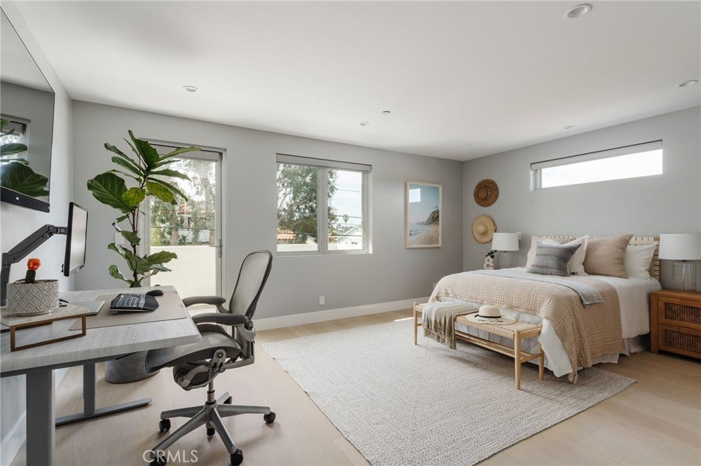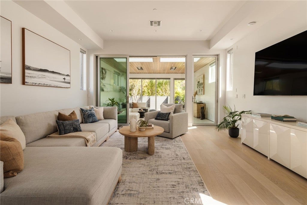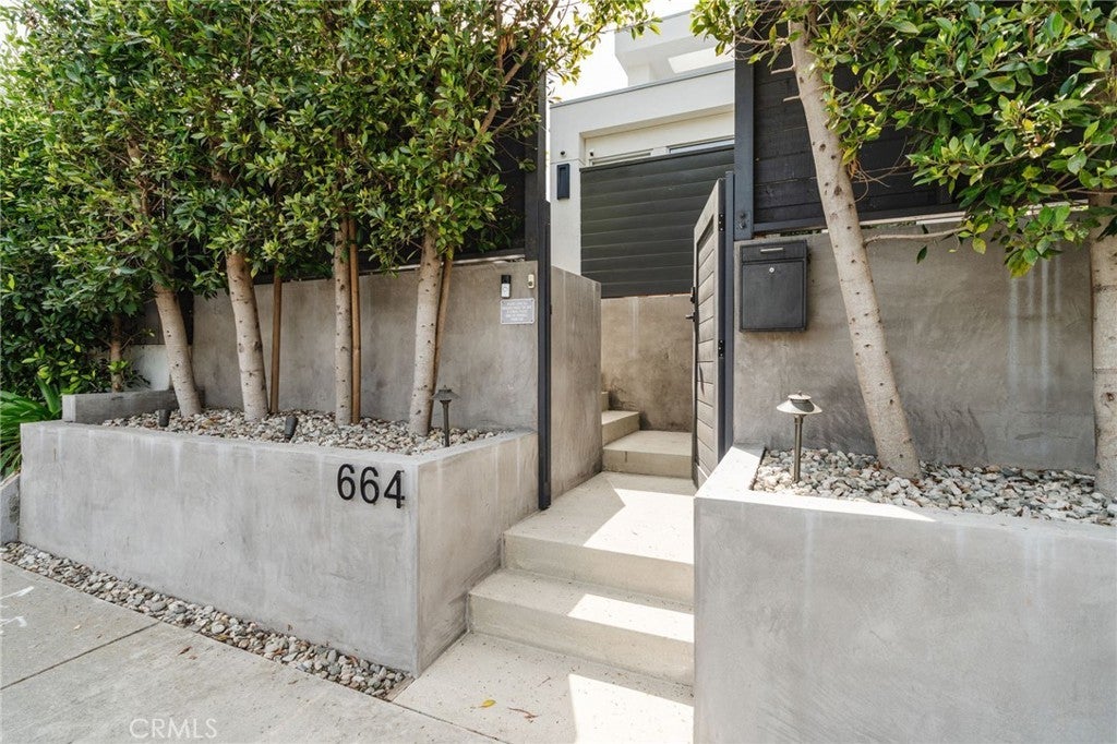 Hidden away, discover this newly built 2022 contemporary retreat defined by a calming aura, refined design, and elevated finishes. Serene, private, and thoughtfully composed, the home unfolds through a natural flow, paired with seamless living and abundant natural light. Designed as a true escape, privacy windows, lush landscaping, and the intentional positioning of living and sleeping spaces create a tranquil, immersive environment. Entering through landscaped gardens, you are welcomed into an enclosed sunroom designed for organic living (adding an additional 323 SF). Floor-to-ceiling windows, skylights, and ceiling-mounted heaters allow year-round use. Sliding LaCantina doors connect seamlessly to the living room, enhancing indoor-outdoor flow. Hardwood floors add warmth, while 12-foot ceilings, 7.5-foot custom doors, and an open-concept layout define the main level. Recessed lighting is integrated throughout, complemented by Pella double-pane windows and interior fire sprinklers. The kitchen is both functional and refined, centered around a tiered 10-foot quartz island with dual seating. Custom cabinetry by Coastal Cabinets with drawer-within-drawer inserts enhances usability, while premium appliances include a Miele 48” dual fuel range with steam oven and warming drawer, Bosch dishwasher, built-in Miele microwave, plumbed Miele coffee system, and Dacor panel refrigerator and freezer. Also on the main level, find a powder room and a flexible guest bedroom or office with ensuite bath featuring an oversized glass shower and heated floors. The two-car garage includes epoxy flooring, built-in and overhead storage, and a hybrid charging station, with additional parking on the rear drive enclosed by an electric gate. Upstairs, the home continues its emphasis on privacy and ease of living, connected by a floating staircase. The primary suite is positioned at the front of the home, with a hallway lined in custom cabinetry offering exceptional storage. The spa-inspired bath features a fully enclosed oversized shower, soaking tub, dual vanities, heated floors, and a custom walk-in closet. A secondary bedroom offers added privacy, a private balcony, and an ensuite bath with heated floors and a glass shower. A laundry area with built-in storage completes the level. Additional highlights include solar panels and a built-in security system with six exterior cameras. Private, peaceful, and thoughtfully designed, 664 Rosecrans presents refined coastal living.