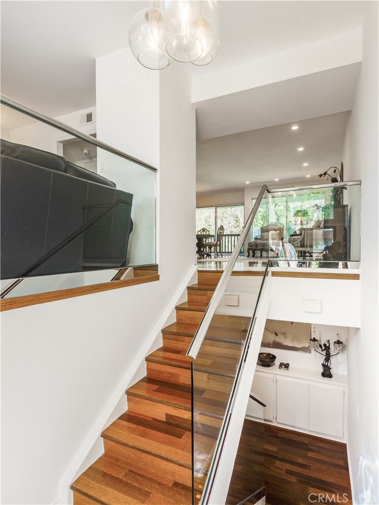 Nestled in the prestigious Terraces community, this home is located within a 24-hour guard-gated neighborhood offering an abundance of greenery and many amenities. Privately situated on a quiet cul-de-sac and surrounded by lush greenery, the property is just moments from the community pool and offers a peaceful, park-like ambiance. The residence features numerous upgrades including; wood flooring, a remodeled kitchen with granite countertops, main-floor bathroom, downstair 2nd bathroom, smooth ceilings, recessed lighting and a newer roof. This spacious unit offers three bedrooms and three full bathrooms, plus a versatile den, along with a large private patio overlooking serene greenbelt views from the breakfast area, dining room, and living room. The spacious primary suite include two walk-in closets. One bedroom is conveniently located on the main floor with a full bath nearby. The main-floor den can be easily converted into a fourth bedroom. A separate dining room adds to the home’s functionality and appeal. Centrally located in the heart of the Palos Verdes Peninsula, this home provides convenient access to Palos Verdes Peninsula High School, Ridgecrest Intermediate School, the local library, Highridge Park, and a variety of shopping and dining options.