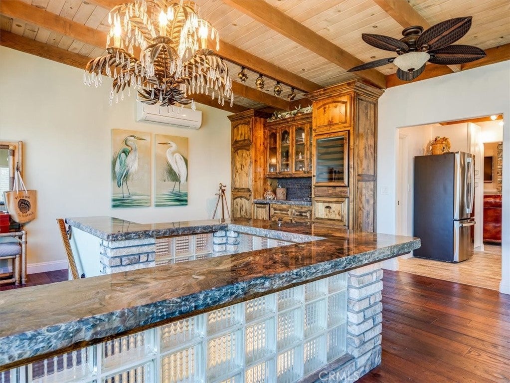 - Interior FeaturesBreakfast Bar, High Ceilings, Walk-In Closet(s), Balcony, Bar, Beamed Ceilings, Block Walls, Built-in Features, Ceiling Fan(s), Granite Counters, Open Floorplan, Track Lighting, Wet Bar