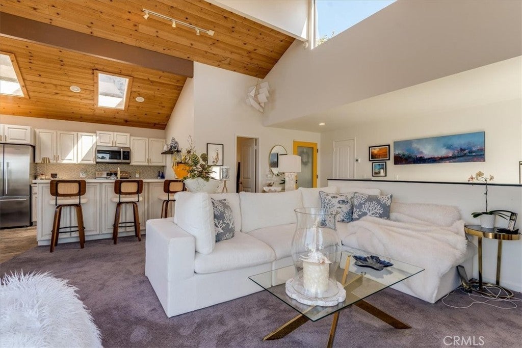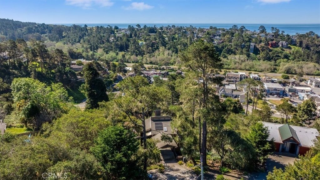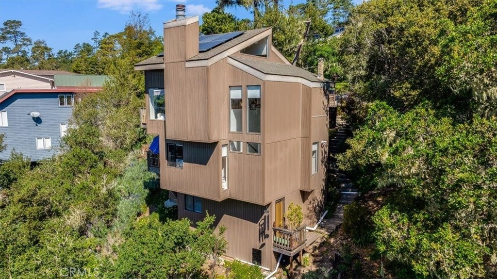 Fantastic White Water Ocean Views at this updated contemporary stylish home. Custom details throughout this 2 bedroom, 1.5 bath home on a a double merged lot. Upstairs features an open concept living, dining, and kitchen area, a half bath, and a deck. A cozy fireplace enhances your sunset watching, while the deck offers stunning views of the ocean, white water, and surrounding trees. The vaulted ceiling is adorned with decorative clerestory windows, wood detailing, and skylights that keep the space light and bright. The kitchen was tastefully updated with quartz countertops, custom soft-close cabinetry, new appliances, modern lighting, fixtures, and a slate tile backsplash. The tile flooring has a rustic wood look—easy to clean and perfect for beachside living. Additional updates include newer carpet, window blinds, drywall, and paint, giving this contemporary home standout appeal. Downstairs features the primary bedroom and bathroom, complete with a walk-in closet and an extra sink for guest convenience. A covered deck off the master bedroom provides a peaceful, private spot to take in the ocean waves. The third bedroom/bonus office/workshop is easy to access with a separate entrance at the bottom of the home. Stone steps lead around the side of the home, and the property includes a carport and additional parking with a concrete driveway. The lot has a shed with a deck and a chicken coop, both structures have many possibilities. Escape the city and retreat to this custom ocean-view treehouse in Cambria Pines by the Sea.