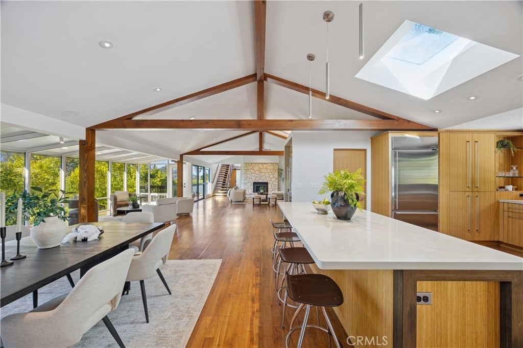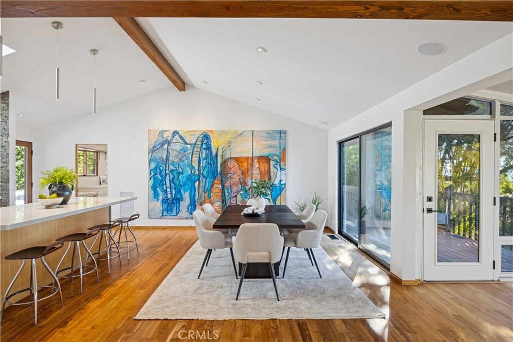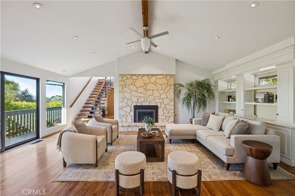 An architecturally refined mid-century modern home where clean lines, expansive glass, and thoughtful updates define 5 bedrooms, 3.5 baths, and approximately 3,663 square feet of light-filled living space on a generous 12,600± square foot lot, ideally located at the end of a quiet cul-de-sac within the highly sought-after Sinsheimer School District. Sweeping views of Cerro San Luis and Bishop’s Peak are integral to the home’s design, creating a dramatic and ever-changing backdrop. A bright, open floor plan highlights walnut hardwood flooring and expansive floor-to-ceiling windows that frame the surrounding landscape and invite the outdoors in. The living room is anchored by a statement fireplace with a stone hearth and flows seamlessly into the dining area and enclosed patio—an inviting setting for both everyday living and entertaining with iconic views. The modern kitchen pairs form and function with a generous center island and bar seating, state-of-the-art appliances, and a walk-in pantry. One wing of the home offers three bedrooms with direct access to a rear deck and a full bath, while the opposite wing includes an additional bedroom and full bath with access to a private patio—ideal for guests, flexible living, or a home office. A powder room near the entry is seamlessly integrated into the home’s efficient layout. Upstairs, the primary suite serves as a serene retreat, featuring a spacious view deck, gas fireplace, and a spa-inspired en-suite bath with a standalone soaking tub and separate walk-in shower. The professionally landscaped grounds extend the home’s architectural aesthetic outdoors, with a tranquil fountain and fish pond, multiple outdoor seating areas, and ample space for gardening and entertaining. An exceptional expression of mid-century modern design, where thoughtful updates, panoramic views, and a coveted location come together with effortless sophistication.