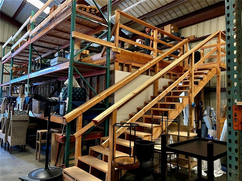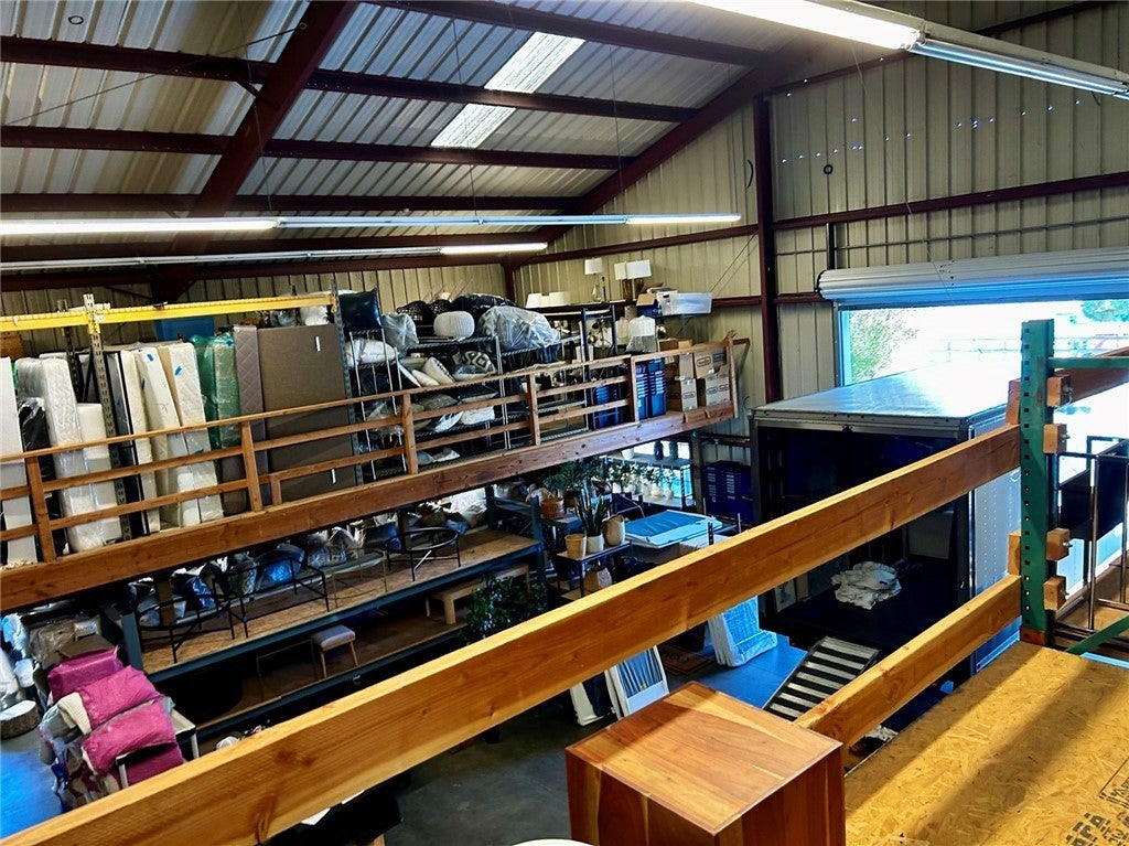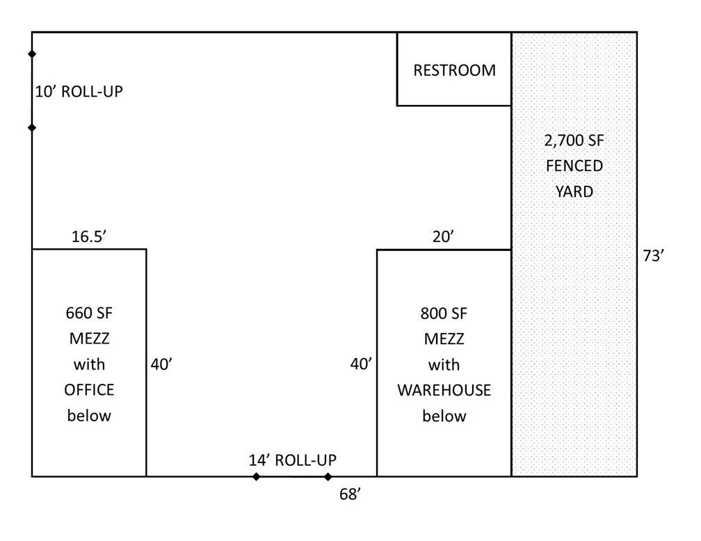 A warehouse with a 28 foot clear height at the apex, two mezzanines, a 660 square foot office, a 14 foot roll-up door, and a secure, fenced 2,700 square foot yard.