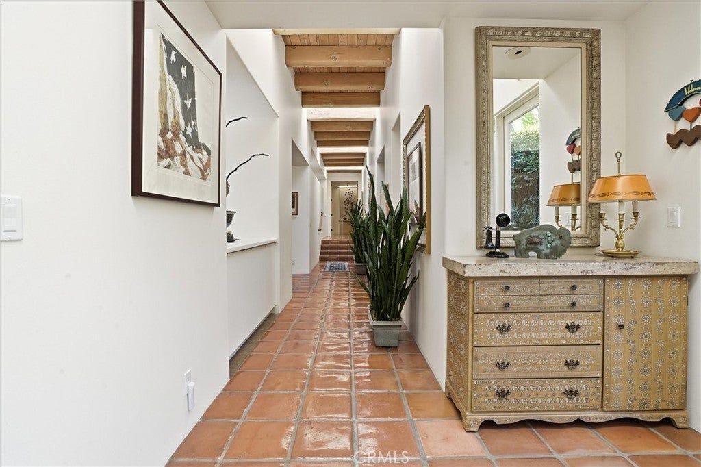 Experience timeless Montecito-inspired elegance in this beautifully crafted custom home. From the moment you arrive, the home’s architectural character stands out. A private courtyard entrance, tall arched front door, and dramatic, playful entry sequence set the tone. Step inside and be greeted by a Zen-like atrium with a spectacular waterfall feature, creating an immediate sense of calm and sophistication. Throughout the home, high ceilings with exposed wood beams, smooth stucco walls, and polished Saltillo tile floors enhance the warm, authentic style. The luxurious primary wing offers exceptional privacy, beginning with a beautiful office featuring custom built-ins. The expansive primary suite includes a serene sitting area, fireplace, and spa-like full bathroom with two separate vanity areas. The two guest ensuites are thoughtfully designed at the opposite end of the home, ideal for privacy and comfort—one of which currently serves as a perfect den. The living room and formal dining room combine into one expansive, inviting space, centered around a striking fireplace flanked by French doors and large picture windows. The sun-filled kitchen is both stylish and functional, offering a large center island, Sub-Zero refrigerator, and 6-burner Thermador range. The adjoining breakfast area, complete with its own fireplace and French doors, opens to a lovely patio—perfect for morning coffee or relaxed al fresco dining. Enjoy lower utility costs with the home’s owner-owned solar system, a valuable upgrade that provides efficient, eco-friendly power. Rich architectural detail, elegant indoor–outdoor flow, and a uniquely serene atmosphere make this home a one-of-a-kind offering.