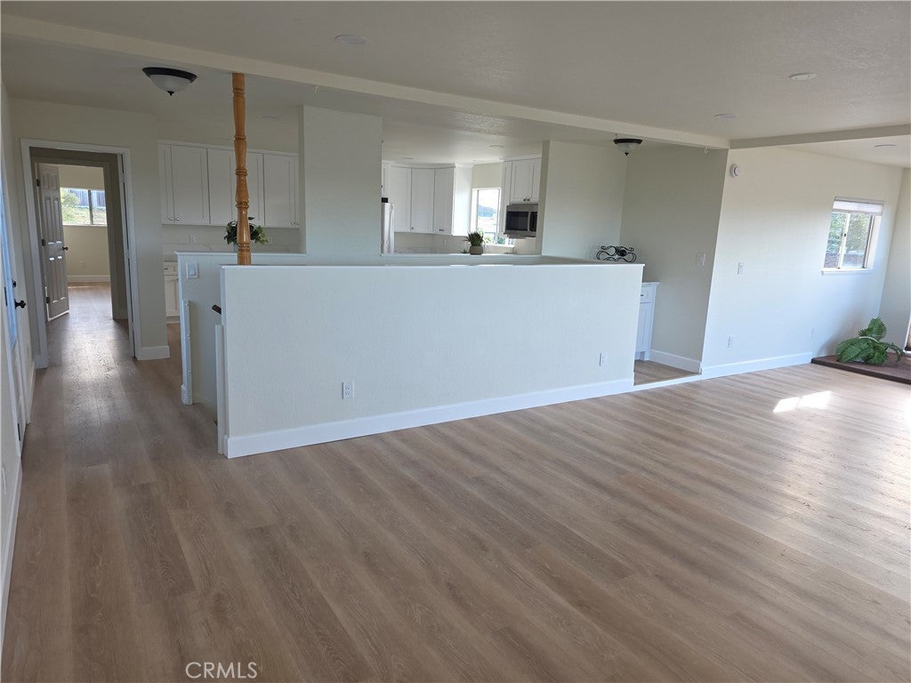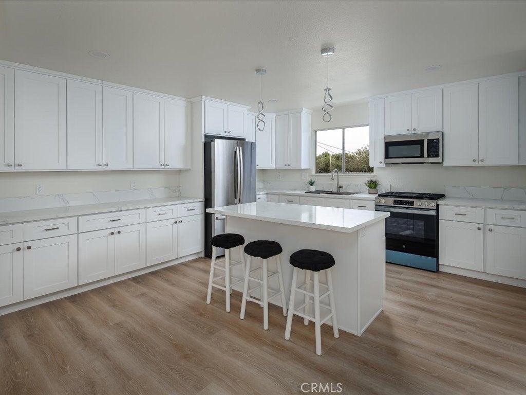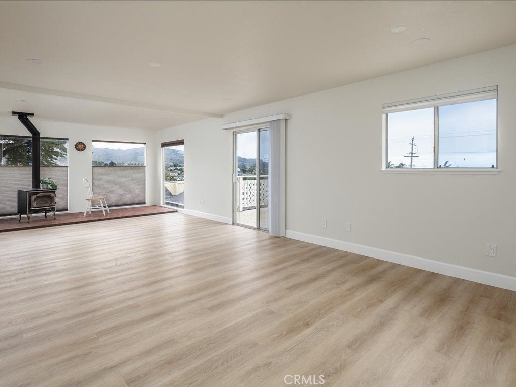 This 2 story home has great views of mountains to the S/W, the bay, sand dunes, and peaks of the ocean. Up stairs you find a large living room with views, a franklin stove, the primary bedroom & bath, and a beautiful new spacious kitchen with shaker cabinets and self closing doors and drawers, quartz countertops, and recessed lighting. The interior of the home has just been painted and new baseboards added. New vinyl plank flooring has been installed in the entryway, stairs, living room, kitchen, and primary bedroom. The sliding glass door in the living room leads you to an 8' x 26' deck to watch those beautiful sunsets and enjoy outdoor living. Downstairs you'll find two more bedrooms that share the Jack & Jill 3/4 bath and a 3rd bathroom. In the front of the home there's room to park 5-6 cars off the street. The front yard has a small deck, a fig tree, fenced in area for fido or a garden and a large decorative avocado tree. Motion sensor lighting greats you at night from the driveway up to the front door. There's a great shed/workshop in the back yard with skylights and electricity. Wiring already installed in the back patio for your hot tub. Lots of great storage along the north side of the house. Originally the home was built with a 2 car garage. One side has been sectioned off with a small closet so you can create a 4th bedroom, exercise room, office, game room for the kids or take out a wall and return it to a 2nd car garage.
