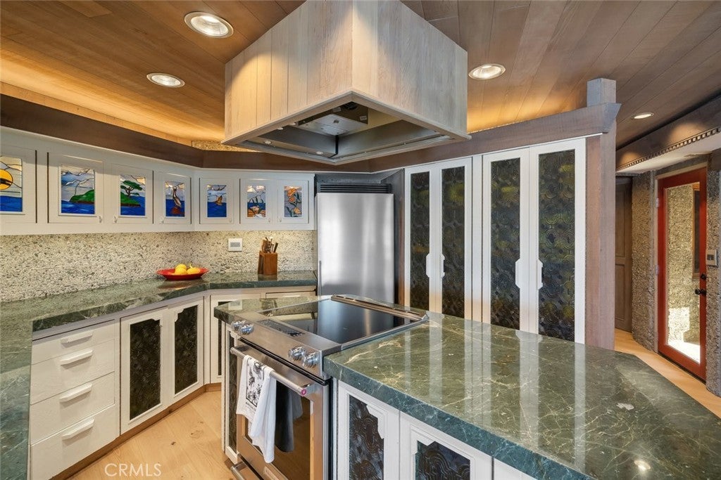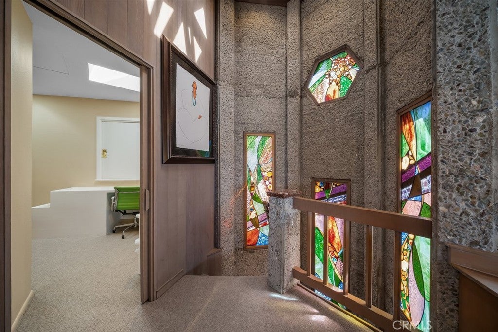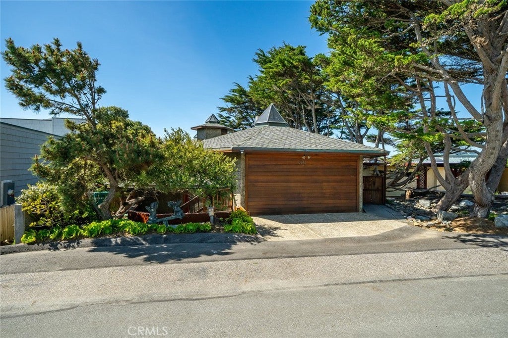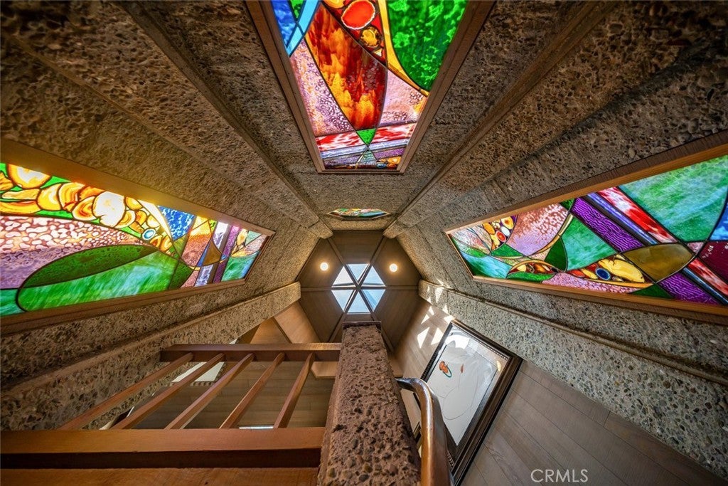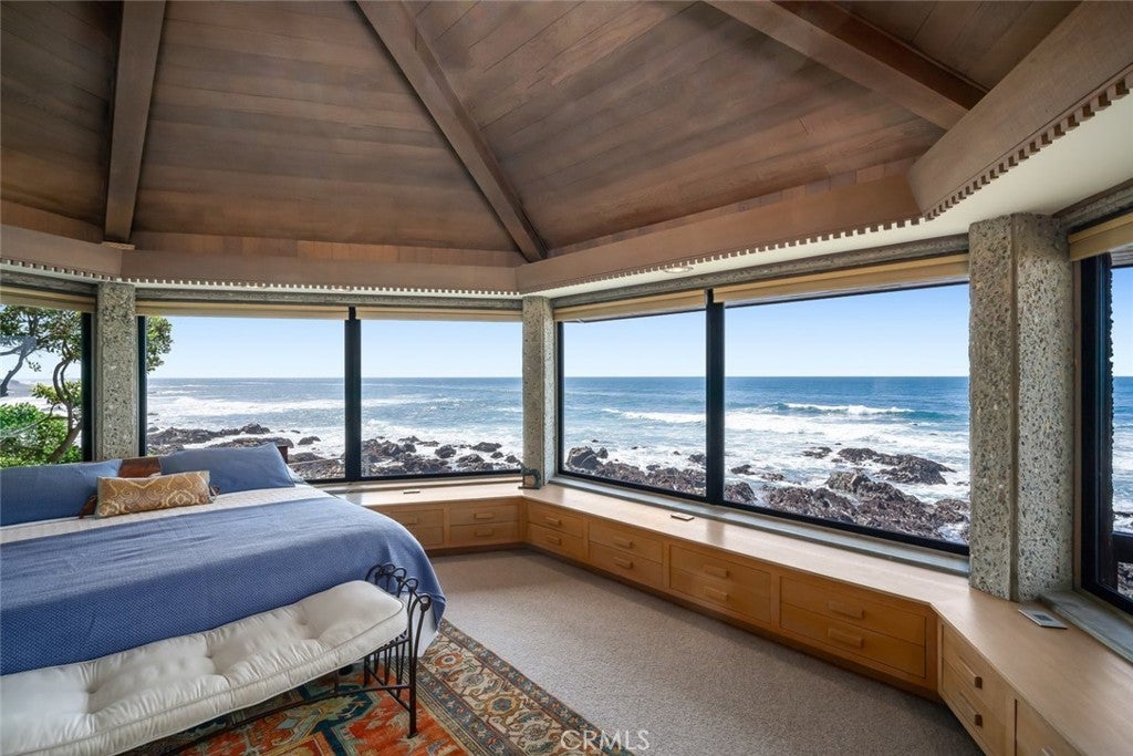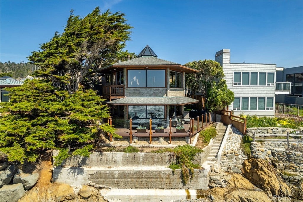 Exceptional Value per Square Foot for Oceanfront Living! This rare architectural masterpiece was designed by legendary local architect Warren Leopold, a protégé of Frank Lloyd Wright. Built at the height of mid-century modernism, this iconic Big Sur Modern residence is constructed of poured-in-place aggregate concrete and redwood, expressed in a sophisticated series of hexagonal spaces that celebrate light, geometry, and the natural environment. Set forward on a seawall-protected bluff, the home offers over 180 degrees of unobstructed panoramic ocean views, with daily sightings of whales, dolphins, otters, seabirds, tide pools below, and spectacular sunsets. Thick exposed aggregate walls frame expansive new dual-pane windows and signature stained glass—some inlaid with sliced agate—bringing exceptional light, color, and texture throughout. The open-concept kitchen, dining, and living areas are designed for both comfortable living and effortless entertaining. The chef’s kitchen features top-of-the-line appliances, custom cabinetry, and a generous granite island oriented toward the sea. Redwood beams, whitewashed redwood paneling, slate and stone surfaces, built-in seating, fireplaces, skylights, dentil detailing, and an indoor-outdoor bar enhance both function and character. A protected ocean-view courtyard and wraparound decks with new glass railings extend the living space outdoors, while private concrete stairs provide rare direct access to the shoreline and tide pools. The home includes three en-suite bedrooms. The primary suite is accessed by a dramatic primary suite accessed via a stained-glass-lined turret staircase, featuring wraparound windows, domed skylight, fireplace, spa-style bath with ocean-view soaking tub, connected office, and walk-in closet. Downstairs a second en-suite bedroom has own fireplace. A secondary living area with its own living room, laundry, and the third en-suite bedroom with separate entrance adds flexibility and income potential. The property is a successful, permitted vacation rental. Located among Monterey cypress, close to Fiscalini Ranch Preserve, Moonstone Beach, Lampton Cliffs County Park, and the West Village of Cambria, this one-of-a-kind home offers architectural significance, privacy, and an unparalleled connection to the Pacific Ocean.