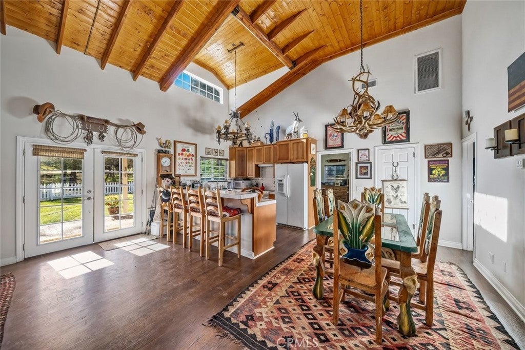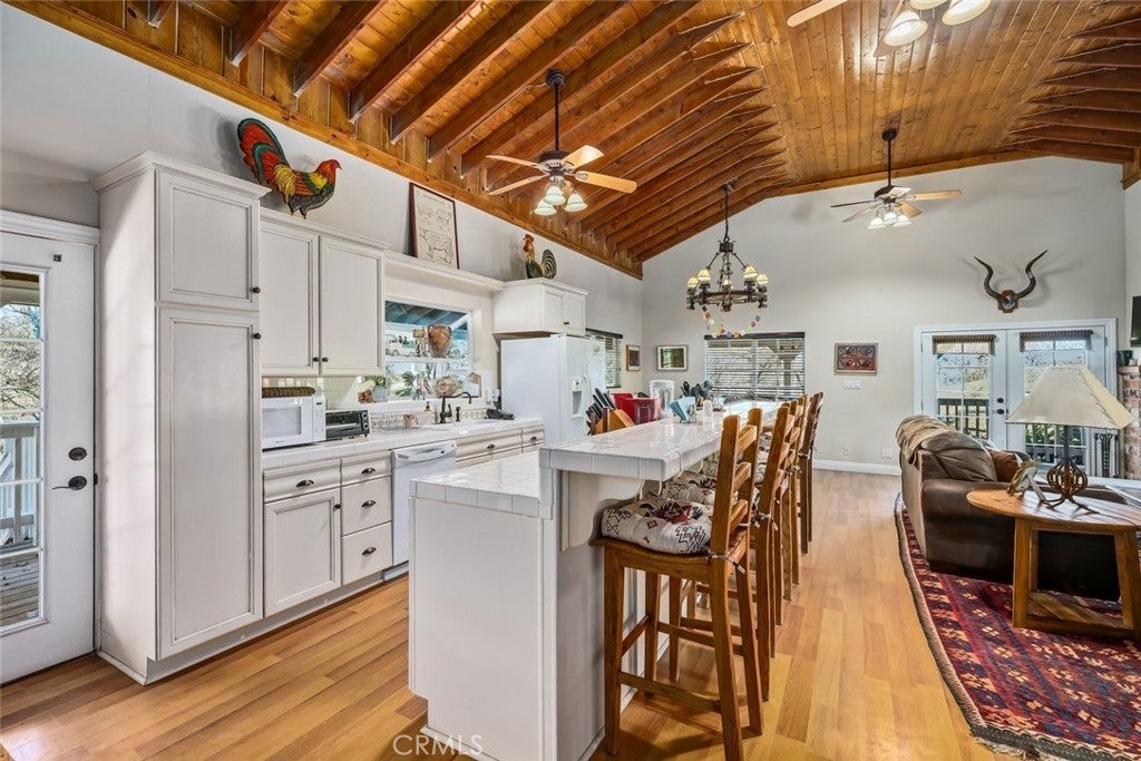 - Interior FeaturesBeamed Ceilings, Breakfast Bar, Breakfast Area, Ceiling Fan(s), Cathedral Ceiling(s), High Ceilings, Open Floorplan, Pantry, Storage, Tile Counters, Two Story Ceilings, All Bedrooms Down, Entrance Foyer, Jack and Jill Bath, Multiple Primary Suites, Primary Suite, Workshop, Wood Product Walls
