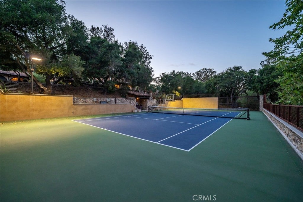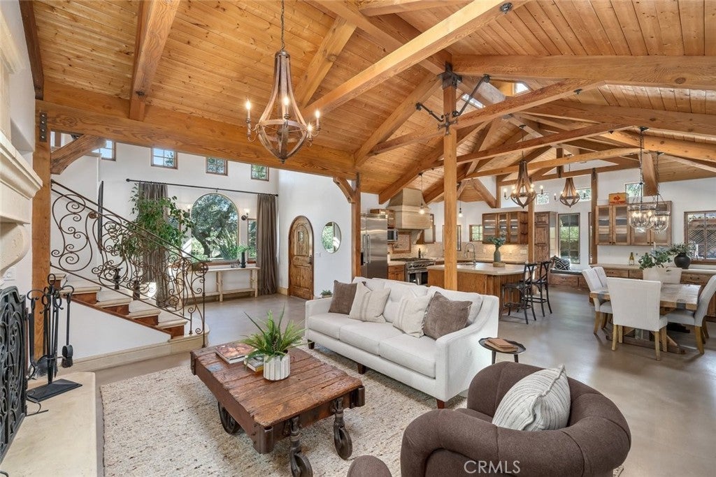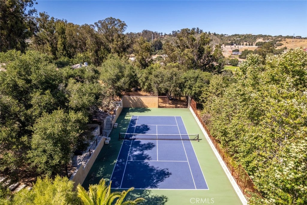 A tennis enthusiast's dream! This extraordinary estate showcases exceptional craftsmanship, striking stonework, and thoughtfully designed amenities that seamlessly blend luxury with lifestyle. A stone-lined driveway welcomes you to a spacious motor court featuring a detached five-car garage and covered carport—perfect for RVs, trailers, or additional equipment. Low stone walls and manicured hedges guide you toward the main residence, while just beyond the garage a covered patio and workshop overlook a stunning central courtyard. Here you’ll find an outdoor kitchen, wood-fired pizza oven, built-in firewood storage, and a dramatic stone fireplace that creates a warm and inviting gathering space. From the front lawn a pathway leads to a professional-grade multi-sport tennis and pickleball court complete with night lighting, viewing areas, a swing-out basketball hoop, and bar seating—an ideal setup for both serious play and social gatherings. In the backyard, a built-in hot tub and cozy firepit offer the perfect setting for relaxing evenings under the stars. Inside, the home is airy and inviting, highlighted by soaring beamed ceilings, decorative windows, and custom wood-and-metal chandeliers. Concrete floors provide natural cooling, while a dramatic floor-to-ceiling stone fireplace anchors the main living area. Just off the living room, a private office and half bath. The chef’s kitchen features a gas range with custom hood, oversized Viking refrigerator, expansive center island with prep sink and seating, walk-in pantry, beverage center, and an open dining area . A charming walk-through mudroom with built-in storage and courtyard views connects seamlessly to the outdoor living spaces. The main-level primary suite offers a peaceful escape with a spacious walk-in closet and spa-like bath featuring dual sinks, a walk-in shower, soaking tub, and large sliding doors that open to the front yard and hillside views. A cozy bonus room with fireplace opens to the backyard, while barn doors reveal a spacious laundry center with storage and folding counter. Upstairs, a sitting area opens to two additional bedrooms, each featuring private ensuite baths. Additional highlights include a detached guest studio with full bath, storage barn, raised garden beds, and pastureland. Crafted with remarkable attention to detail, this one-of-a-kind estate is designed for a seamless indoor-outdoor lifestyle and is a must see!