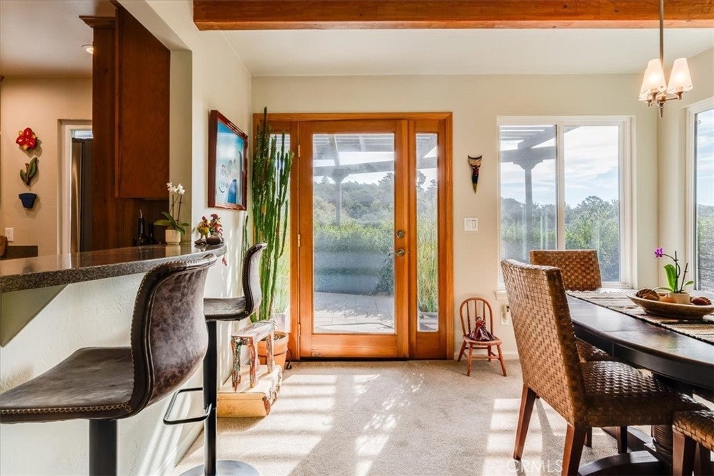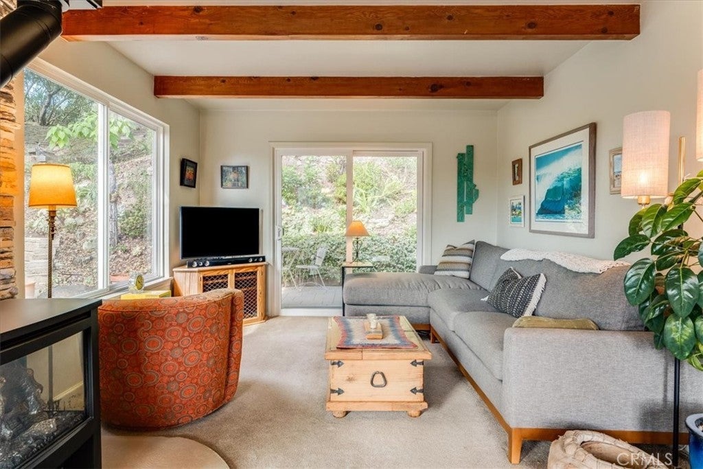 Tucked away at the end of Corralitos Drive on a private, oak-studded acre, this beautifully updated Arroyo Grande home offers peaceful Central Coast living just minutes from the Village of Arroyo Grande, San Luis Obispo, several local wineries, Lopez Lake, and the coast. This thoughtfully designed home features exposed beam ceilings, abundant natural light, and inviting living spaces that open to the outdoors. The main living area is centered around a freestanding fireplace set against a natural stone wall, creating a focal point that feels both refined and welcoming. A beautifully updated kitchen offers rich custom cabinetry and bar seating, while the spacious bath includes dual sinks and a walk-in shower with two shower heads. The grounds include mature trees, refreshed landscaping, multiple patios, and a detached shed with a finished wine room. Recent upgrades include a newer roof, solar panels, an upgraded propane heater and electrical panel, key water system improvements, and a 30-amp/50-amp service for EV charging or added flexibility. Don’t miss this rare opportunity to own a truly special property that offers privacy, a strong connection to nature, and a peaceful lifestyle in a highly sought-after area of the Central Coast!