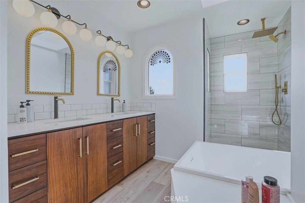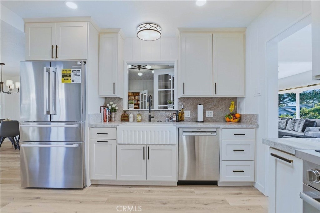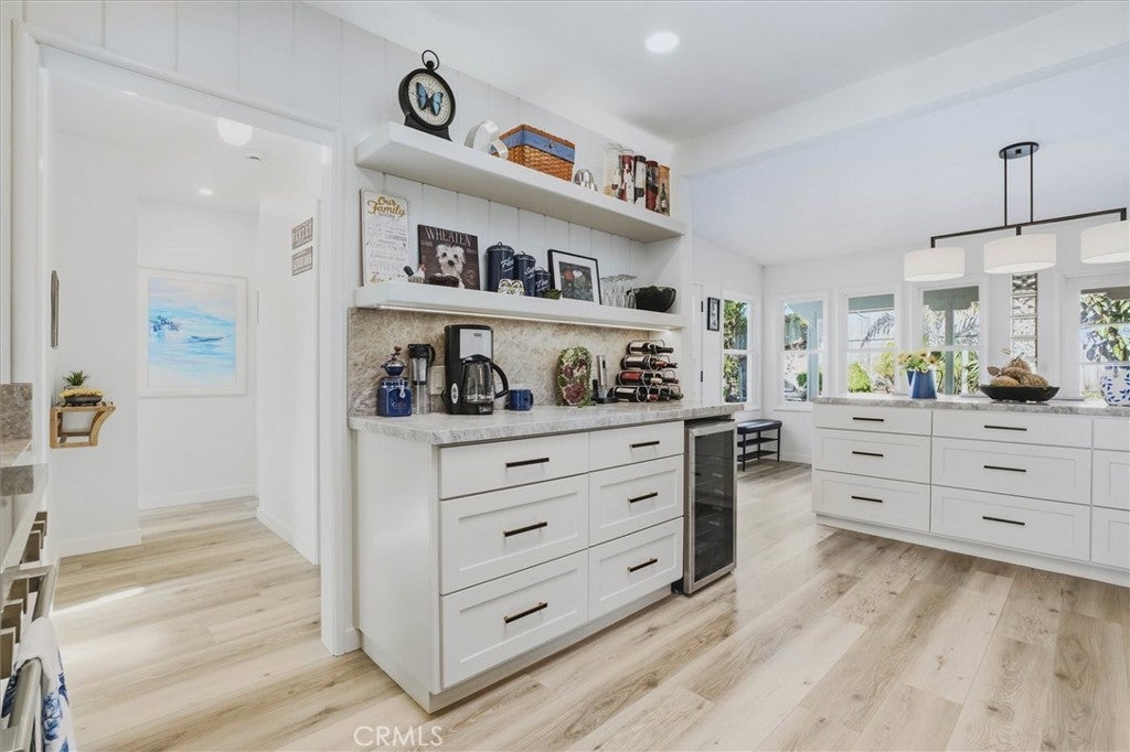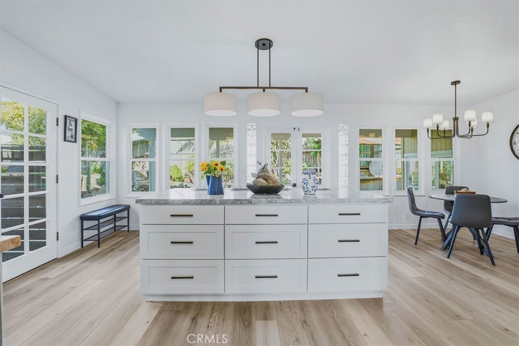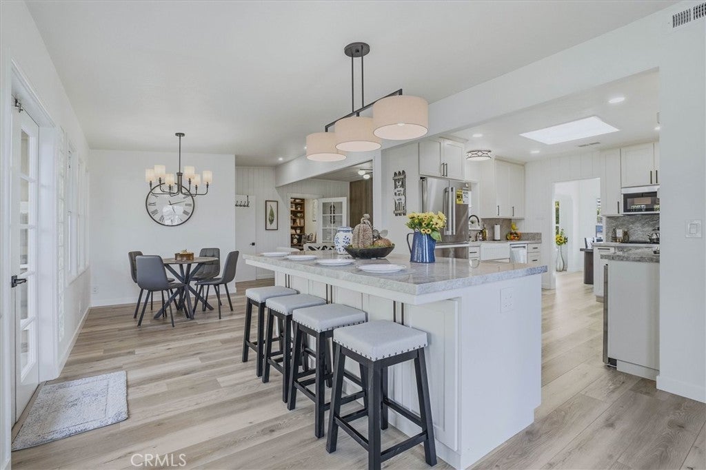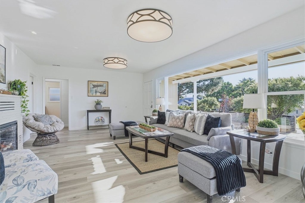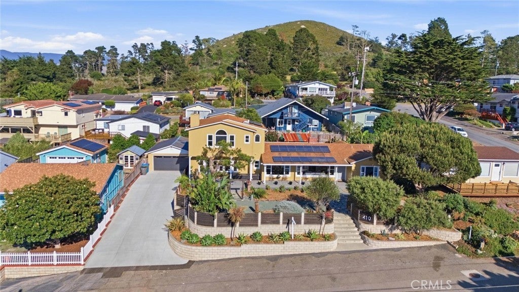 410 Kings Ave features 5 bedrooms and 4 baths, over 3,000sf in the high-end Morro Heights neighborhood. Four bedrooms on the main level, including a primary ensuite with a separate entrance, and second primary retreat upstairs complete with super luxurious extra-deep Japanese-style soaking tub. This home has been updated from top to bottom in the popular Modern Farmhouse style, blending seamlessly with preserved original character and high-end upgrades throughout. New flooring, lighting, Milgard windows, plumbing, and electrical create a fresh, move-in ready home. The kitchen combines style and function with custom Mastercraft cabinetry, a full Bosch appliance suite, huge island with Taj Mahal Quartzite counters throughout, and a skylight that fills the space with amazing natural light, opening into the breakfast nook for casual dining and easy flow. Additional spaces include a den, separate office, and living room, along with new electric fireplaces in the living room and two bedrooms. Views of Morro Rock, the ocean, and surrounding hills, add to the home’s coastal charm. Set on a 10,000 square foot private double lot, the renovated and beautifully landscaped outdoor space features expansive front and back yards, expanded covered front deck, a new driveway, and stunning backyard water feature and tiki bar, perfect for gatherings. A detached two car garage provides ample room for parking, storage, or hobbies. The home is equipped with owned-solar for super low to non-existent electric bills and the downstairs primary with its own private entrance would make a perfect rental. Located just minutes from the beach, trails, and downtown Morro Bay, this home offers a rare combination of space, upgrades, and coastal access in one of the area’s most desirable neighborhoods.