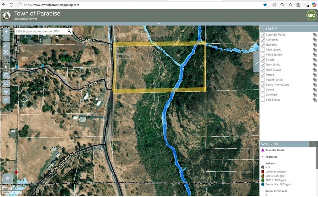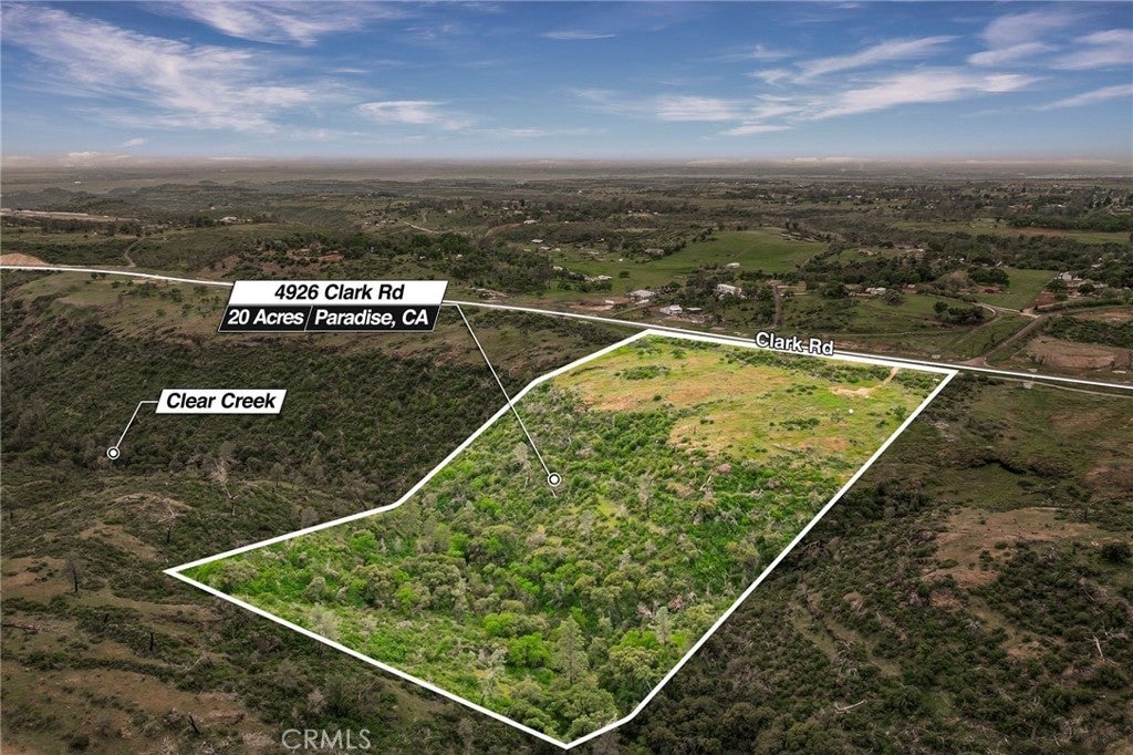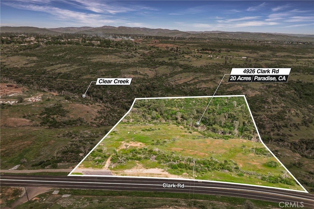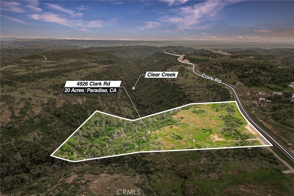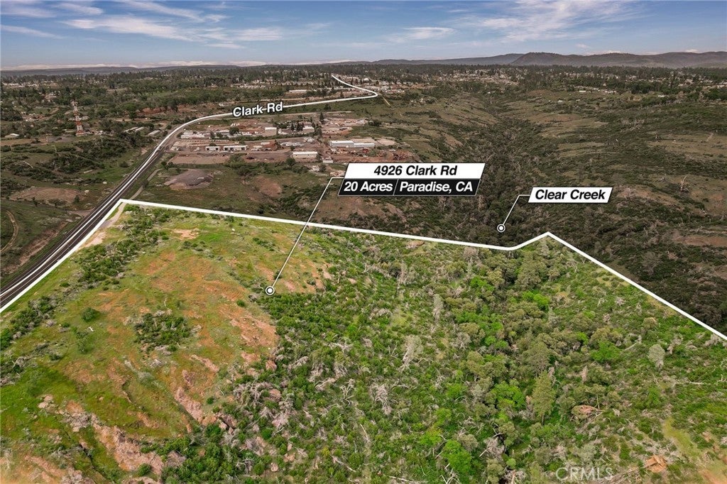 Prime 20-Acre Parcel on Clark Road – Dual Zoning, Canyon Views, and Two Creeks! Discover a rare opportunity to own 20 acres of versatile land located along Clark Road (Highway 191) at the southern edge of Paradise. This exceptional property offers the perfect blend of natural beauty, accessibility, and development potential. With dual zoning—Industrial Services frontage along Clark Road and Agricultural Residential (3-acre minimum) across the remaining acreage—this parcel is ideally suited for a combined home and business site. Previously had a home & septic on site, plus all utilities available at property frontage. Dramatically beautiful terrain transitions into mature vegetation, offering a picturesque setting for a custom estate, agricultural venture, or private retreat. Two creeks & a seasonal waterfall wind through the property, adding to the serene atmosphere and enhancing its natural charm. Panoramic views of the Clear Creek Canyon provide a stunning backdrop, with great southern exposure ideal for solar potential or gardening. Despite its peaceful, private feel, the property is just minutes from downtown Paradise, grocery stores, shopping centers, schools, and key commuter routes including Highway 70. It's also conveniently located near Lake Oroville's north marina and Butte College. Whether you're seeking a unique live-work opportunity, a development project, or simply a slice of tranquil wilderness close to town, this parcel offers incredible value and vision. Don’t miss this rare chance to own a truly special piece of land with a strategic location, natural splendor, and endless potential.