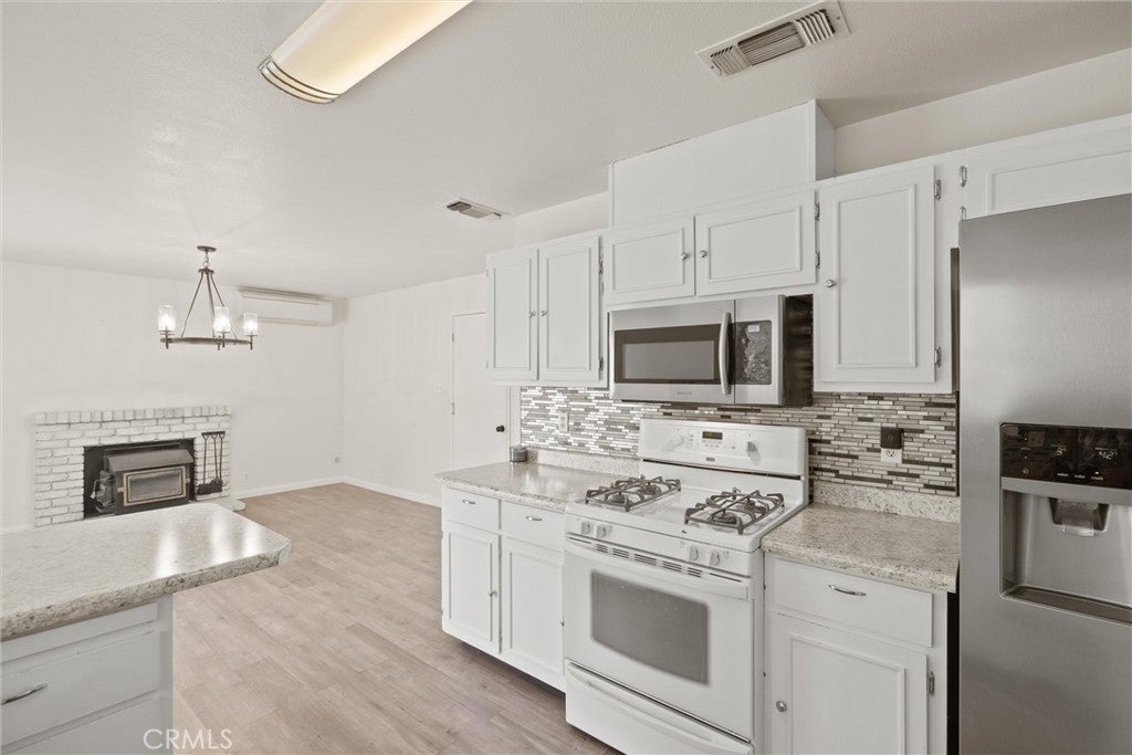 Move-in ready with style and comfort. Step inside this beautifully updated home and be greeted by a soaring vaulted ceiling living room that flows seamlessly into the dining area, perfect for gatherings and everyday living. With two separate living spaces, you’ll have room to spread out. One of them opens directly to the kitchen and features a cozy wood-burning fireplace, making it the heart of the home. The kitchen shines with upgrades, including newer Kitchen countertops and backsplash, large windows looking out to the beautiful backyard. Step outside to a spacious covered patio ideal for entertaining, surrounded by automatic sprinklers, lush landscaping, and a backyard designed for relaxation. This home has been thoughtfully modernized with new LVP flooring throughout, updated bathrooms, central heat and air, plus four mini-splits to individually control each room’s comfort while saving on your electric bill. With all the updates and charm, this property truly is a must-see—move-in ready and waiting for you to call it home.