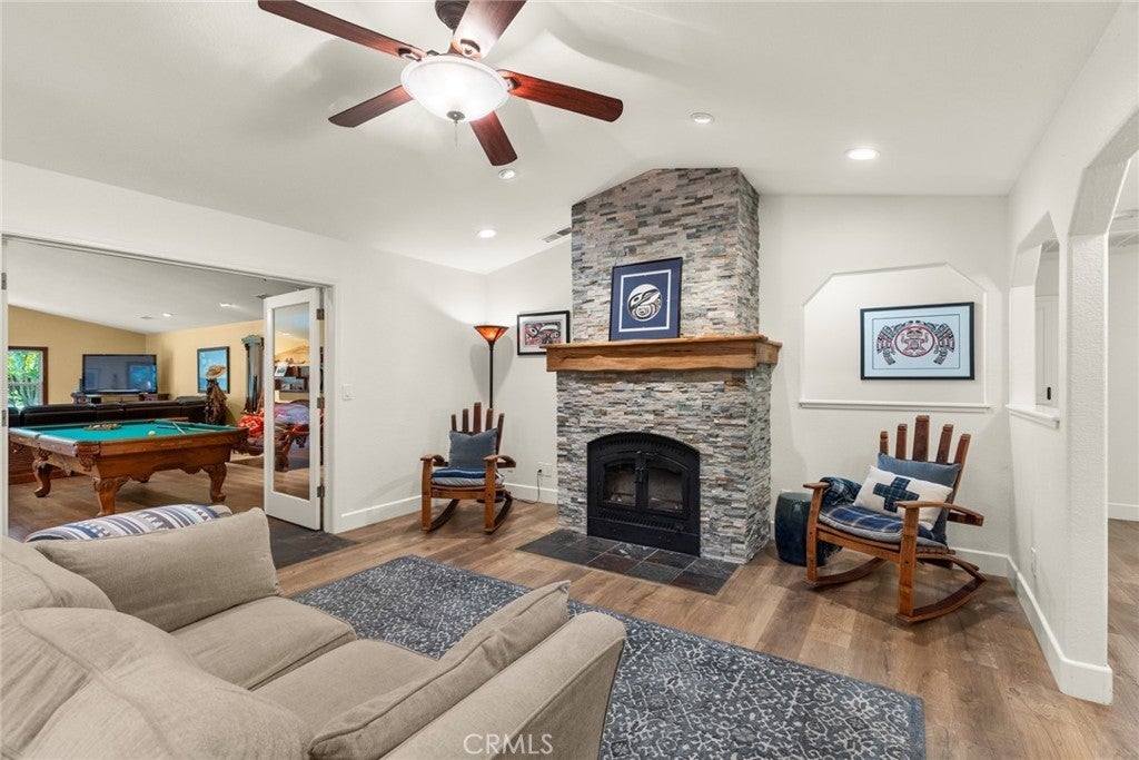 • Interior FeaturesSeparate/Formal Dining Room, Eat-in Kitchen, Pantry, Recessed Lighting, Primary Suite, Walk-In Closet(s), Built-in Features, Cathedral Ceiling(s), Ceiling Fan(s), Pull Down Attic Stairs, Wet Bar, Workshop