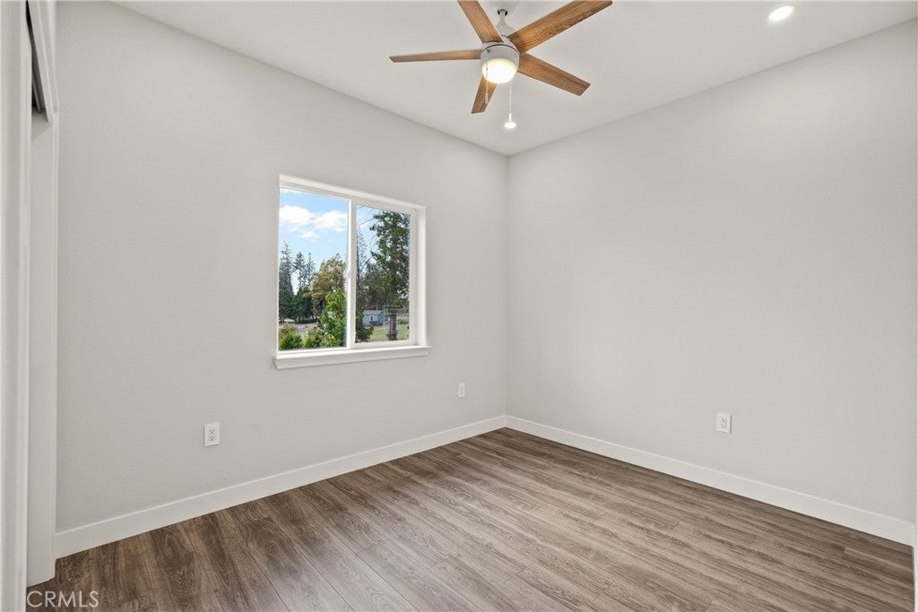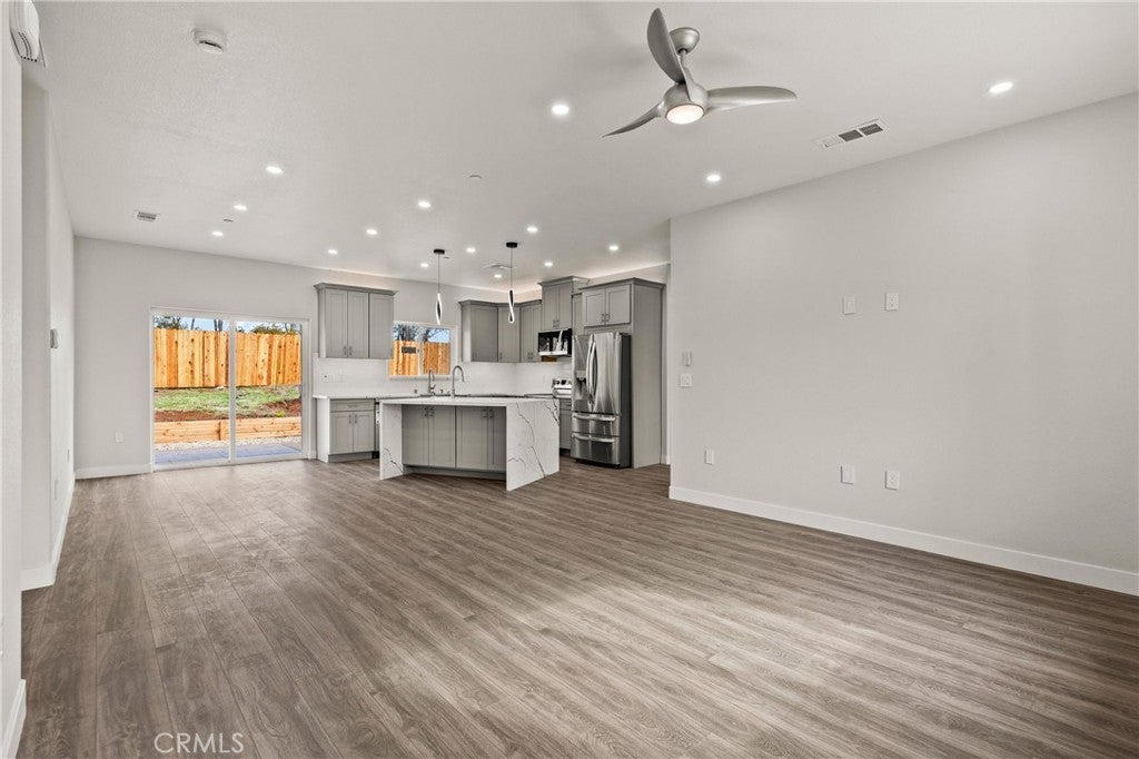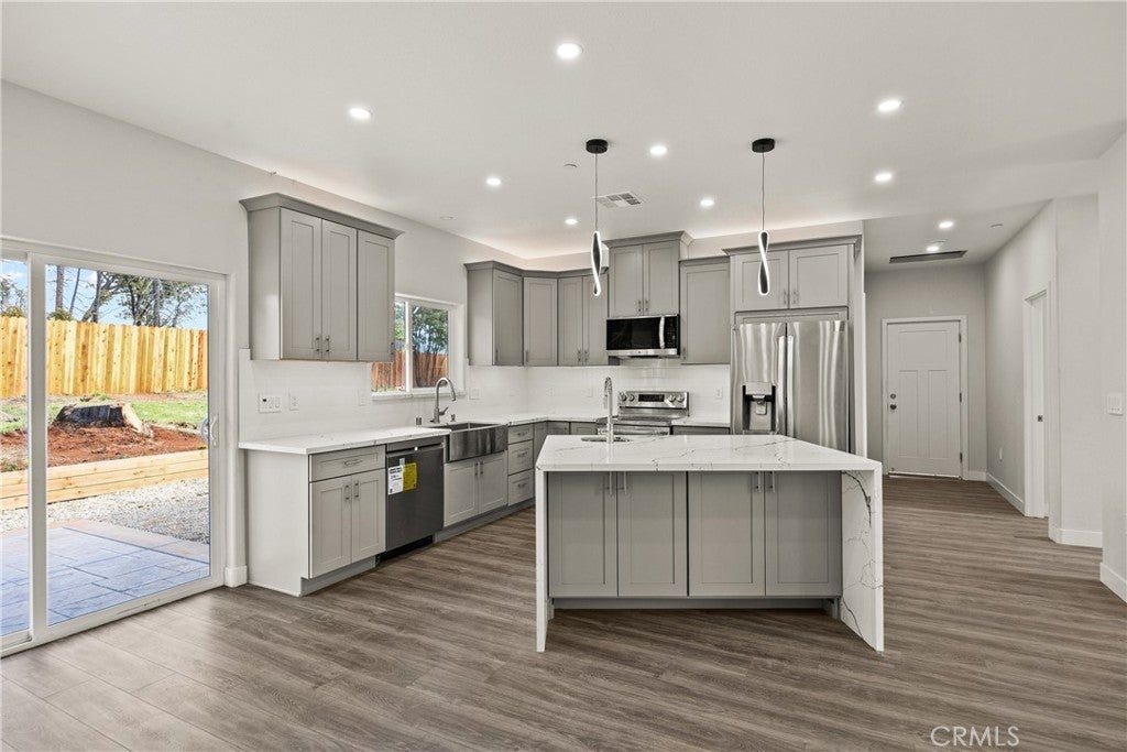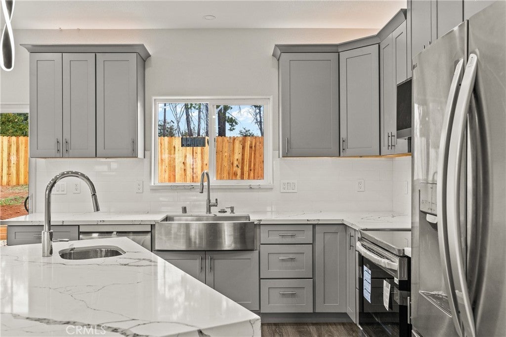 Brand new construction featuring 4 bedrooms and OWNED SOLAR and a view of Sawmill Peak! Located conveniently in lower Magalia with quick access to local amenities and Skyway Rd, this is one you won't want to miss. The open floor plan showcases the beautiful kitchen which offers a waterfall island with quartz countertops, LG stainless steel appliances, an additional prep sink, tiled backsplash, modern pendant lights and a farmhouse sink. Off the kitchen and dining area is a slider leading to the back patio. There are 2 guestrooms at one end of the home, along with the guest bathroom and hall storage. At the other end of the home is an additional bedroom/office/den and primary bedroom. The primary bedroom let's in tons of natural light with the sliding glass door that leads to the backyard, as well as an attached bathroom with a tiled shower. Additional features include a 2 car garage, fully fenced yard, landscaping, RV parking, stamped concrete, and dimmer switches on all the recessed lighting.