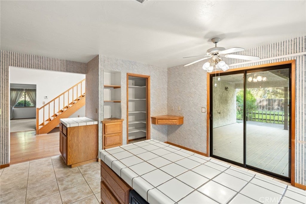• Interior FeaturesBuilt-in Features, Ceiling Fan(s), Cathedral Ceiling(s), Eat-in Kitchen, High Ceilings, Tile Counters, Main Level Primary, Walk-In Closet(s)