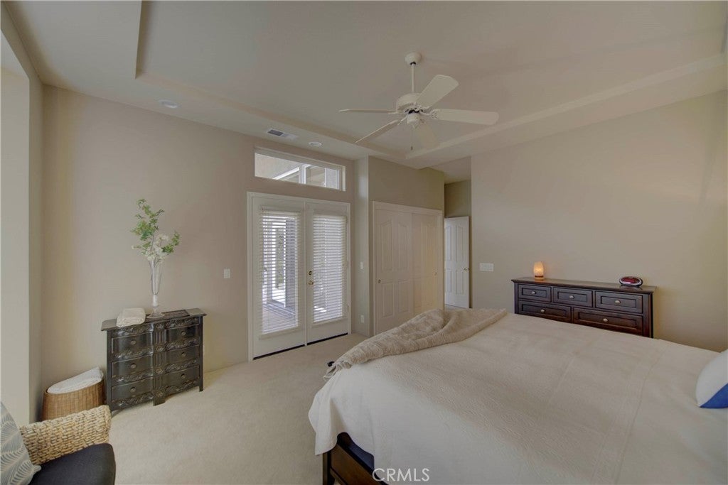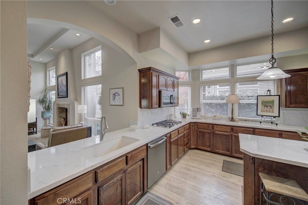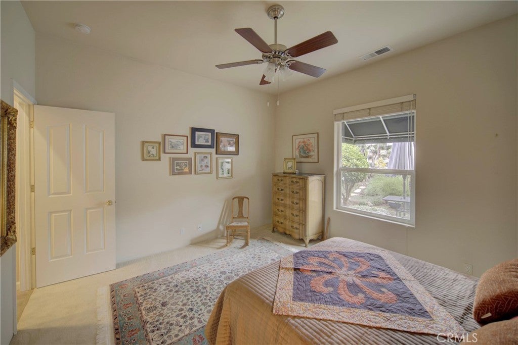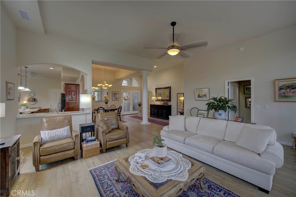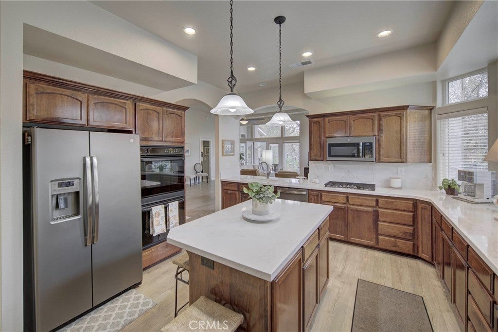 Welcome to 732 Serrano Ct — Your Canyon Oaks retreat! Nestled in the prestigious gated community of Canyon Oaks this stunning home sits within the desirable Arroyo Greens subdivision. From the moment you arrive, you’ll appreciate the high-end, low-maintenance landscaping, thoughtfully designed with lavender, butterfly bushes, maples, and citrus trees. A charming covered arbor beautifully frames the front entrance, setting the tone for the elegance inside. Step through the front door and you’re greeted by soaring ceilings, newer vinyl plank flooring, and a bright, open floor plan that seamlessly connects the living room, dining area, and kitchen. The great room features a cozy gas fireplace and floor-to-ceiling windows that fill the space with natural light and views of the lush outdoors. The chef’s kitchen is as stylish as it is functional, showcasing white quartz countertops, rich cherry cabinetry, GE appliances, double ovens, an island, and a five-burner gas stove with a micro-hood—perfect for hosting or everyday cooking. The primary suite is your private sanctuary, complete with cathedral ceilings, dual closets (including a walk-in), and French doors that open to the serene backyard. The en suite bathroom offers dual sinks, a soaking tub, and a tiled walk-in shower—the ideal space to unwind. On the opposite wing, you’ll find two spacious guest bedrooms and a full bathroom, providing comfort and privacy for family or guests. Step outside through one of the three sets of French doors to a covered patio overlooking a seasonal creek and the Canyon Oaks golf course. The meticulously landscaped yard offers a peaceful setting for morning coffee, evening wine, or entertaining friends—all with breathtaking sunset views. Additional highlights include a two-car attached garage with an insulated door and owned solar (installed in 2022) that covers all your energy needs. It’s time to experience the relaxed luxury of country club living at Canyon Oaks—where every day feels like a getaway.
