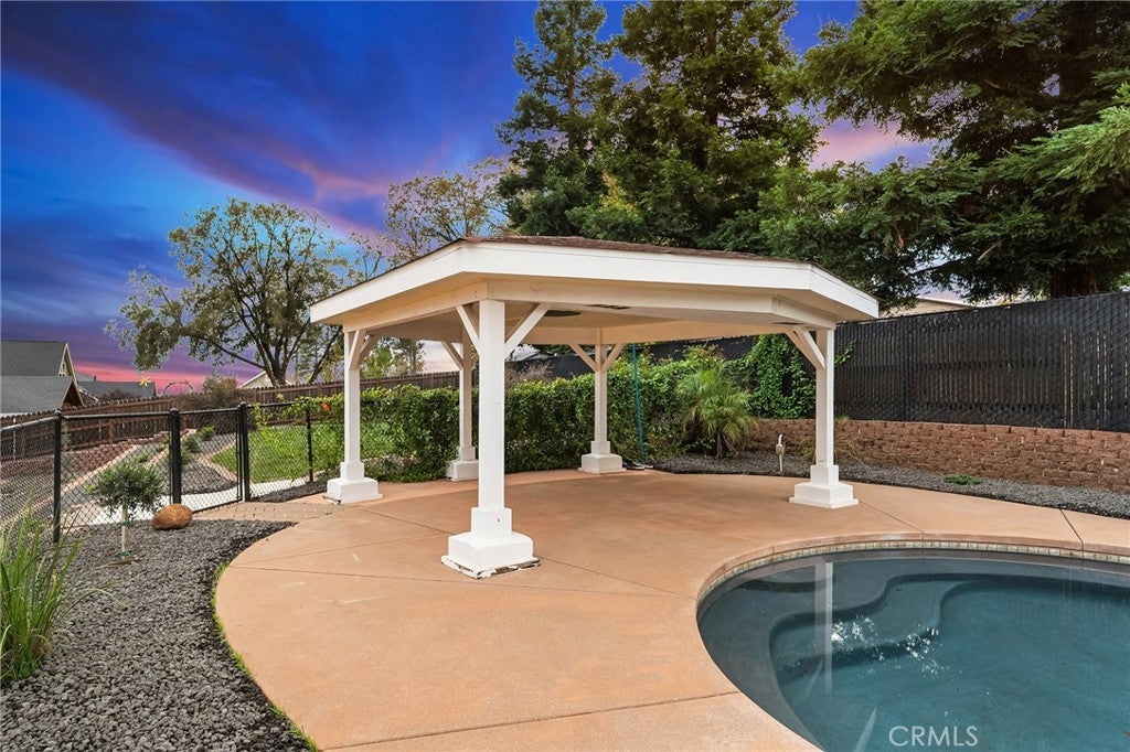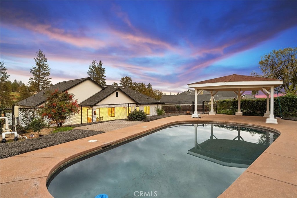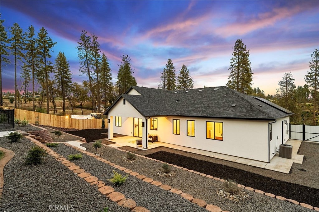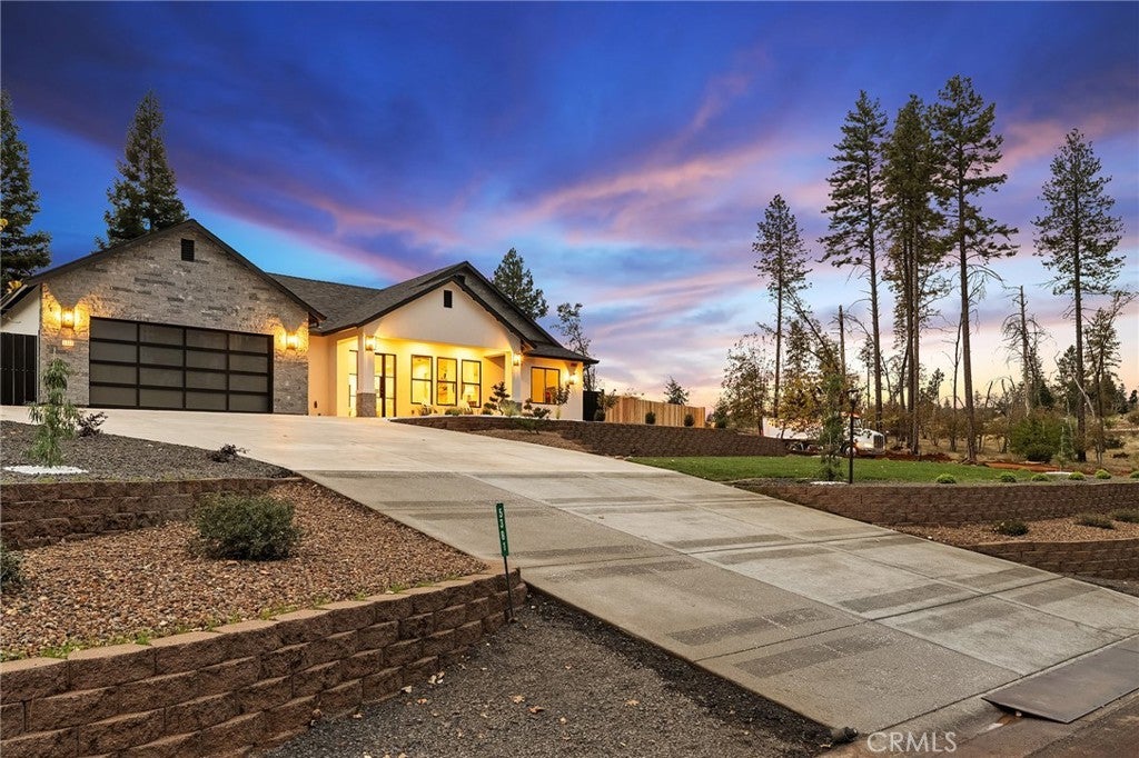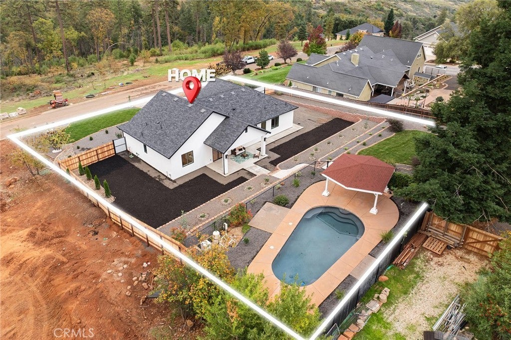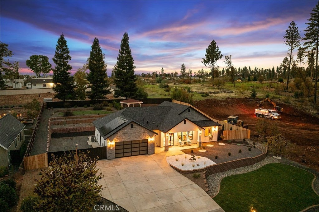 As you arrive at this newly built home with owned solar, the first thing you’ll notice is its serene setting—perched above Dry Creek Canyon with peaceful views of mature trees that frame the landscape. The approach to the home is impressive, with a wide concrete driveway offering generous parking, including dedicated RV access, and a beautifully designed front yard. Carefully crafted retaining walls define each landscape element—lush lawn, decorative rock beds, shrubs, and architectural plantings—creating a clean, modern curb appeal that complements the home’s striking façade. A large glass entry door welcomes you inside, where the open-concept design immediately expands before you. The kitchen, dining, and living areas blend seamlessly, filled with natural light from the expansive windows overlooking the backyard. The chef’s kitchen is both stylish and highly functional, centered around a substantial island perfect for gathering. Warm wood cabinetry pairs beautifully with modern neutral wall tones, while premium appliances include a double oven—one doubling as a microwave—a sleek cooktop with a pot filler, and a farmhouse sink positioned perfectly beneath a window with views of the pool and landscaped yard. Just off the main living area, the primary suite provides a peaceful retreat. The large bedroom offers privacy and comfort, while the luxurious en-suite bath features a standalone soaking tub, a glass-enclosed shower, and dual sinks—all finished in a fresh, modern aesthetic. Stepping into the backyard, you’ll find a fully landscaped oasis designed for relaxation and entertaining. Thoughtful plantings, clean hardscape, and an inviting pool create a private outdoor environment ideal for enjoying warm evenings or hosting gatherings. This is a rare opportunity to own a brand-new custom home thoughtfully placed among nature, featuring modern amenities, timeless design, and an exceptional indoor-outdoor living experience.