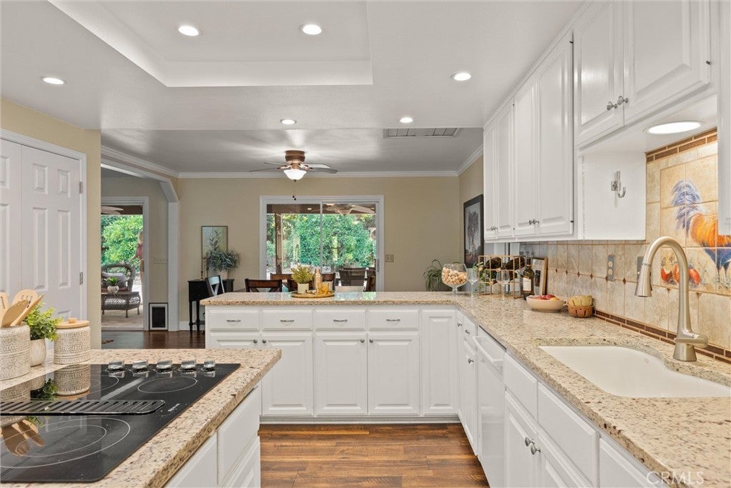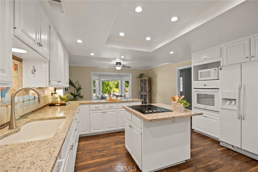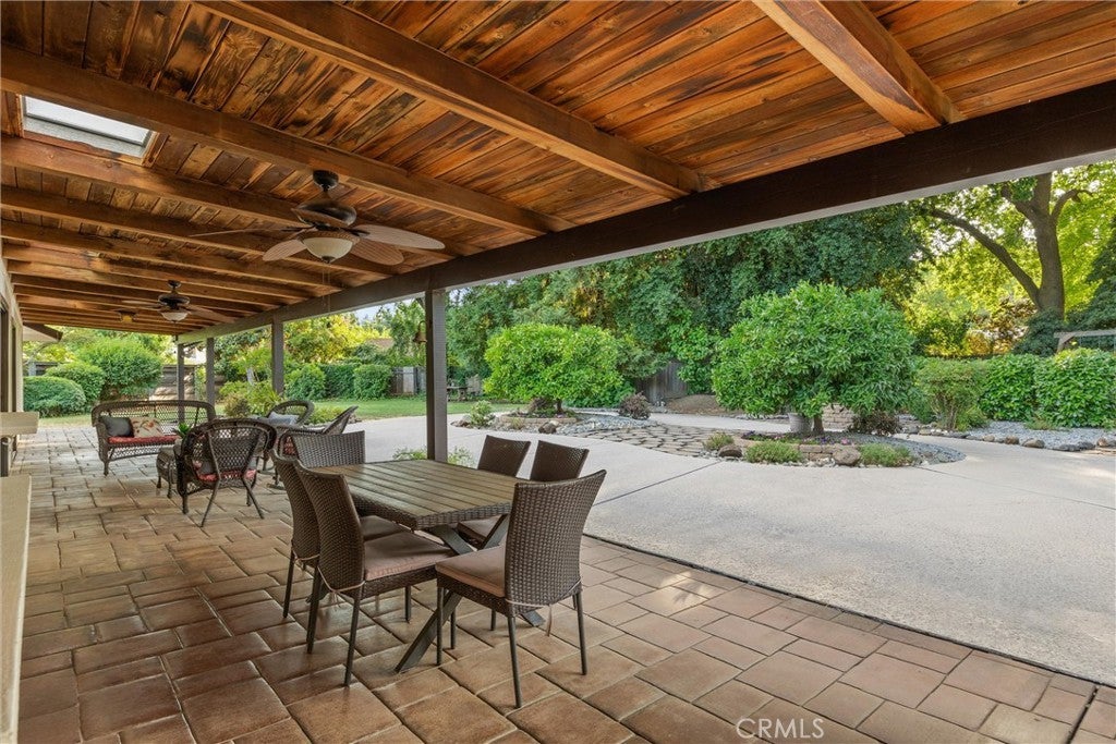 Tucked at the end of a quiet cul-de-sac, this beautifully maintained 3-bedroom, 2.5-bath home (plus office/flex room) offers incredible privacy on a spacious .49-acre lot surrounded by mature shade trees and beautiful landscaping. Inside, the bright and spacious living room features tray ceilings, a beautifully tiled fireplace ready for a wood stove, and large sliding glass doors that overlook the incredible backyard. The large dining area flows right into the kitchen, which offers all the space you’ve been hoping for—granite countertops, an island, lots of counter space with a generous peninsula countertop, white oak cabinets, recessed lighting, sky tubes, a wall oven, Jenn-Air cooktop, Bosch quiet dishwasher, and a charming breakfast nook with a window seat perfect for morning coffee. It has it all! All the bedrooms have brand-new carpet, and both full bathrooms are beautifully updated with double vanities, tiled finishes, and great storage. The primary suite is extra spacious, featuring two closets (including a walk-in), a gorgeous updated en-suite bathroom, and private slider access to the backyard. On the opposite side of the home, the bonus room is a fantastic flex space—ideal as a home office, hobby room, or even a potential 4th bedroom—and includes its own half bath plus exterior access. The backyard is truly a highlight. The 80' x 12' covered porch with stamped concrete, skylights, and outdoor ceiling fans creates the perfect year-round outdoor living space. The expansive yard offers mature oak and redwood trees, a swing set, fire pit, fruit trees (lemon, orange, apricot, grapefruit), a shed, RV hookup and lush landscaping. A newly added partial fence enhances privacy while you enjoy this incredible outdoor space. Additional upgrades include owned solar, upgraded windows, newer exterior paint, a 1-year-old AC condenser, whole house fan, instant hot water, easy attic access for storage, and a fully fenced property with two gates. With its spacious layout, thoughtful updates, and a beautiful outdoor space, this Misty Way home is truly special.