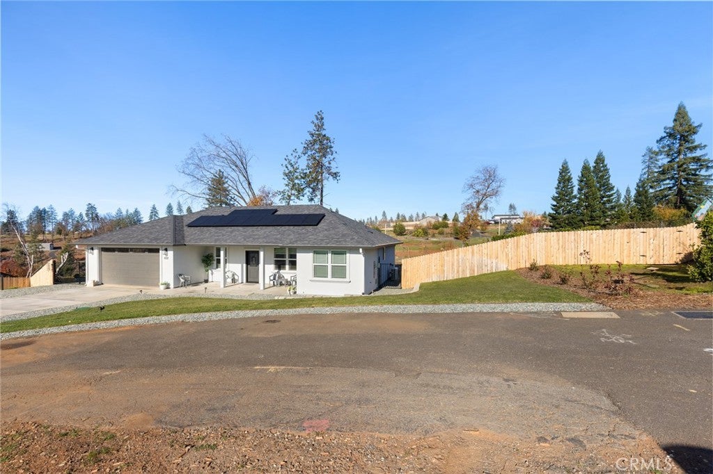 Welcome to this beautifully maintained, nearly new home built in July 2025, located in the charming town of Paradise. Ideally situated, this property offers quick access to Raley’s shopping center in Chico—just a 15-minute drive—and is only minutes from the picturesque Billie Park. Step inside to an inviting open floor plan where the living room seamlessly flows into the dining area and kitchen. The kitchen features granite countertops, an eating bar, pantry, refrigerator, electric stove/oven, and dishwasher—perfect for both everyday living and entertaining. Both bathrooms also showcase matching granite countertops for a cohesive, upscale feel. This home is truly move-in ready, equipped with all-electric appliances, indoor laundry with washer and dryer included, and efficient mini-split systems for heating and cooling. Additional upgrades include fully owned solar, a fire sprinkler system, and a beautifully landscaped yard complete with an automatic sprinkler system on a timer. The property is on ( PID ) Paradise irrigation district water and is on septic. The property also offers a 2-car garage with automatic opener and convenient RV parking. And as a delightful bonus, the owners are occasionally visited by adorable fawns and their parents, adding to the peaceful, natural setting. A wonderful opportunity to own a lightly lived-in, modern home in a serene location—don’t miss it!