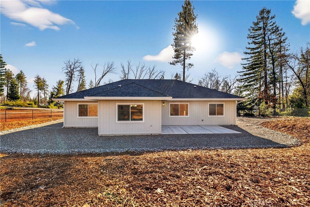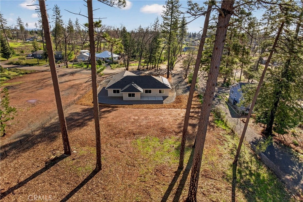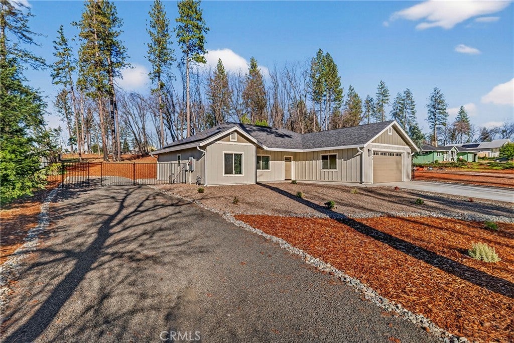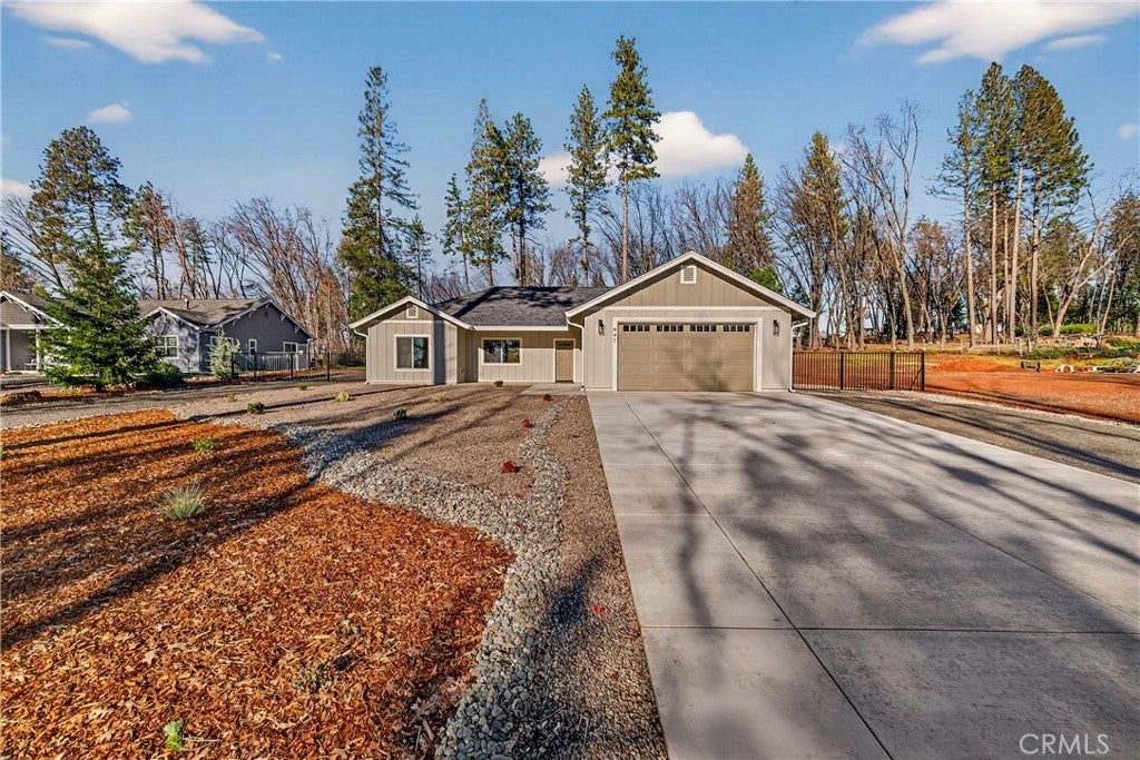 New 2025 Paradise Custom Home with 3 bedrooms and Spacious Office built by a second-generation Paradise Home builder, West Family Homes. Fantastic Paradise location and a full acre with fenced back yard. New 2025 Septic system installed in the front yard, so the new owner has at least a 1/2-acre backyard ready for a Shop, Pool and/or ADU. There are two metal gated entrances on either side of the home for easy access. On one side is R.V. 30amp plug and waste disposal access. The oversized 23ft wide concrete driveway provides plenty of parking. The 19ftX6ft covered front porch welcomes you and your guests into the home. The home offers 5" baseboards and Luxury Vinyl Plank flooring throughout. The home offers an open floor plan with 9ft ceilings & LED recessed lights on dimmer switches in every room. The kitchen offers a large 8ftX4ft island with undermount stainless sink, Quartz counter tops with subway tile backsplash, Whirlpool Gold appliances w/ a natural gas oven/range and solid wood shaker style cabinets with dove tail drawers and soft close drawers & cabinets. The kitchen overlooks the living room and dining room. The dining room has a large picture window and slider to the concrete patio. Off the living room is the bonus/spacious office with glass French doors. This floor plan does offer the split primary with two guest bedrooms and bath on one side of the home. The guest bath offers 17" deep tub/shower combination and a 5ft vanity with quartz counter tops. The spacious primary bedroom offers a 9ft to 10ft tray ceiling. The primary bath offers 8ft vanity with two sinks, quartz countertop, sliding glass door step in shower, walk in closet and separate toilet area. The laundry/utility area offers a full-size pantry, shaker style cabinets above the washer/dryer area and an entry organizer area with quartz countertop. The fully finished oversized 540 square foot garage has 5" baseboards, L.E.D. recessed lighting and an epoxy floor. This property is ready for a new resident in Paradise. So many possibilities with this 1 Acre lot.