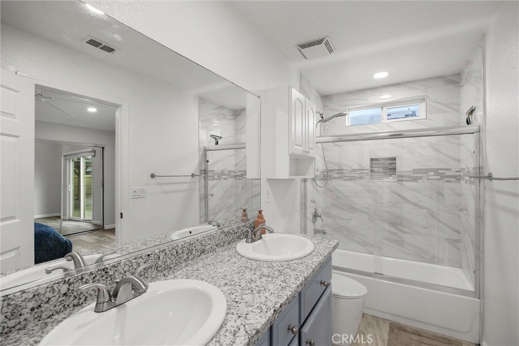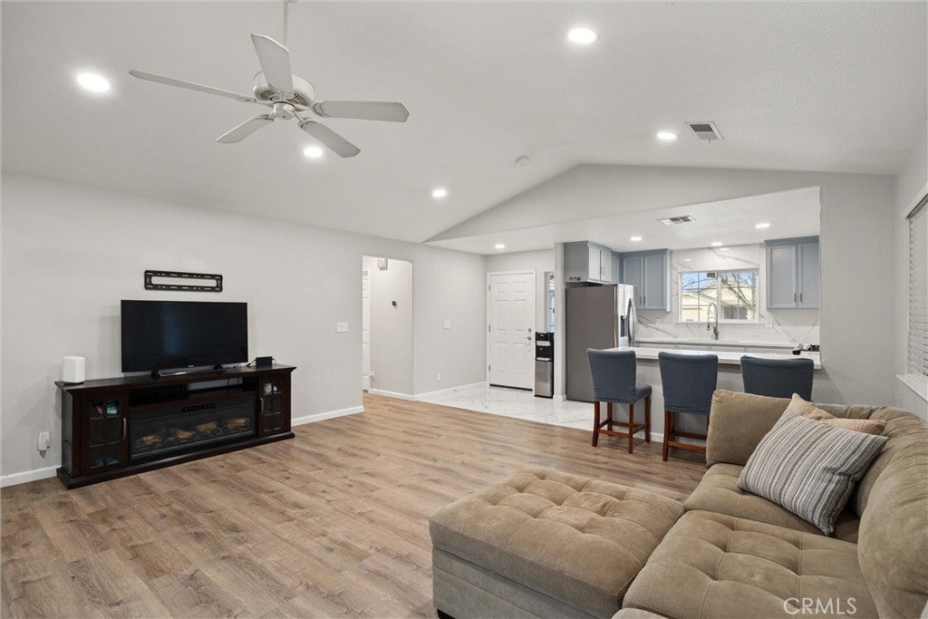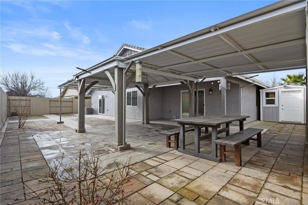 Freshly updated and move-in ready, this beautiful five-bedroom, two-bath home is designed for comfortable living and effortless entertaining. The heart of the home features an updated kitchen showcasing stunning custom quartz countertops, stylish tile finishes, and an open-concept layout that flows seamlessly into a spacious living room with soaring vaulted ceilings. Large sliding glass doors flood the space with natural light and create a perfect indoor-outdoor connection to the backyard—ideal for gatherings and everyday living. Step outside to a thoughtfully designed, low-maintenance backyard with expansive concrete areas and two large pergolas, providing generous shade for relaxing afternoons and outdoor entertaining and a large shed for extra storage. The primary suite offers a private retreat, complete with an attached ensuite bathroom featuring a soaking tub—perfect for unwinding at the end of the day. Additional highlights include a cement tile roof for long-term durability, central heating and air for year-round comfort, and a 24-hour surveillance system offering added peace of mind. With low-maintenance features throughout and tasteful updates already completed, this home is truly turnkey an ready for its next owner to enjoy. A wonderful opportunity to own a spacious, updated home that blends style, comfort, and ease of living. Buyer to verify all information to their satisfaction.