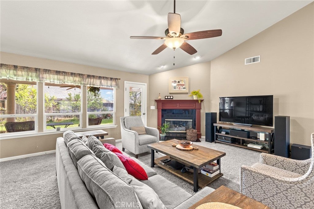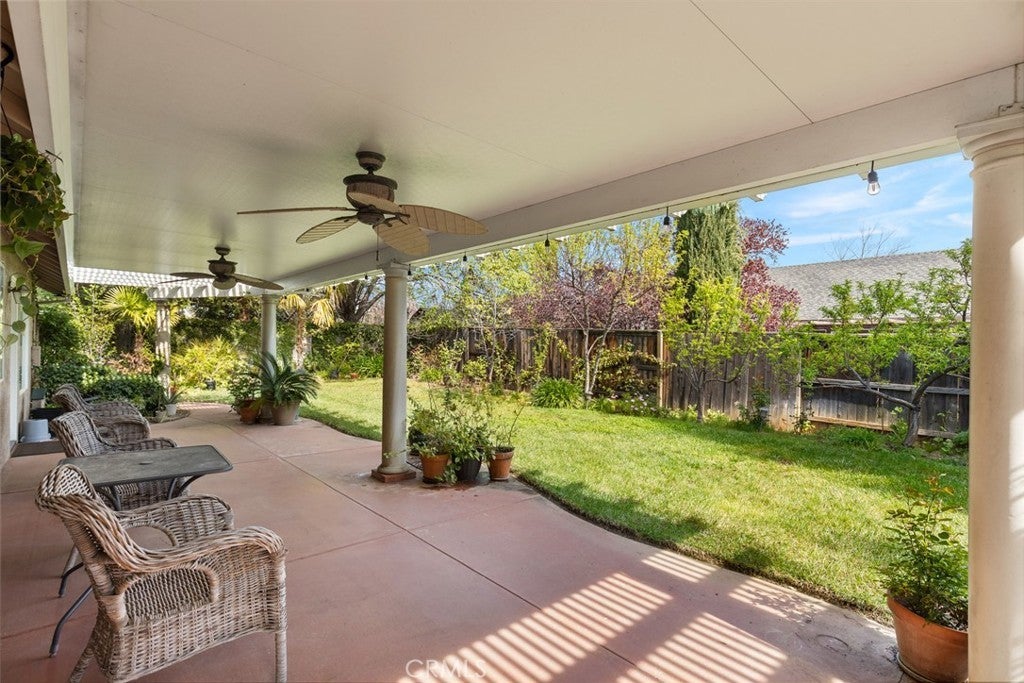 Welcome to this beautifully maintained home tucked away on a quiet cul-de-sac in the desirable Nob Hill neighborhood. Just a short walk to the neighborhood park, this property offers the perfect blend of comfort, convenience, and outdoor living. The thoughtfully designed split floor plan provides privacy, with the spacious primary suite situated on one side of the home and featuring direct access to the backyard patio. At the heart of the home, the chef’s kitchen boasts newer appliances, ample workspace, and flows seamlessly into the open-concept family room, complete with a cozy gas stove ideal for gatherings and everyday living. This home also features modern smart home upgrades including a smart thermostat, smart sprinkler controller, smart lighting in the kitchen and dining room, a smart doorbell, and security cameras for added convenience and peace of mind. Step outside to a stunning full-length covered concrete patio, perfect for relaxing or entertaining year-round. The backyard is a gardener’s delight with mature fruit trees, roses, dogwood, and a beautiful magnolia, along with a dedicated garden area. There is also potential RV parking with a gated side yard for added flexibility. Conveniently located just minutes from shopping, California Park, Canyon Oaks Country Club, scenic hiking trails, and the Bidwell Park entrance, this home offers easy access to some of the area’s most desirable amenities while maintaining the peace and charm of a tucked-away neighborhood.