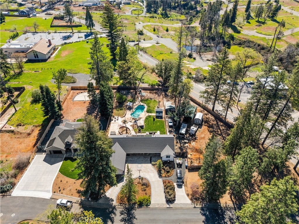 Welcome to this beautifully designed modern farmhouse-style home situated on a full acre, offering space, privacy, and exceptional indoor-outdoor living. This thoughtfully designed home features 3 bedrooms, 3 bathrooms, plus a versatile den or office, providing the perfect blend of comfort and functionality. Step inside to an inviting open-concept living area with vaulted ceilings and exposed wood beams, creating a bright and airy feel throughout the home. The living room is anchored by a stunning white brick fireplace with a wood mantle, adding warmth and charm to the space. The beautifully appointed kitchen features quartz countertops, crisp white cabinetry, subway tile backsplash, stainless steel appliances, and a spacious island with bar seating—perfect for everyday living or entertaining guests. Just off the living room, the primary suite offers a large walk-in closet and a well-appointed bathroom featuring dual sinks, quartz counters, a spacious walk-in tile shower, and an additional closet for his and hers potential. Two additional bedrooms are connected by a Jack and Jill bathroom with dual sinks and a private tub/shower area, offering convenience and privacy. A third full bathroom with direct outdoor access is ideally located for guests coming in from the backyard pool area. Step outside to your private backyard oasis, complete with a in-ground pool, expansive patio space, shaded gazebo seating area, relaxing hot tub, and multiple spaces to gather or unwind. The large back deck overlooks the yard, making it perfect for entertaining, outdoor dining, or enjoying peaceful mornings surrounded by mature trees. The one-acre property provides ample space for recreation, gardening, RV parking, or the potential to add a shop or ADU. Additional features include 22 panels of owned solar for energy efficiency and a storage shed for added convenience. This property offers the perfect balance of modern farmhouse charm, outdoor living, and space to enjoy the Paradise lifestyle.
