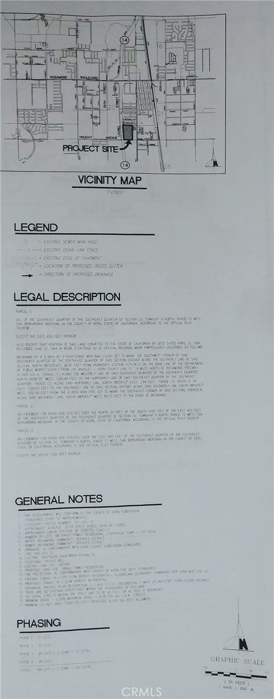 25+/- acres right On Hwy. 14 with 1327 feet Hwy. frontage. A small portion of the property produces $31,827.00 income/year from solar, and the income will increase by an additional 3.5% beginning March 1st of each year. Seller to provide the schedule of income upon approval of the offer and during the due diligence period. There is an expired tentative tract map No. 6443 for 120 Vesting Lots, that had some infrastructures improvements with curbs and gutters, etc... Flat buildable parcel with so many potentials, put your billboard sign or build a Truck Stop, Solar, etc... Absolutely beautiful South of Rosamond Blvd. There are homes to the North, South, and East of the subject property. New residential tracts in the area. Within a few miles is the world-famous Willow Springs Raceway. All utilities are in the street (including water). Just over the Los Angeles county line. You may google the following GPS coordinates to locate the property: 34.851832