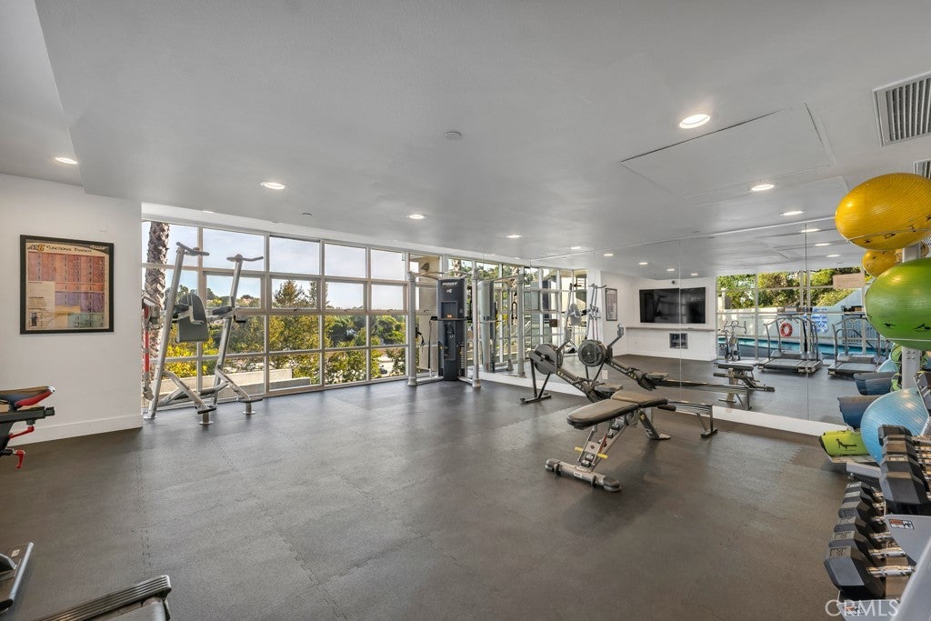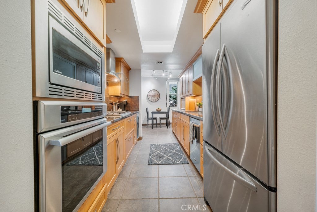 This fully furnished, remodeled 2-bedroom, 2-bathroom residence at 171 N Church Ln #514 offers 1,408 sq ft of spacious, modern living in a rental-permitted community rarely available in this location. Set above the street, the unit delivers a quiet, private living experience while remaining minutes from major Westside corridors. The interior features high ceilings, double-paned windows, and soundproofing throughout, creating a calm and comfortable environment. The open living and dining areas are anchored by a fireplace and enhanced with custom surround sound, a wine fridge, and large flat-screen TVs in both the living room and primary bedroom. The kitchen has been fully remodeled with quartz countertops, stainless steel appliances, and warm-toned cabinetry, offering both function and style. A breakfast nook and separate dining area provide flexible options for everyday living or entertaining. The primary bedroom includes a king bed, walk-in closet with built-in shelving, and a generous ensuite bathroom featuring a soaking tub and a separate glass-enclosed shower. The second bedroom is outfitted with a queen bed, dedicated desk, and custom closet storage, making it ideal for guests or a home office. An in-unit washer and dryer are conveniently located in the hallway. Two assigned parking spaces (#121 and #122) are included, along with additional storage above space #122. Community amenities include a pool, gym, and sauna, within a predominantly owner-occupied building that prioritizes privacy and security. Conveniently located near the Luxe Hotel and the Getty Museum, with easy access to Brentwood and Bel Air, this residence offers a rare combination of space, privacy, and Westside accessibility.