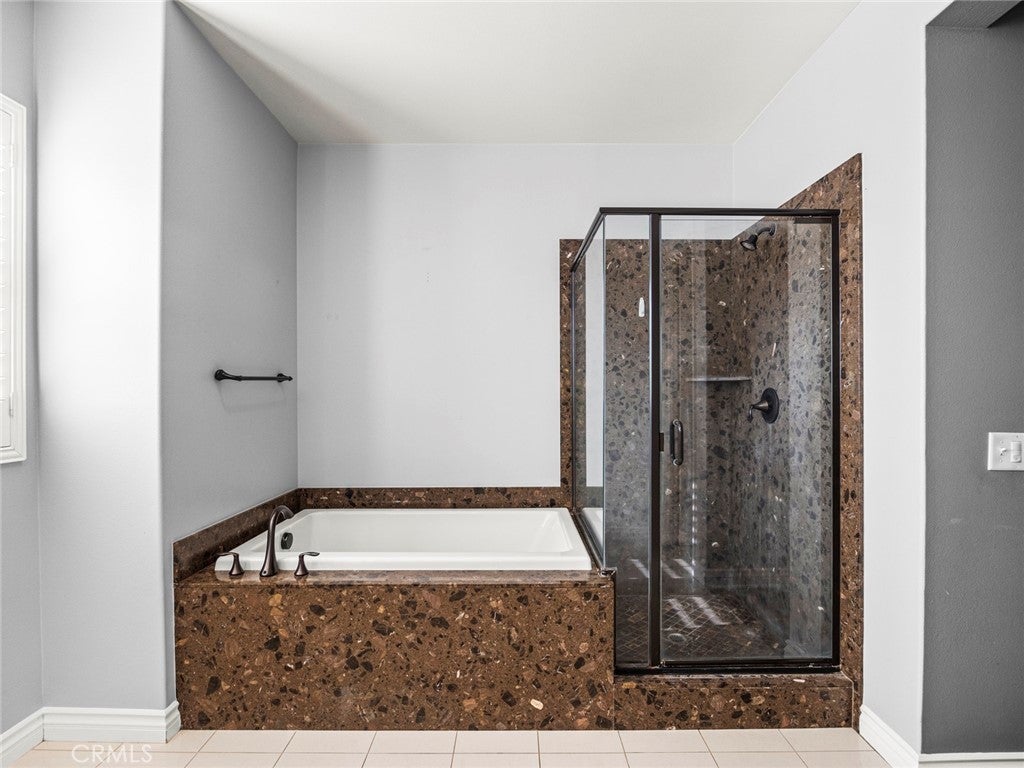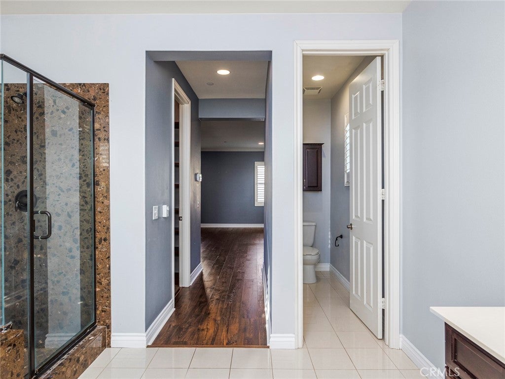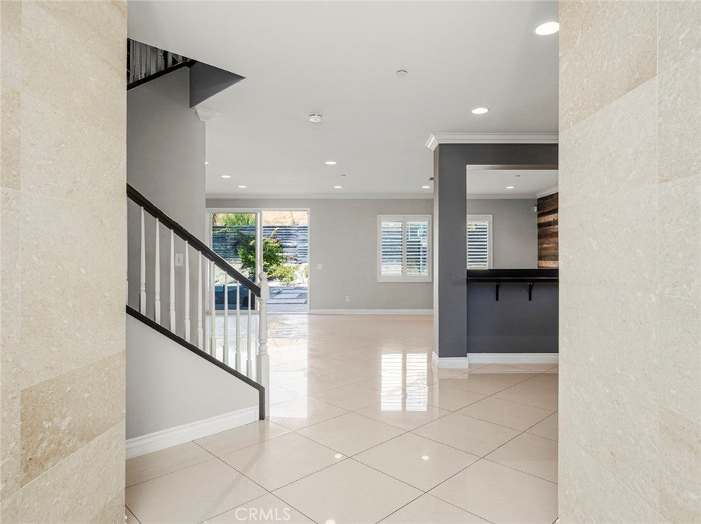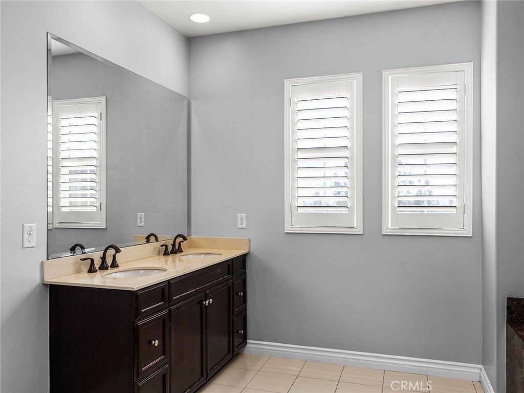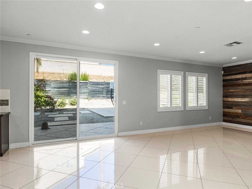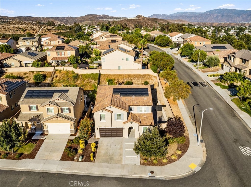 BOM! Large Spanish-style home in trendy Plum Canyon area. This two-story single family residence is situated on a large corner lot in a handsome neighborhood with views of the surrounding mountains. The sophisticated interior displays clean lines, natural colors, and details like high-gloss tile floors, recessed lighting, modern wall tiles, and crown moldings. The lower level’s open floor plan includes a large, modern kitchen with stainless steel appliances, a kitchen island, a walk-in pantry, and ample space for informal dining. The living room is open to the kitchen on one side, and a wall with a pass-through window keeps it separate, but open to the adjacent formal dining room. There is also a laundry room, a carpeted secondary bedroom, and a full bath on the main floor. Upstairs, in addition to the remaining four bedrooms, there is a large loft with wood laminate floors that may be used as a family room. The primary suite also has laminate flooring, as well as double doors, a walk-in custom closet, and a private full bath with dual sink vanities and a separate shower and soaking tub. The three secondary upstairs bedrooms feature carpeting and plantation shutters. One of these bedrooms has its own private full bath, while there is a full bath in the hallway for the other two. Out back, find a large yard with a patio, a basketball hoop, and tall palms. This home’s size, design, and excellent condition, along with its prime location near schools, shopping, and parks, make it a must-see! Solar is paid off as well.