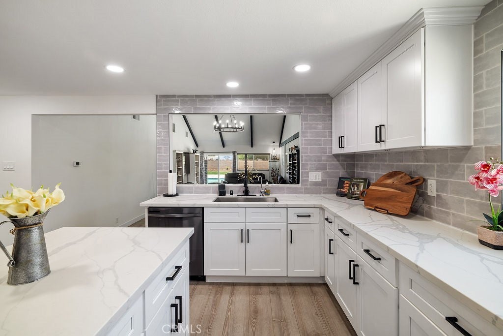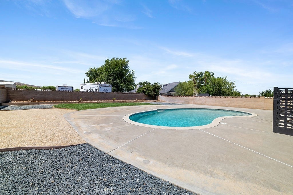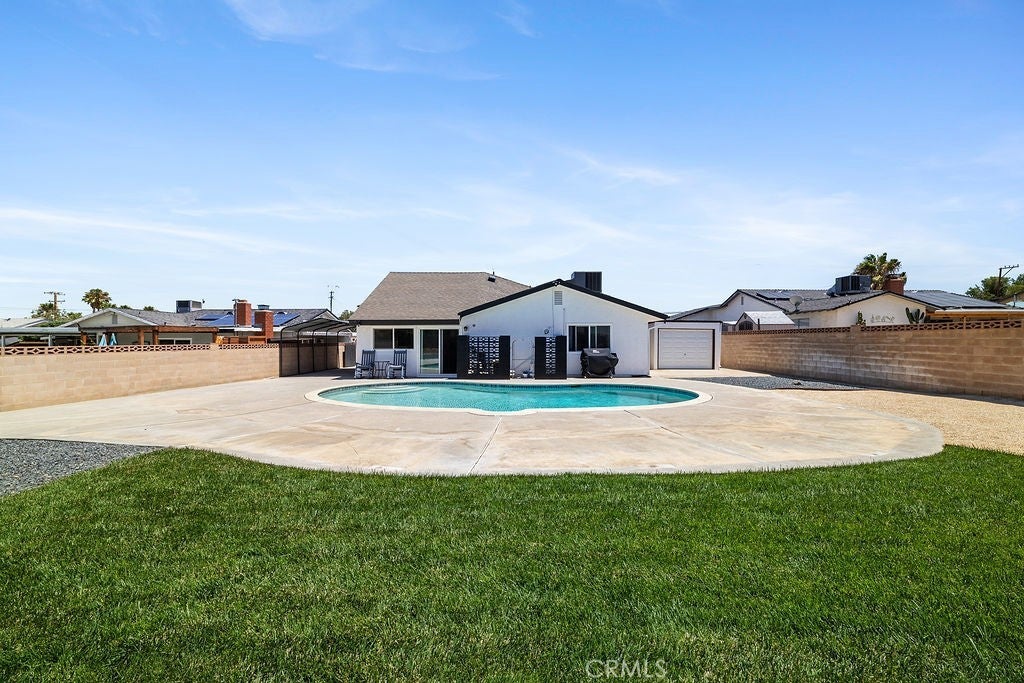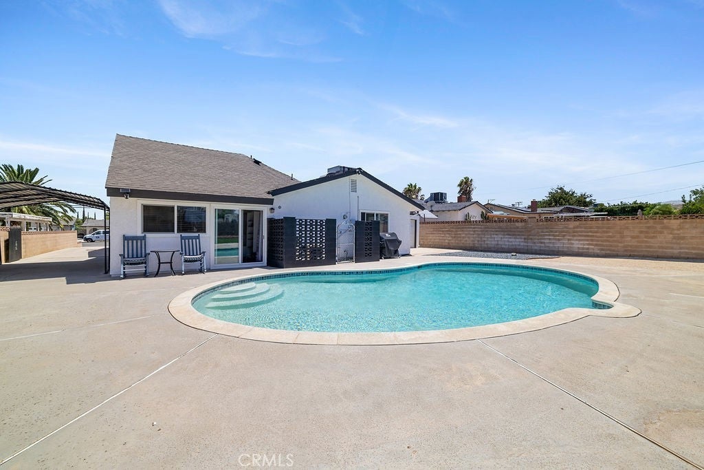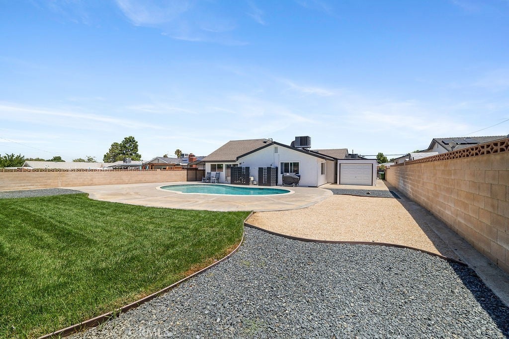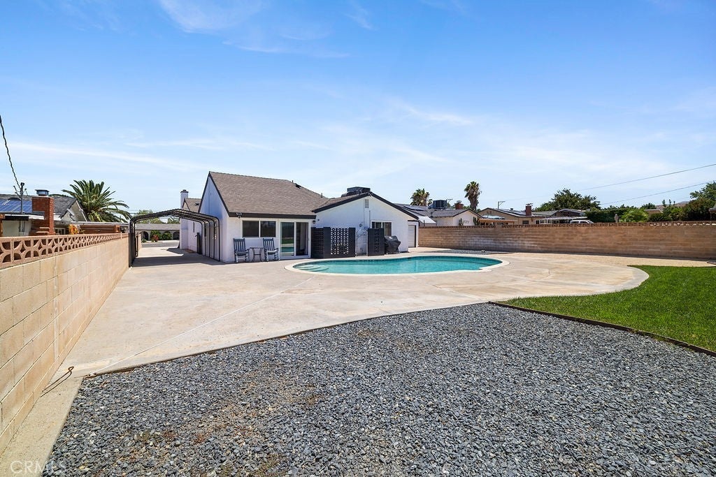 Price Reduced! Gorgeous, newly remodeled 5 room, 2 bath, single story, pool house. Farmhouse inspired. Amazing 2,430 sq foot living space that welcomes you with an open-concept floor plan. The entire house flows effortlessly. Formal living room with fireplace. Modern kitchen featuring quartz counter tops, a chic tile backsplash, a center island and stainless-steel appliances. Microwave, dishwasher, refrigerator and stove are included with the sale! A second island is found in the wet bar that is connected to the second living room creating the perfect setting for entertaining! Sit down and enjoy a glass of wine or a cup of coffee watching the sunset or the sparkling pool. Everything in this sleek home is 2 yrs old, floors, fans, chandeliers, doors, windows, blinds, garage door, pool equipment and heater, you name it! Independent laundry room equipped with cabinets and a utility sink. Electric washer & dryer also included. A custom-built shower glass door was made for the master bedroom along with dual sink quartz counter tops. Property includes a back shed/storage room, RV access, covered parking and exterior lighting throughout. Welcome to your new home!