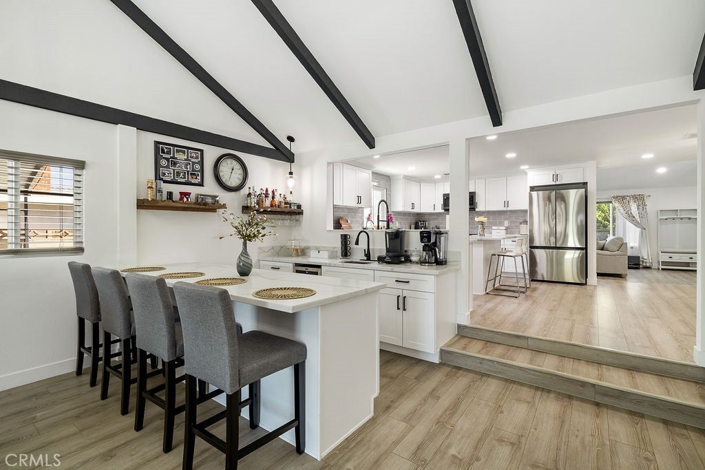 • Interior FeaturesBeamed Ceilings, Built-in Features, Open Floorplan, Quartz Counters, Recessed Lighting, Storage, All Bedrooms Down, Bedroom on Main Level, Bar, Cathedral Ceiling(s), Ceiling Fan(s), Main Level Primary, Wet Bar