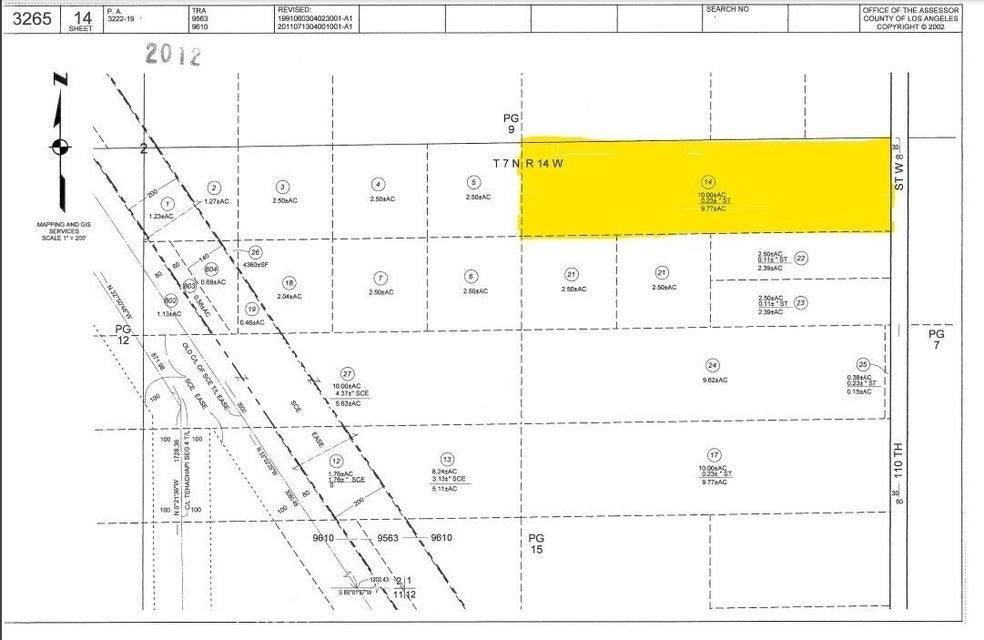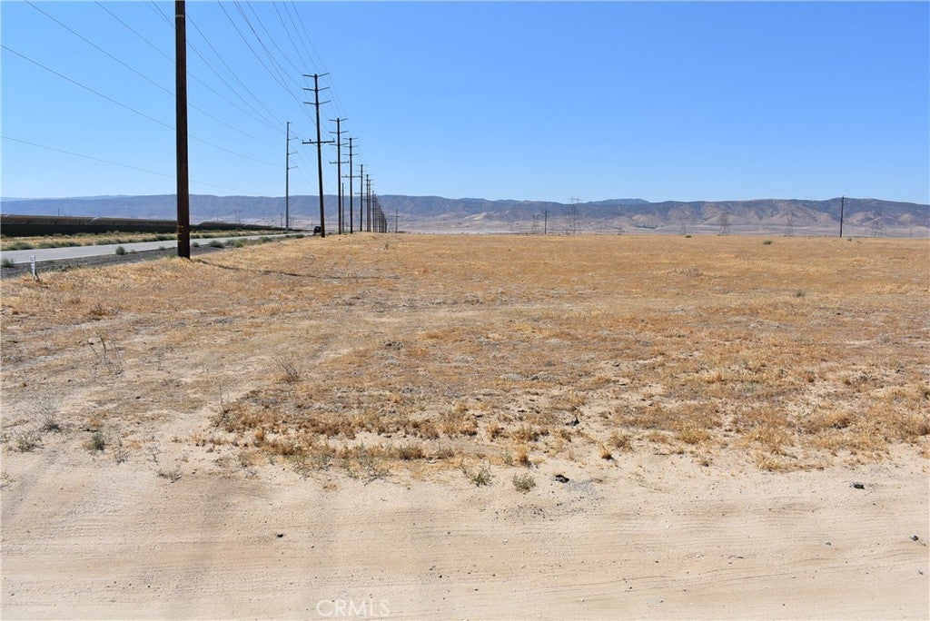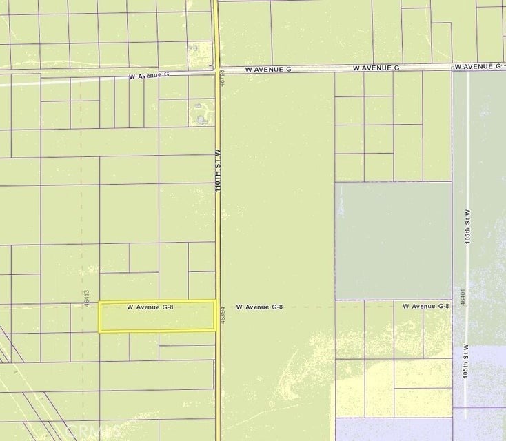 9.75 acres at the corner of 110th St West and Ave G8. The lot is zoned A22 for agriculture, animals, and a home. 327 feet of paved frontage on 110th St with power in the street, and1295 feet of dirt road frontage on Ave G8. APN 3265-014-014.