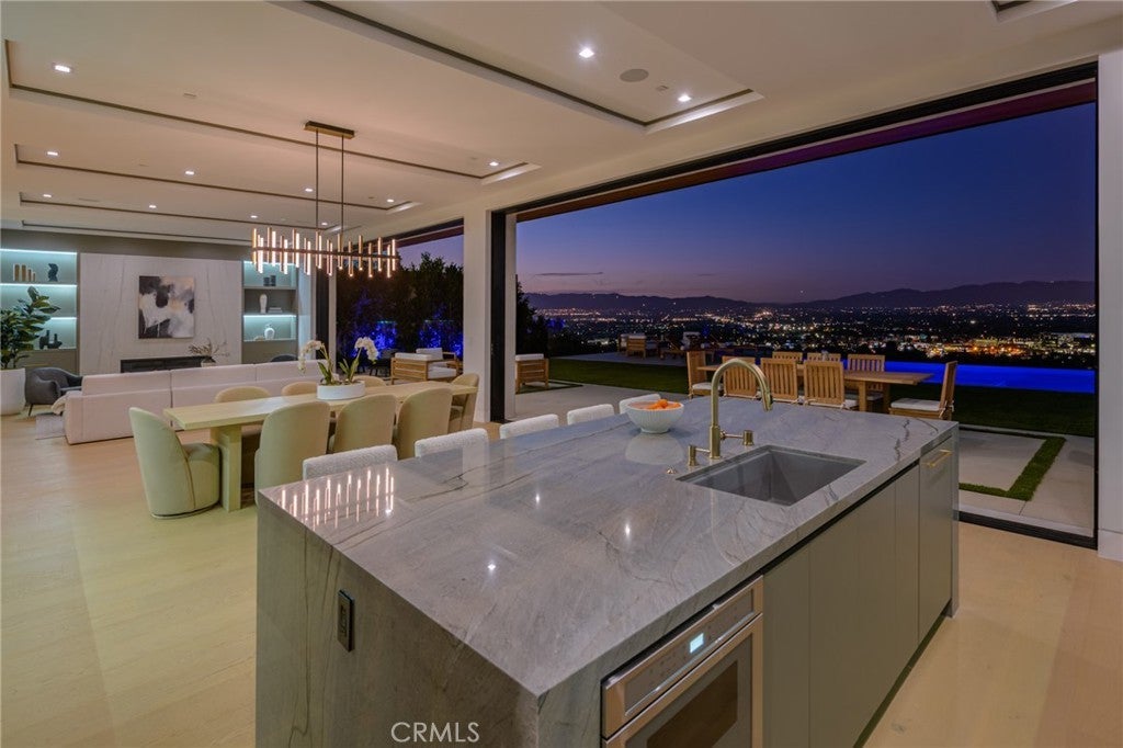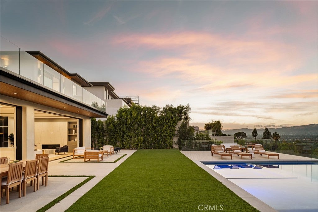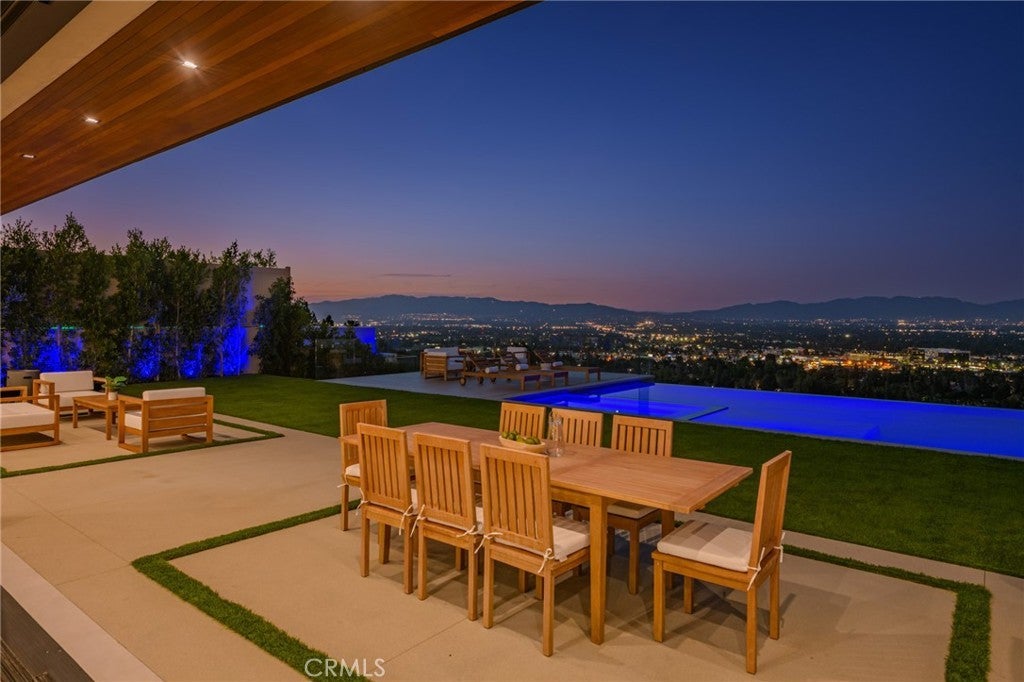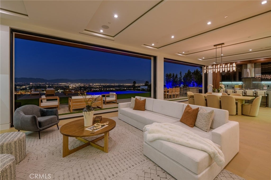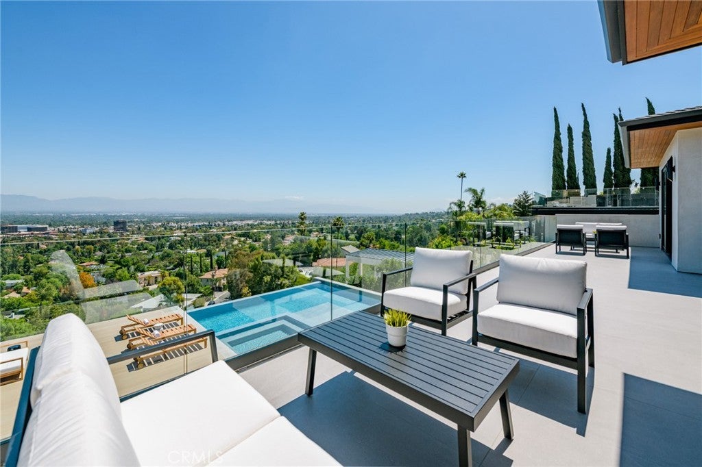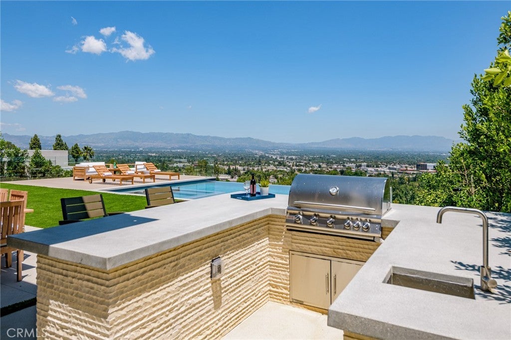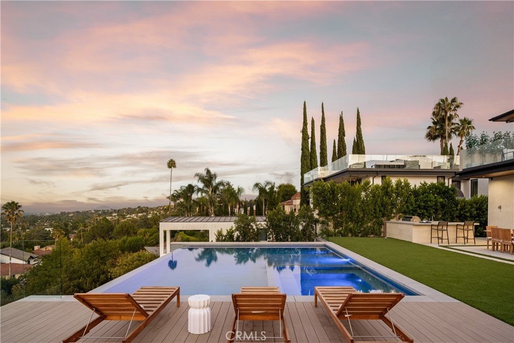 A one-of-a-kind architectural masterpiece where striking design meets endless views. Perched on a quiet, wide street, this brand-new 2025 estate showcases unobstructed panoramas of city lights, rolling hills, and golden sunsets—arguably the most breathtaking vantage point in Tarzana. Every inch of this contemporary showpiece has been meticulously crafted to frame and celebrate the views. Walls of glass and disappearing pocket doors erase the boundary between indoors and out, opening to a private outdoor paradise with an infinity-edge plunge pool spilling into the skyline. Inside, soaring 11-foot ceilings, wide-plank oak floors, and an open layout create a grand yet effortless flow. The sunlit great room combines living, dining, and a chef’s kitchen with custom cabinetry, an oversized island, and top-of-the-line Thermador appliances. The primary suite is a private retreat, elevated with mesmerizing views, dual showers, a sculptural soaking tub, and balcony escapes. Beyond its five bedrooms and six baths, this home elevates lifestyle with a three-level theater, gym, sauna, home office, and a bar & billiards lounge designed for unforgettable entertaining. This is more than a home—it’s an experience. Step inside and look out. You’ve never seen anything like it.