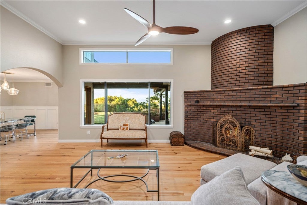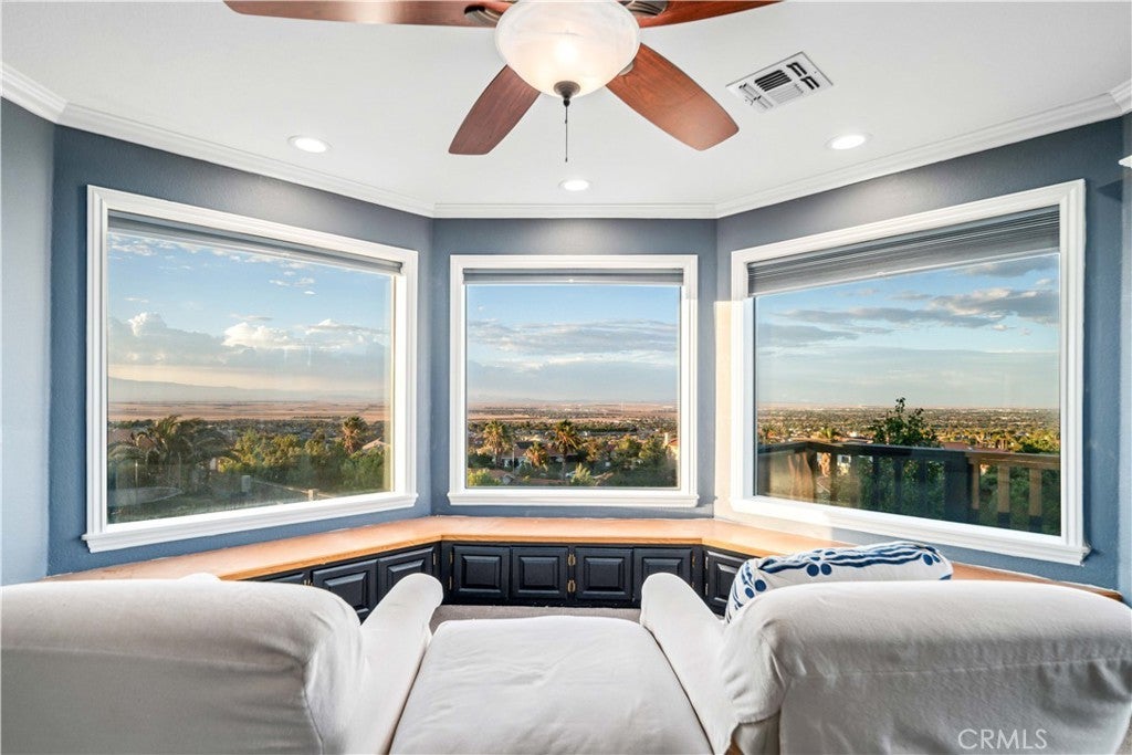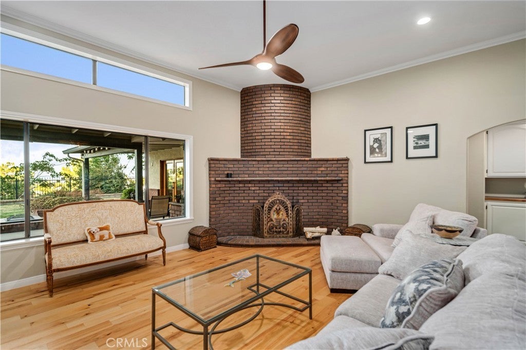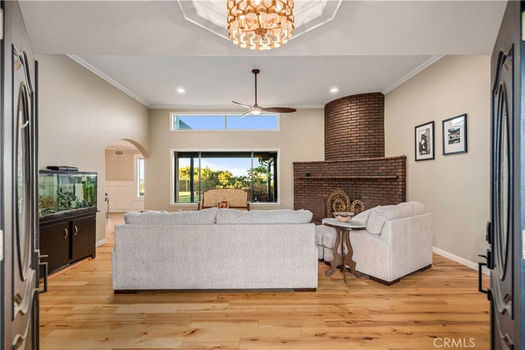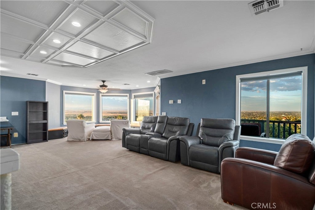 Amazing custom home located in the prestigious Godde Terrace Estates with breathtaking valley views! Enter through a grand double-door entry into a home filled with wood flooring, crown molding, and natural light. The gourmet kitchen features an 11-foot multifunctional quartz island, dual sinks, skylights, Fisher & Paykel 6-burner range with double ovens, wine fridge, refrigerator that stays, built-in spice cabinet, trash drawer, and a walk-in pantry. The kitchen opens to the family room, both showcasing incredible views. The formal living room highlights a one-of-a-kind fireplace and picture windows, while the dining room leads to a backyard with covered patio, built-in BBQ, and fire pit. All bedrooms are conveniently located on the first floor, including the luxurious primary suite with fireplace, exposed beam ceiling, direct patio access, oversized garden tub, updated shower, dual vanities, and a cedar-lined walk-in closet. Upstairs, the loft has been transformed into an entertainer's retreat with a bar, theater room (all theater furniture to stay), and an outdoor deck with more stunning views. Additional highlights include a whole-house water softener, marble finishes in laundry and bathrooms, RV access with cleanout, and a recirculating pump. A one-of-a-kind property you won't want to miss!