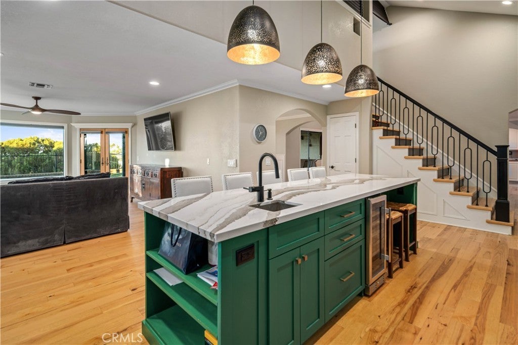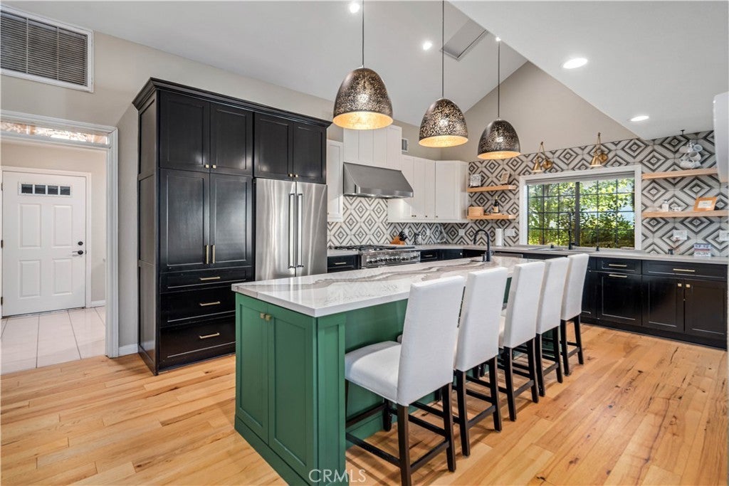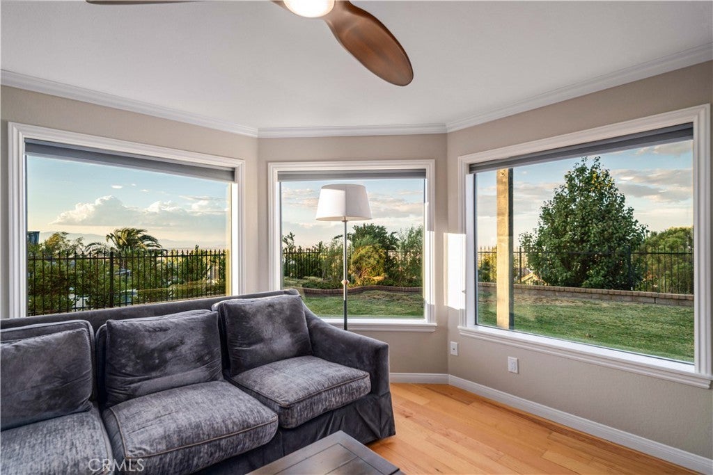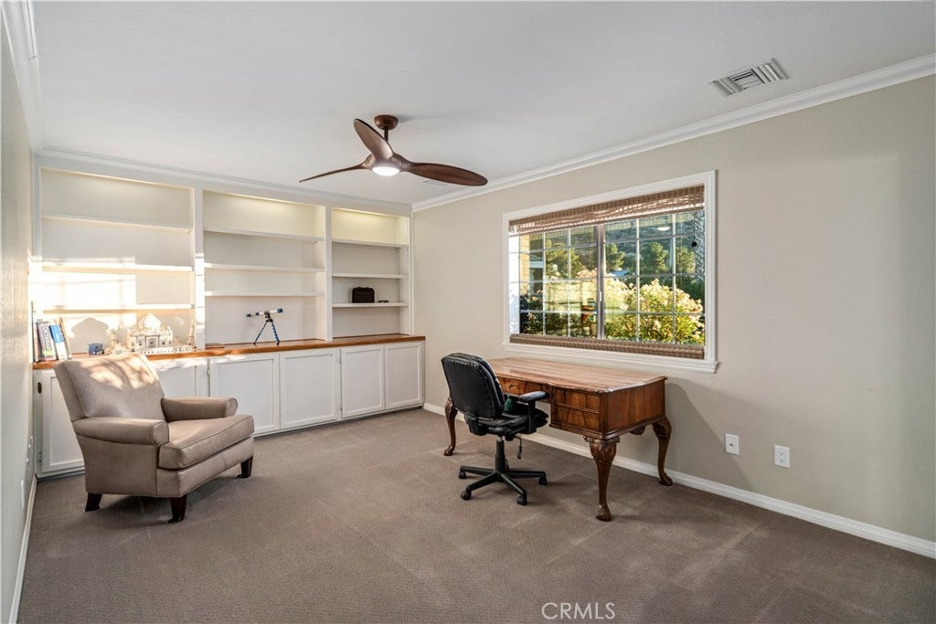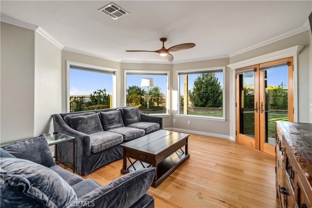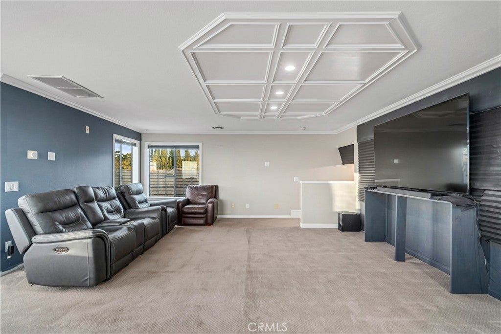 Amazing custom home located in the prestigious Godde Terrace Estates with breathtaking valley views! Enter through a grand double-door entry into a home filled with wood flooring, crown molding, and natural light. The gourmet kitchen features an 11-foot multifunctional quartz island, dual sinks, skylights, Fisher & Paykel 6-burner range with double ovens, wine fridge, refrigerator that stays, built-in spice cabinet, trash drawer, and a walk-in pantry. The kitchen opens to the family room, both showcasing incredible views. The formal living room highlights a one-of-a-kind fireplace and picture windows, while the dining room leads to a backyard with covered patio, built-in BBQ, and fire pit. All bedrooms are conveniently located on the first floor, including the luxurious primary suite with fireplace, exposed beam ceiling, direct patio access, oversized garden tub, updated shower, dual vanities, and a cedar-lined walk-in closet. Upstairs, the loft has been transformed into an entertainer's retreat with a bar, theater room (all theater furniture to stay), and an outdoor deck with more stunning views. Additional highlights include a whole-house water softener, marble finishes in laundry and bathrooms, RV access with cleanout, and a recirculating pump. A one-of-a-kind property you won't want to miss!