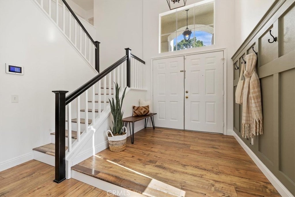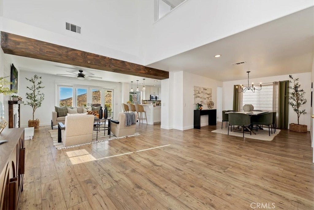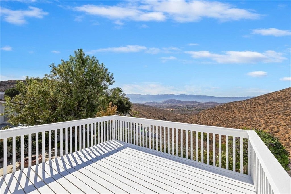 Rare combination of amazing infinity views and no home in front or behind of this highly upgraded 4 bedroom and 3 bath home. Endless views from almost every room of the canyon, rolling hills, city lights and the lake. The formal entry with two story ceilings leads to the highly desired open concept layout with the living room open to the dining room and family room which is open to the kitchen. Features in the immaculate kitchen are a breakfast bar, custom cabinets, stainless steel appliances, custom backsplash and pantry with pull out shelves. Views from the kitchen and the family room which offers a custom surround fireplace. This home has just recently been upgraded with flooring, baseboards, recessed lighting and shiplap walls. Ample natural light flows throughout the home. Main floor laundry room with direct garage access and guest bathroom. Upstairs are 4 bedrooms with one open to the primary bedroom that is great for a nursery or office and can easily be converted to a separate bedroom. The master retreat has a large balcony to enjoy the views and provide shade for the patio below. The ensuite features dual sinks, glass enclosed shower walk in, separate soaking tub and a walk in closet. Spacious garage with built-in cabinets. Extended side driveway for additional parking. The back yard is perfect for entertaining while enjoying the views with covered patio, separate gas firepit seating area, and there is a large side patio wired for the new owners to add a spa (not included). The property line goes down the hill which allows the potential for a large deck off the back and potential for a terraced hill for planting or multiple seating areas to take advantage of the views. Nearby are great hiking trails, park areas and located in a great school district, close to shopping. Truly a unique hilltop property you need to visit to appreciate.