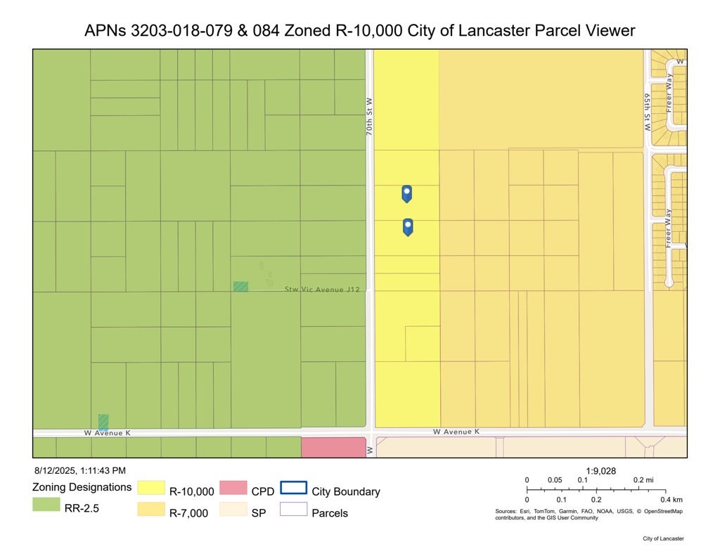 Excellent R-10,000 Zoned Opportunity in West Lancaster. A rare find—10 acres gross, 9.4 acres net of R-10,000 zoned land located within the incorporated City of Lancaster, just one-third mile north of the Avanti North Specific Plan. This two-parcel offering sits directly in the path of growth, close to newer residential developments and numerous housing projects in various stages of planning. Both parcels feature frontage along paved 70th Street West, with electricity available at the street and are well located to future infrastructure. The R-10,000 zoning designation (''Urban Residential, Transitional Density'') supports single-family homes at a minimum net lot size of 10,000 square feet per dwelling unit. Level, accessible, and competitively priced, this acreage presents a compelling opportunity for forward-thinking developers or investors seeking to capitalize on Lancaster's expanding west side. Includes APNs 3203-018-079 & 3203-018-0084. *Buyer to make their own independent investigations regarding Zoning and General Plan Designations, Environmental and Hazard Zones, Access and Development costs, Availability and Costs of Utilities.