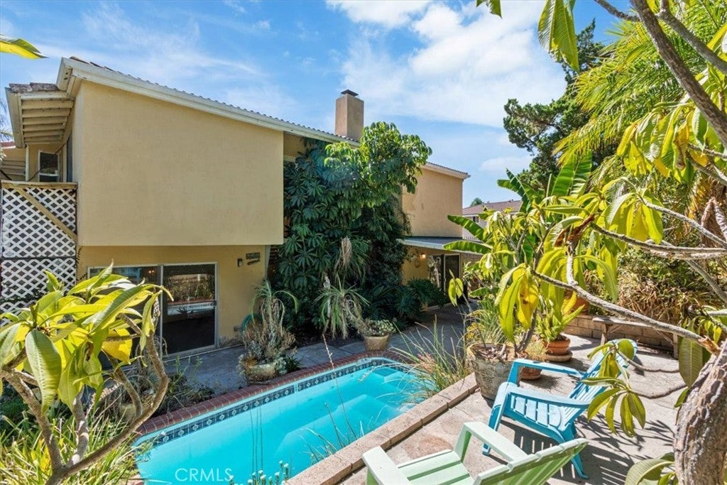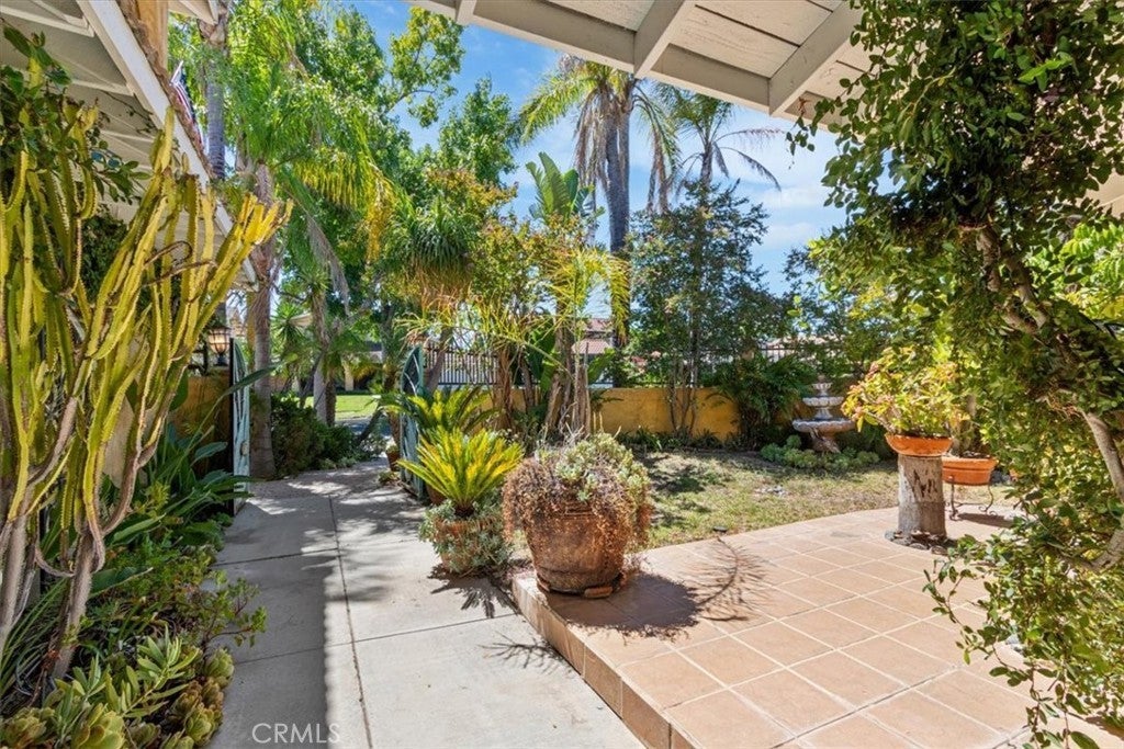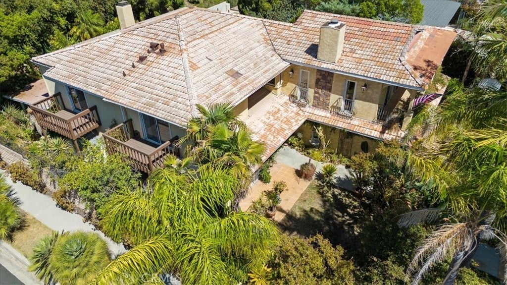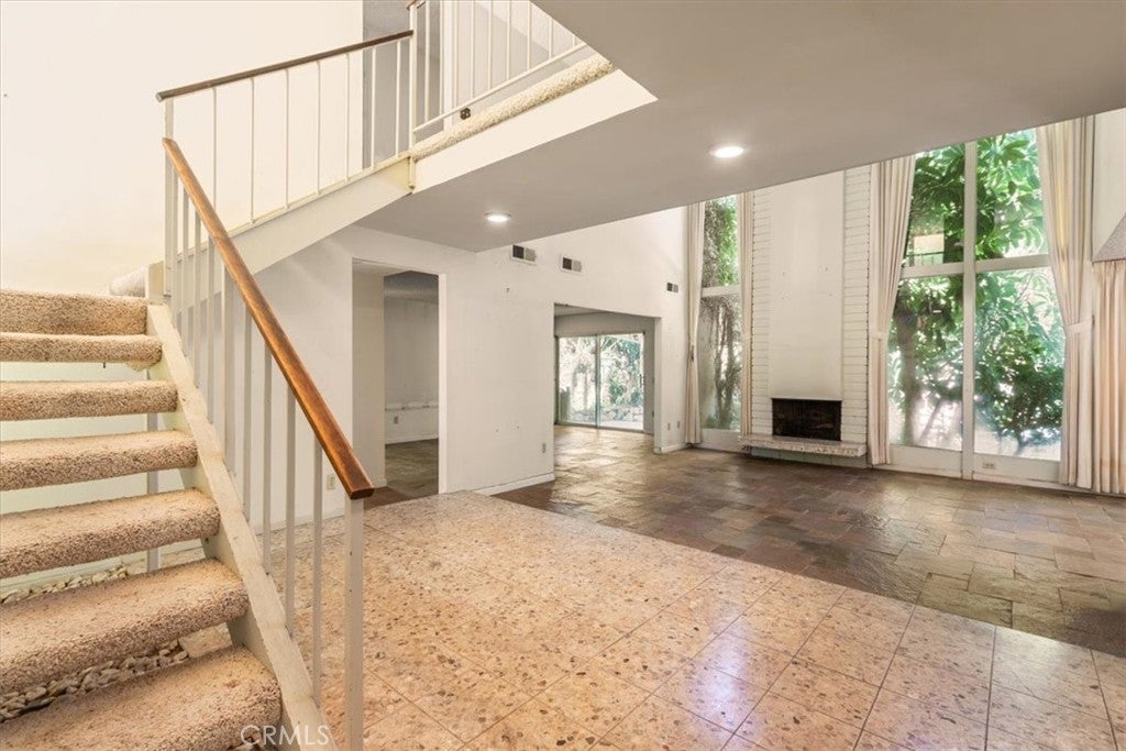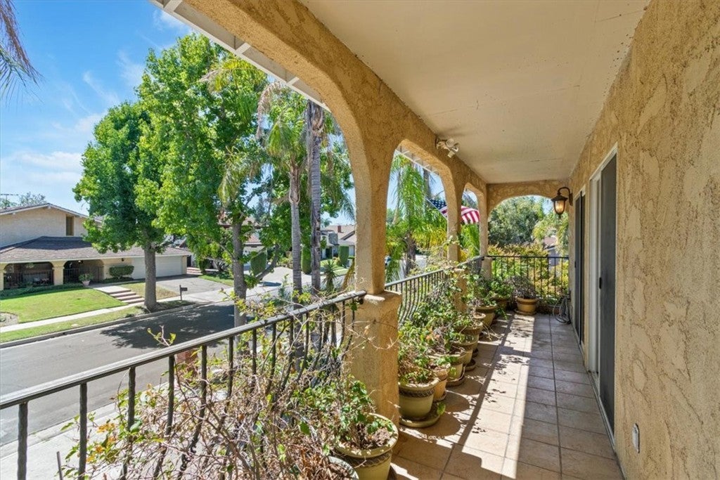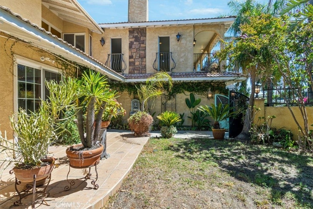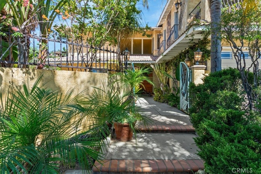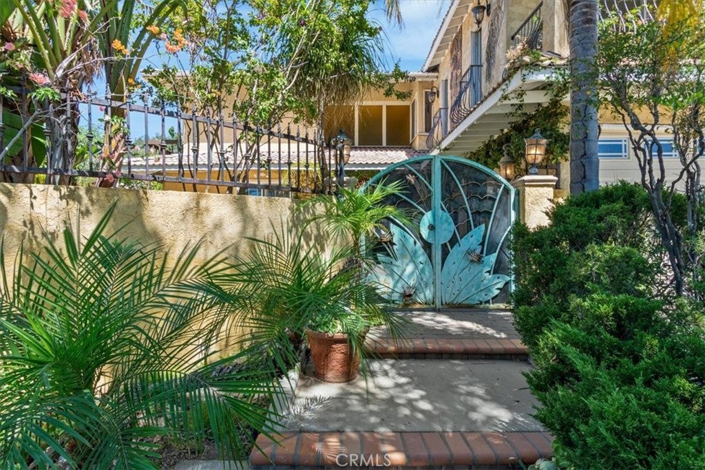 This Mediterranean-style home, with its distinctive Mid-Century Modern flair, presents a rare opportunity for a buyer with vision. Situated on a desirable corner lot within a highly sought-after top-tier school district, the property features a private, gated entry. Inside, soaring ceilings, an elegant MCM staircase, and an impressive floor-to-ceiling fireplace are complemented by expansive windows that fill the sunken living and dining areas with natural light. The main level offers a flexible bedroom and a full bath, alongside a spacious den that could function as a sixth bedroom or combine to create a private mother-in-law suite or attached rental apartment. Stone flooring in the living and dining rooms leads to a covered patio and a lush, tropical-style garden featuring a Koi pond, lap pool, and two covered patios. An eat-in kitchen with sliding doors opens to a second covered patio with stone tile and a unique aviary. A three-car garage provides ample storage. The second floor features an extra-large primary bedroom with a huge private balcony, fireplace, and two closets, including a walk-in, plus a massive en-suite bath. Three additional generously sized bedrooms, two with their own balconies, and extensive storage complete the upstairs. This home is a canvas awaiting your creative vision.