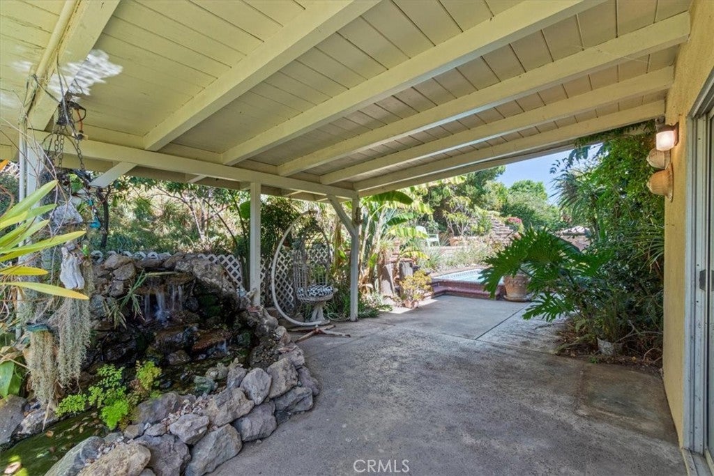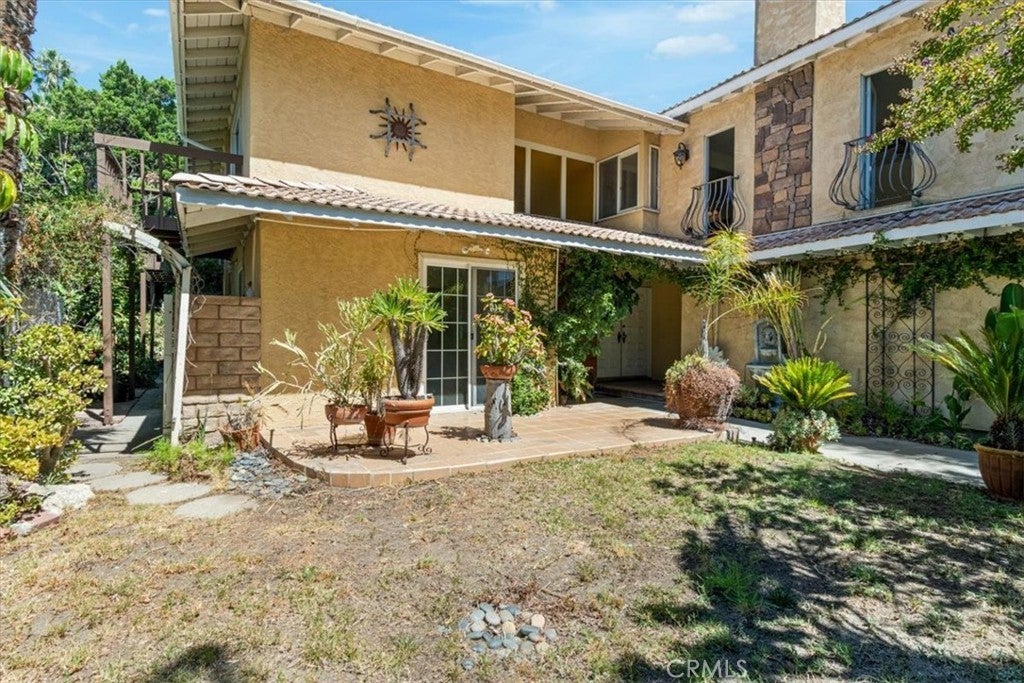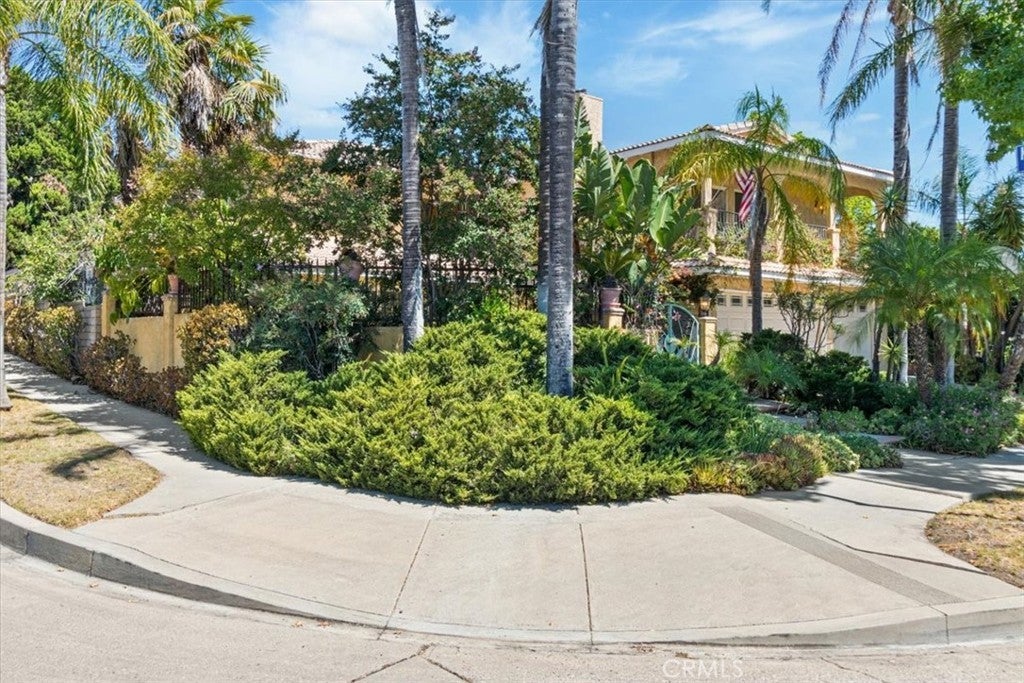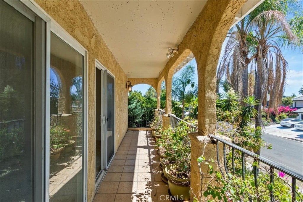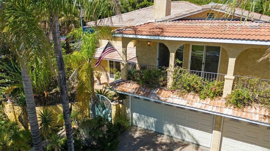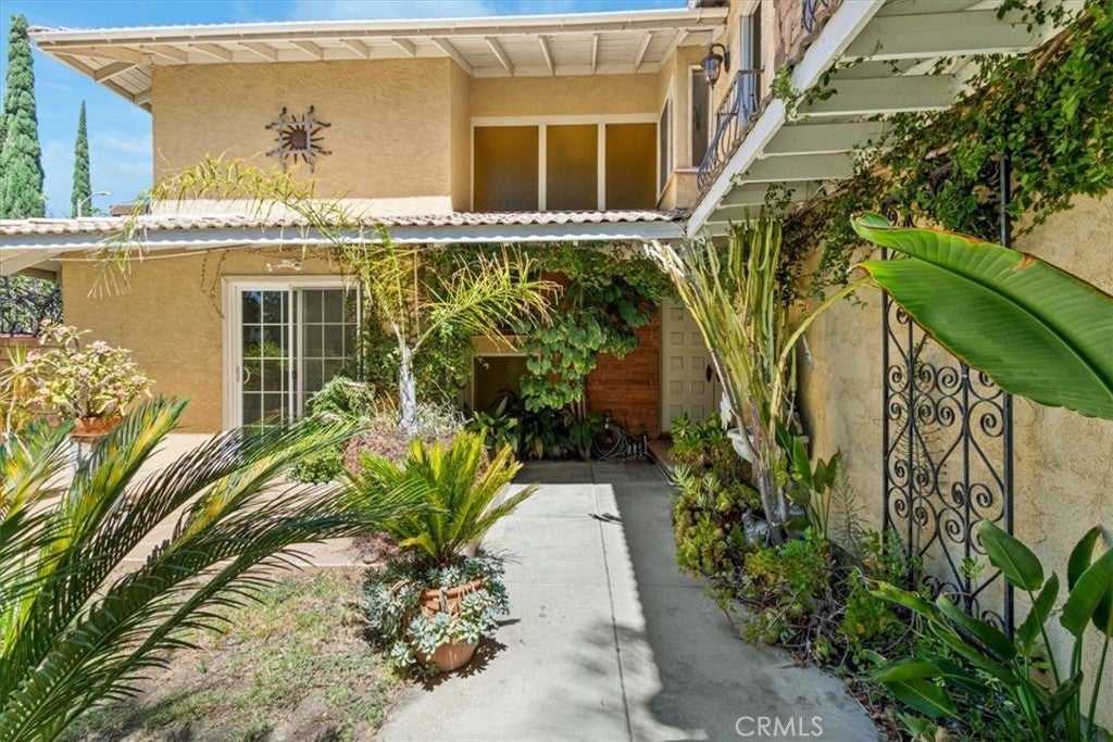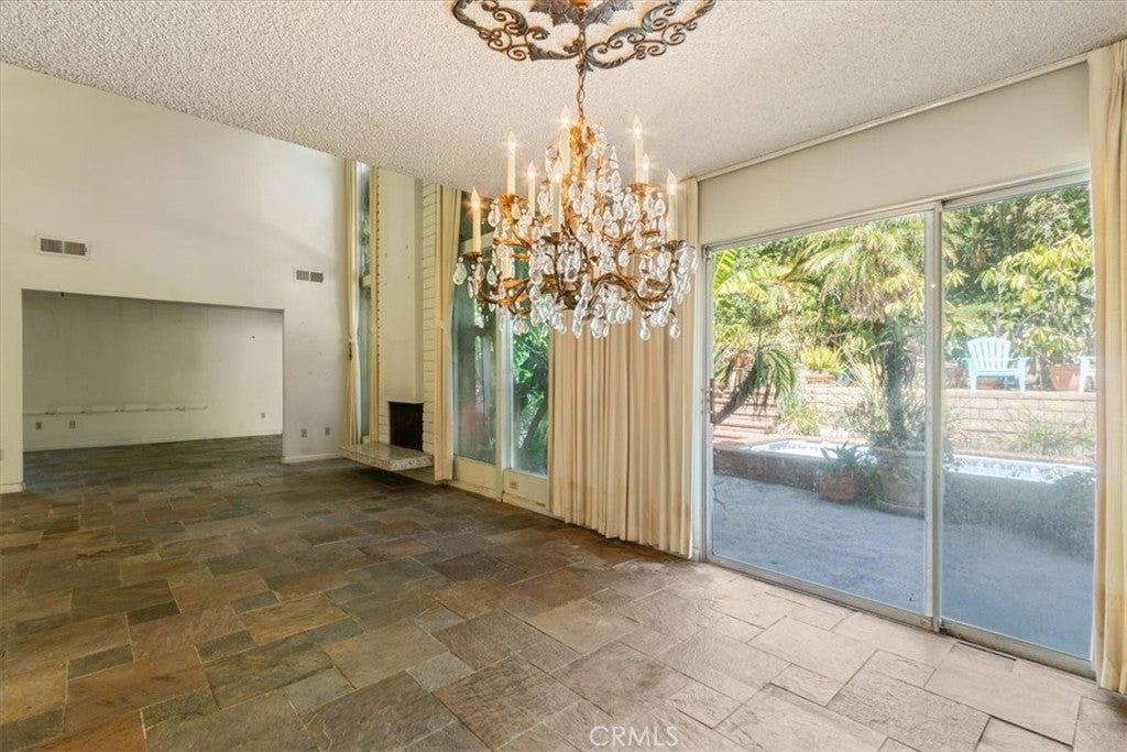 This Mediterranean-style home, with its distinctive Mid-Century Modern flair, presents a rare opportunity for a buyer with vision. Situated on a desirable corner lot within a highly sought-after top-tier school district, the property features a private, gated entry. Inside, soaring ceilings, an elegant MCM staircase, and an impressive floor-to-ceiling fireplace are complemented by expansive windows that fill the sunken living and dining areas with natural light. The main level offers a flexible bedroom and a full bath, alongside a spacious den that could function as a sixth bedroom or combine to create a private mother-in-law suite or attached rental apartment. Stone flooring in the living and dining rooms leads to a covered patio and a lush, tropical-style garden featuring a Koi pond, lap pool, and two covered patios. An eat-in kitchen with sliding doors opens to a second covered patio with stone tile and a unique aviary. A three-car garage provides ample storage. The second floor features an extra-large primary bedroom with a huge private balcony, fireplace, and two closets, including a walk-in, plus a massive en-suite bath. Three additional generously sized bedrooms, two with their own balconies, and extensive storage complete the upstairs. This home is a canvas awaiting your creative vision.