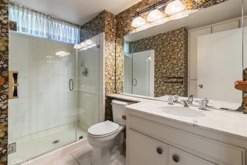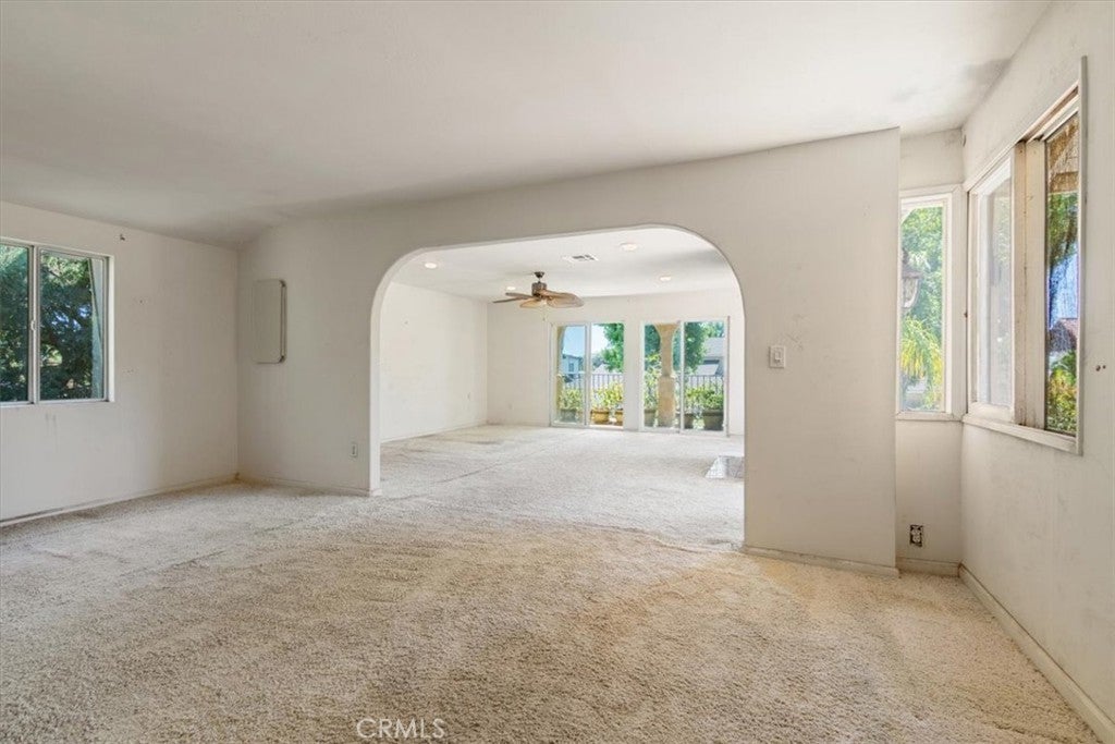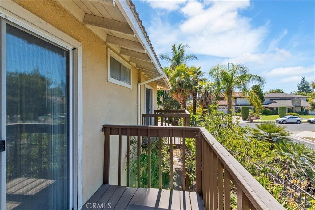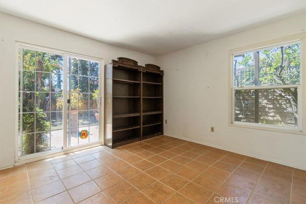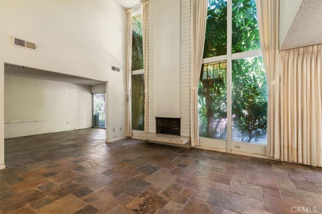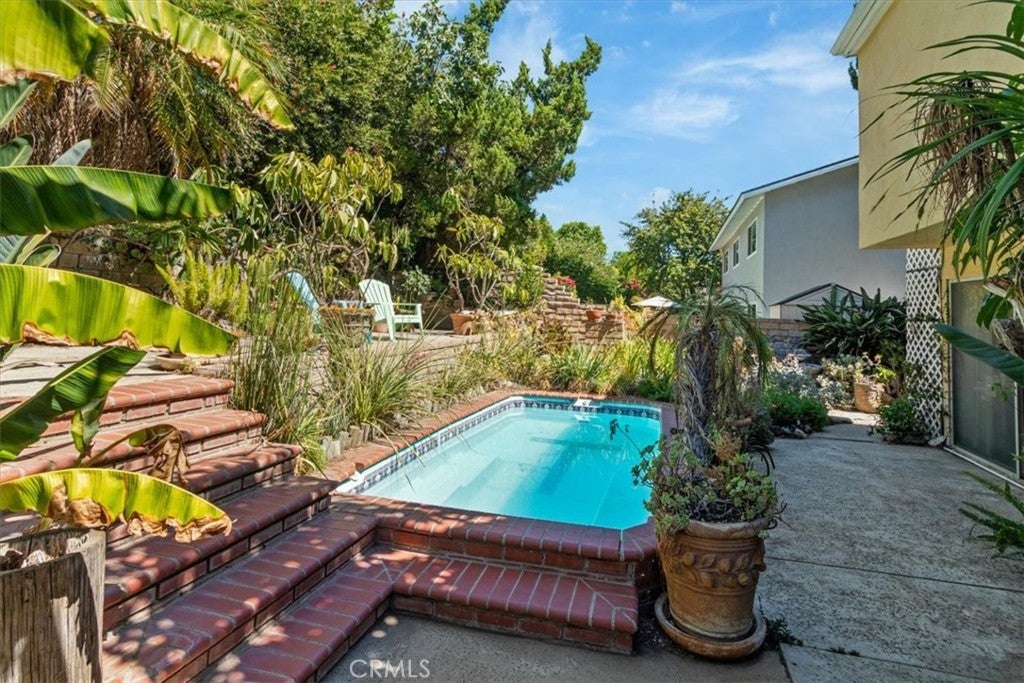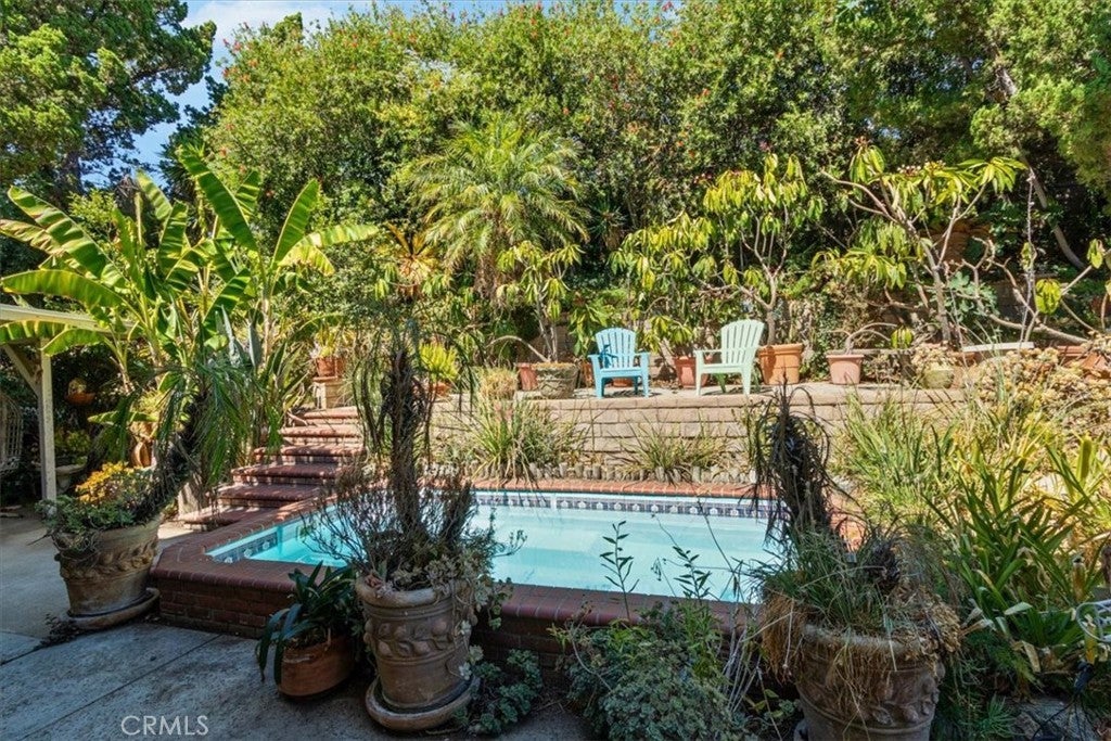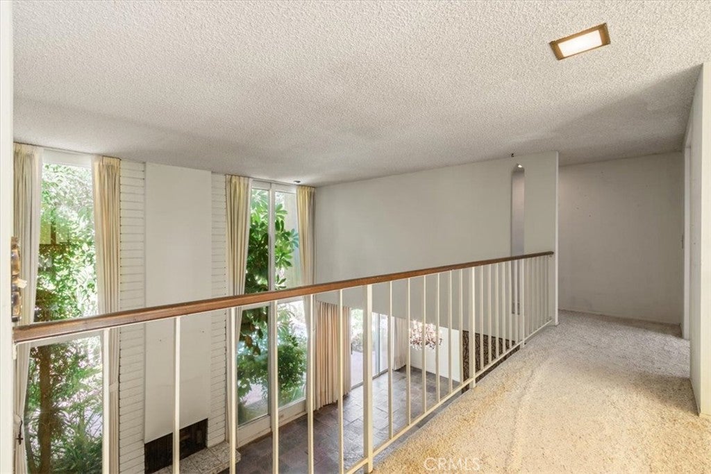 This Mediterranean-style home, with its distinctive Mid-Century Modern flair, presents a rare opportunity for a buyer with vision. Situated on a desirable corner lot within a highly sought-after top-tier school district, the property features a private, gated entry. Inside, soaring ceilings, an elegant MCM staircase, and an impressive floor-to-ceiling fireplace are complemented by expansive windows that fill the sunken living and dining areas with natural light. The main level offers a flexible bedroom and a full bath, alongside a spacious den that could function as a sixth bedroom or combine to create a private mother-in-law suite or attached rental apartment. Stone flooring in the living and dining rooms leads to a covered patio and a lush, tropical-style garden featuring a Koi pond, lap pool, and two covered patios. An eat-in kitchen with sliding doors opens to a second covered patio with stone tile and a unique aviary. A three-car garage provides ample storage. The second floor features an extra-large primary bedroom with a huge private balcony, fireplace, and two closets, including a walk-in, plus a massive en-suite bath. Three additional generously sized bedrooms, two with their own balconies, and extensive storage complete the upstairs. This home is a canvas awaiting your creative vision.