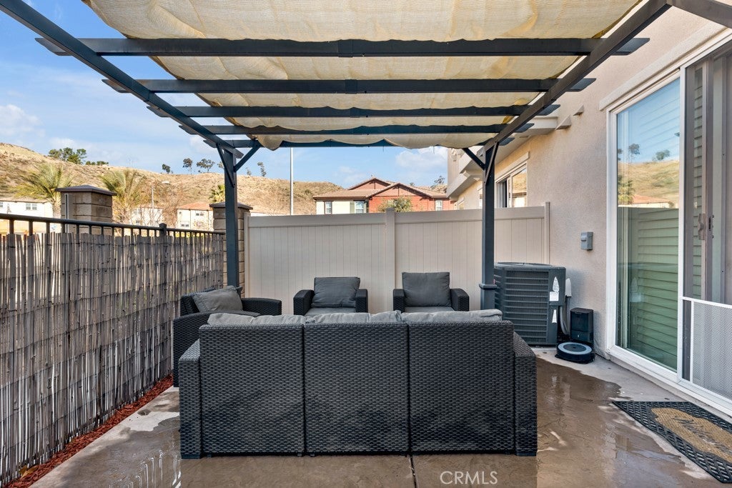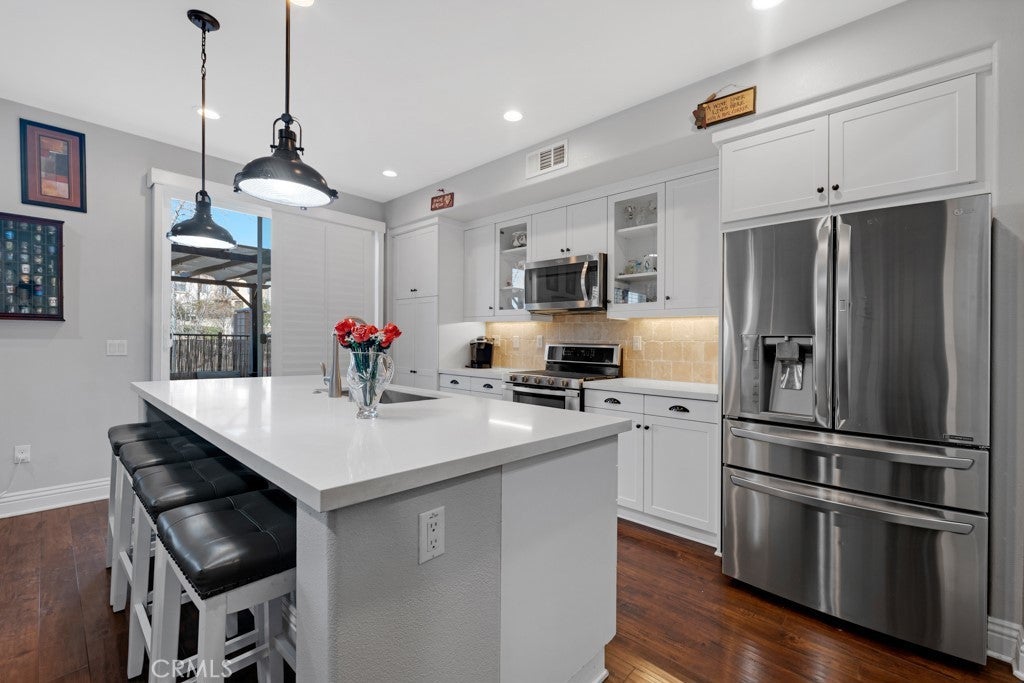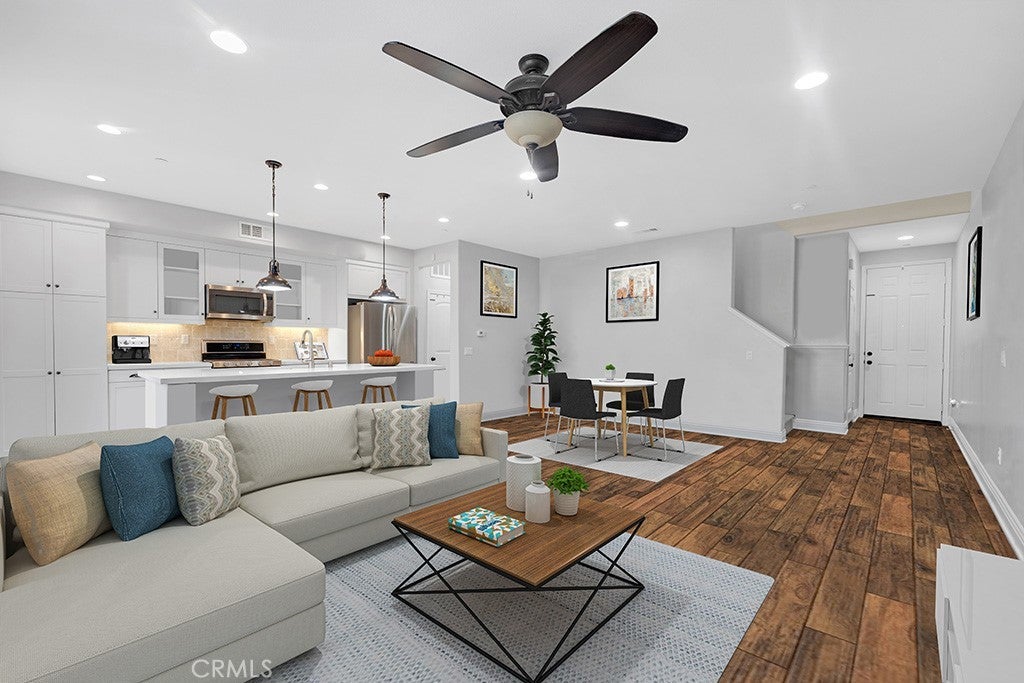 This Stunning Townhome in the Gated River Village Community of Santa Clarita offers a Spacious and Modern Living Space. The Property Offers Three Bedrooms and Two and a half Bathrooms with Approximately 1690 Square Feet. The Downstairs Area includes a Living Room, Galley Kitchen, Dining Area and a Half Bathroom. The Kitchen is equipped with Stainless Steel appliances, Quartz Counter-tops, White Cabinets, and a Pantry-Closet. Laminate Floors run throughout the Downstairs and Upstairs, along with White Shutters for a Clean and Contemporary look. Moving Upstairs you will find a Large Office Niche, an Additional Counter Area with Cabinets perfect for Storage Capabilities, Laundry Room, the Primary Bedroom and Full Bathroom which Includes a Large Walk in Closet, Dual Vanity Sinks, Separate Tub & Shower, and White Cabinets with a Quartz countertop. There are Two Guest Bedrooms and another Guest Bathroom with Dual vanity Sinks, a Quartz Counter top, White Cabinets, and a Tub-Shower. The Laundry Room Upstairs provides Convenience for Household chores. Residents can Enjoy the patio for Relaxation while Sitting under the Pergola on a hot Summer day, or take a short Walk across the street to the Beautiful Resort Style Pool, Spa or take the Children to Enjoy the Park with Play Structure. The Condominium's Location Offers easy Access to Nearby Shops and Restaurants, while being Nestled in the Beautiful Hills of Santa Clarita. Overall this Property combines Comfort, Style, and Convenience making it a Desirable place to call Home in Santa Clarita's River Village Community.