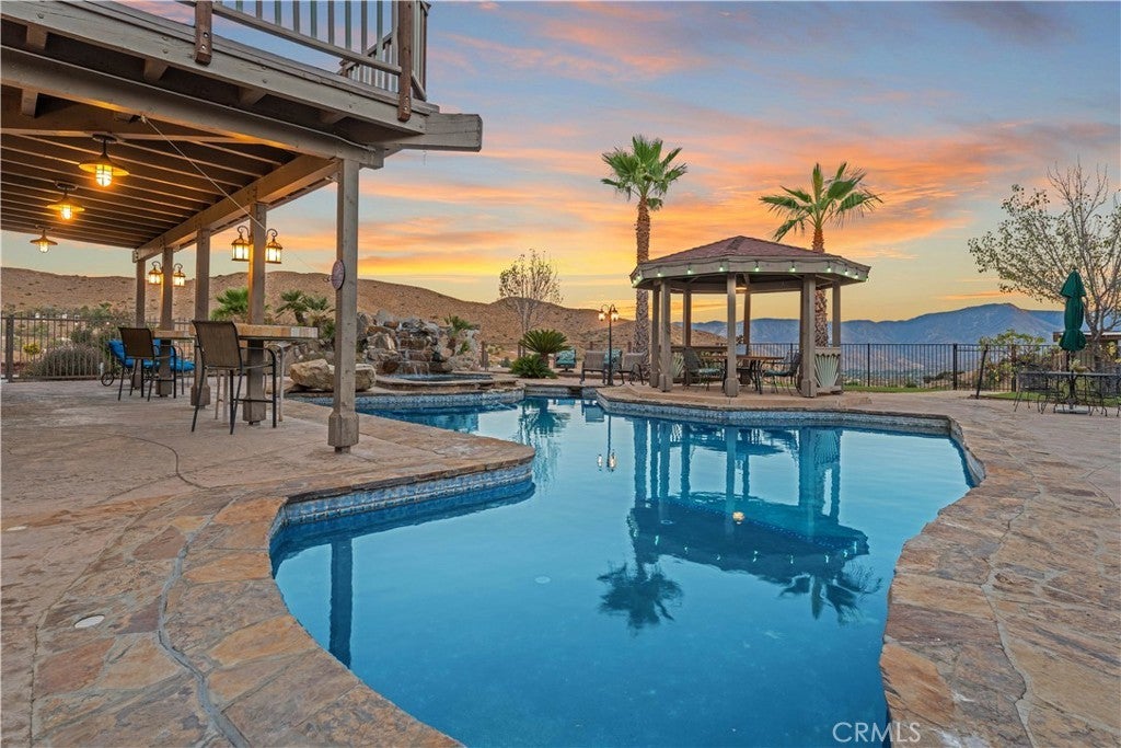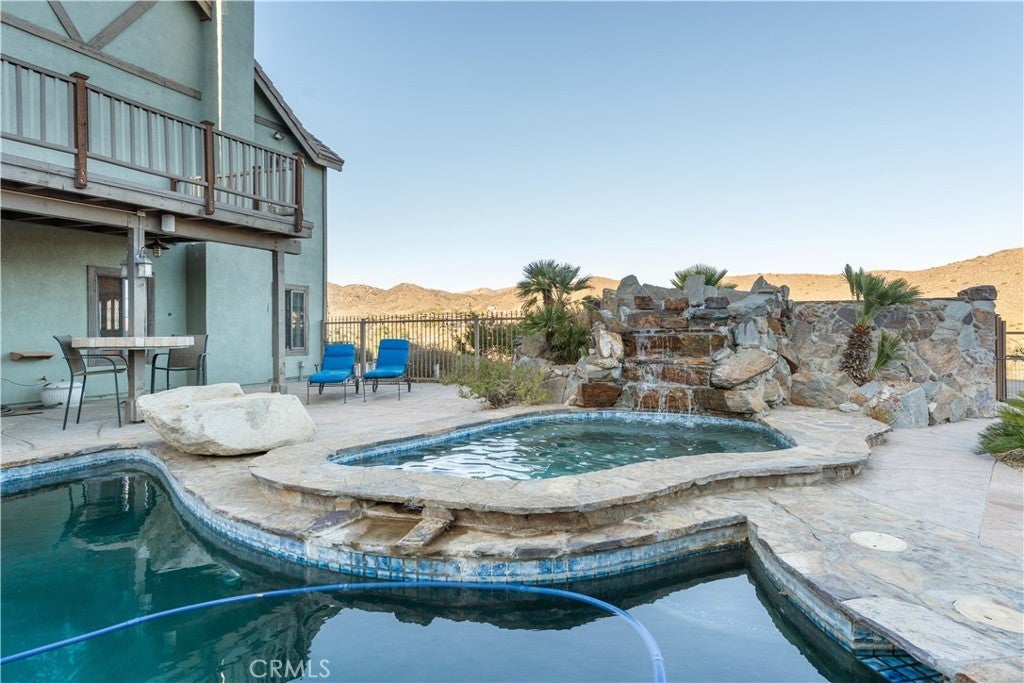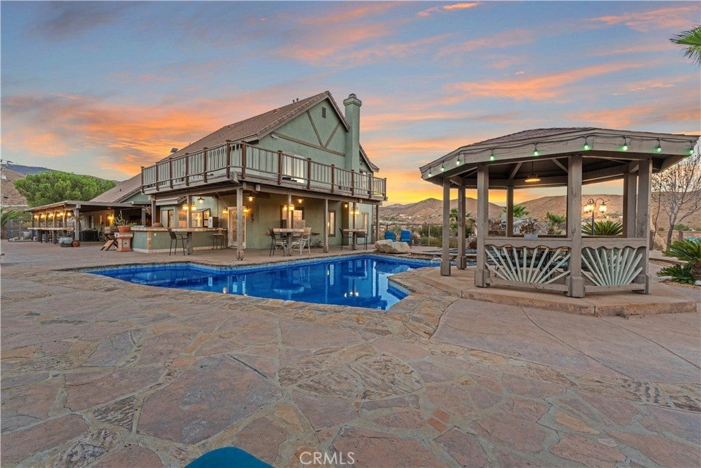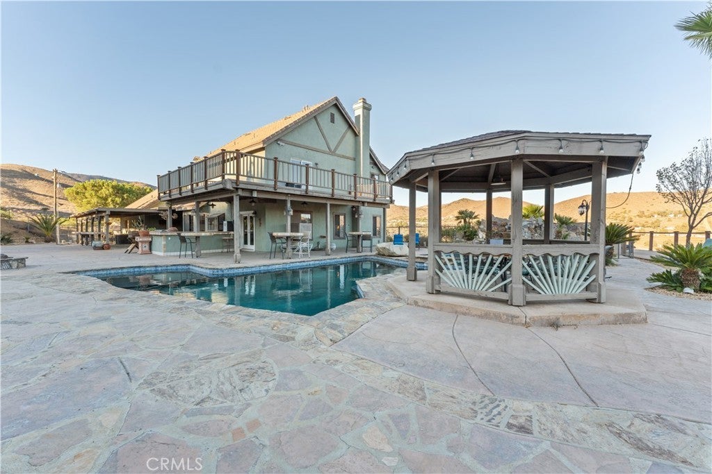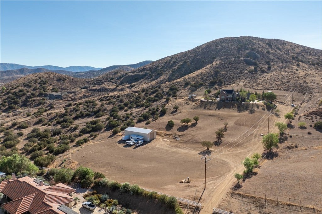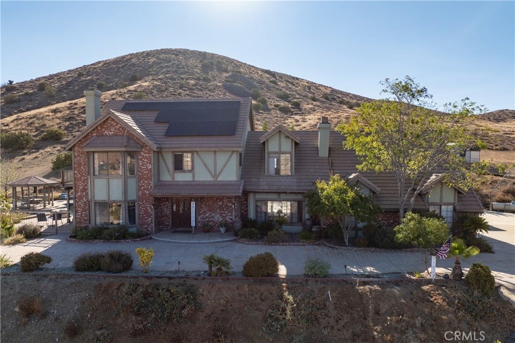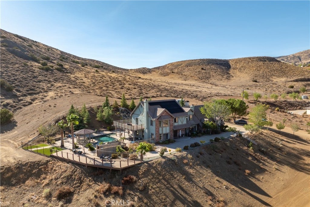 Over 5 acres of private grounds with 365 degree sweeping views of the golden California foothills. Safe and secluded, this elegant property can be your forever home, a private party location, or your equestrian estate. Located in upscale Acton, the elevated hillside terrain affords panoramic views with soft morning sunrises and stunning red sunsets. The 3194 s/f home features large picture widows and, during the day, sunbathed light in every room. With no streetlights nearby, you'll see the night sky filled with millions of stars and hear nothing but the peaceful quiet. Enjoy these breathtaking views with morning coffee or afternoon cocktails on the (12x60) deck overlooking Acton, or on the second-story wrap-around balcony! The professionally landscaped yard includes lush desert scape, mature pine trees, massive boulders, and a rock waterfall built into the hillside. These encircle a huge, finished outdoor area with heated pool, spa (seats 14 comfortable), custom built-in barbecue, and six built-in high-top tables for that elegant wedding reception, family reunion, or holiday event. The outdoor sound system and cozy fire pit will bring a warm ambience to the chilly evenings. The elegant cobblestone driveway welcomes you to the home's expansive front door and cozy wood beam and brick façade. Inside are formal and family living areas, five spacious bedrooms, four baths (large bed and full bath downstairs for guests), each of which include windows or doors that open to the magnificent views and office leads to the stunning wrap-around balcony. The newly renovated master ensuite boasts a gorgeous stand alone tub, walk in shower with floor to ceiling marbled tile. Need more space? There is a huge walk-in attic (29Lx15W) A 30x60 workshop with bathroom inside; also a 200 amp panel with 50/30 amp RV hook ups. Have horses? There's room for them too! 8x24 chicken coop and 20xx24 chicken run. Tesla solar system and back up battery. Private well 6k gal. tank and MUCH MORE!
