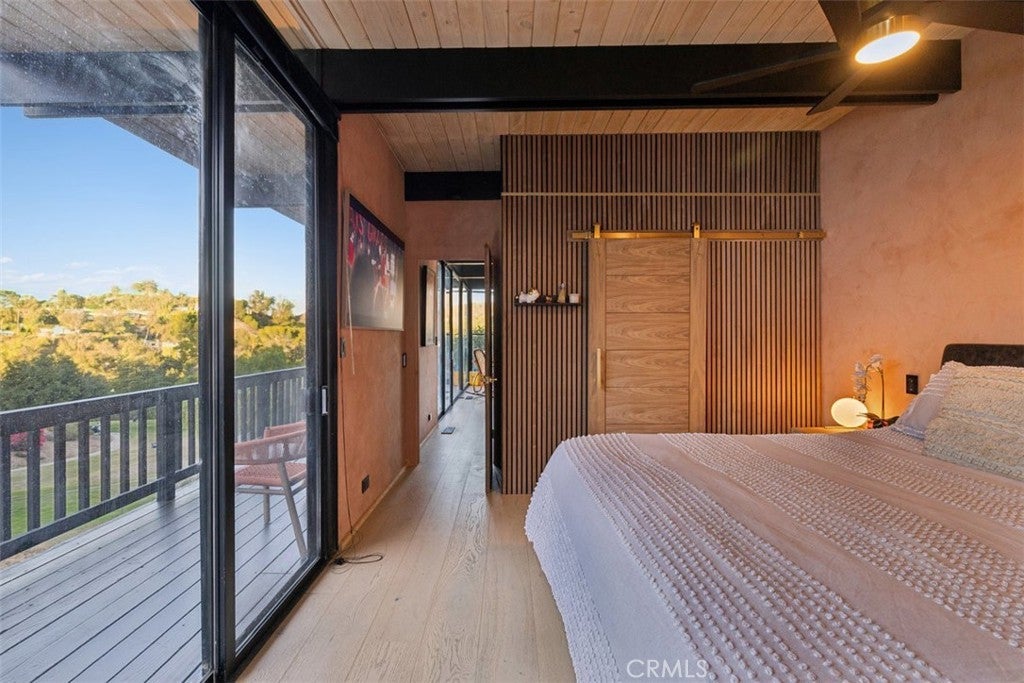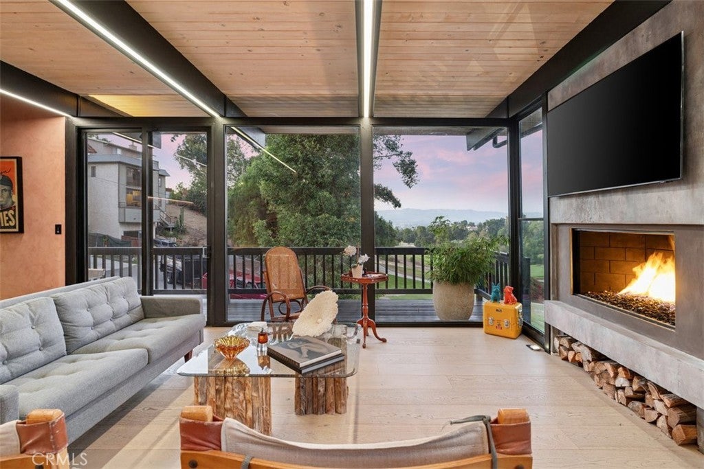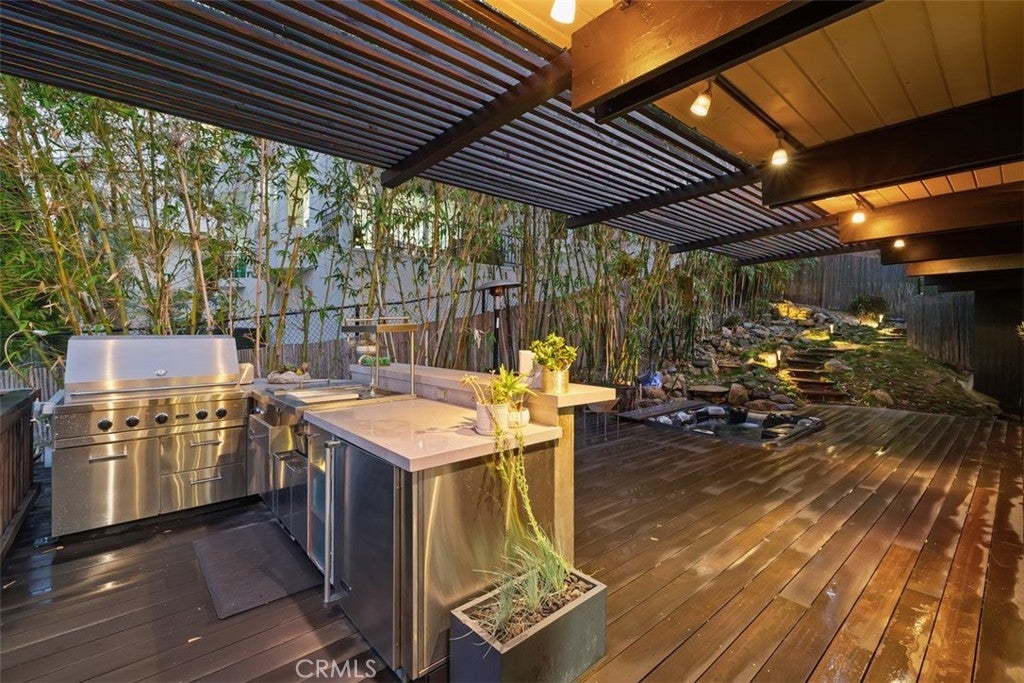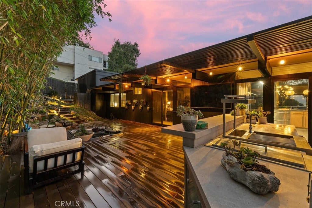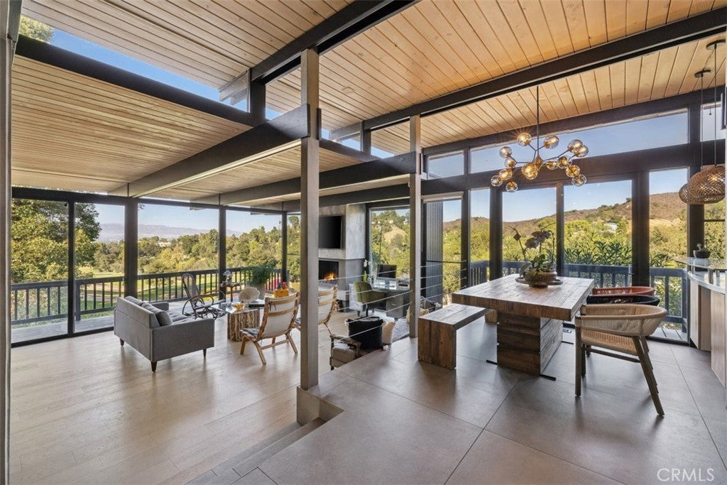 A Rare Mid-Century Modern Gem with Iconic Design and Panoramic Views Mid-century modern homes of this caliber rarely come to market. Designed by architect Dale Bergerson with legendary A. Quincy Jones. built in 1965 for the Zimmerman family, this architectural treasure embodies the clean lines, open spaces, and indoor-outdoor flow that define the era. Perched on a knoll above the 15th green of the Woodland Hills Country Club, the home captures sweeping mountain and golf course views through walls of glass and clerestory windows. Natural light floods the interior, highlighting Venetian plaster walls and distinctive tile and white oak flooring. Post and Beam construction creates a timeless, airy ambiance. The living space is centered around a dramatic gas fireplace and seamlessly connects to both front and rear outdoor areas. A Teak wood entertainer’s deck spans the back of the home, featuring a Viking outdoor kitchen, built-in spa, and tranquil custom waterfall, all framed by a towering wall of timber bamboo for added privacy. The chef’s kitchen is fully outfitted with premium appliances, including a Wolf range, Sub-Zero glass refrigerator, Miele built-in coffee station, and a temperature-controlled wine cooler. Three spacious bedrooms and two bathrooms are intelligently placed along a wide, open floor plan. The primary suite opens directly to the front deck, offering morning sunlight and evening serenity. The landscaping is a masterclass in balance and simplicity, inspired by traditional Japanese garden design. Additionally, a newly remodeled bonus room below the main residence offers flexible use—currently serving as a home theatre and art studio. Thoughtfully designed and impeccably maintained, this home is a rare opportunity to own a piece of architectural history with all the luxuries of modern living.