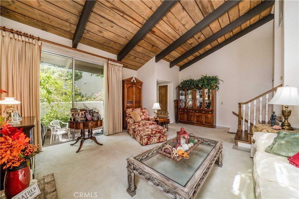 Welcome to this spacious tri-level, light-filled “End Unit” townhome, beautifully located within the highly sought-after Studio Village complex with a large greenbelt pool and spa very near the unit. A gated and walled, private brick garden patio serves as the entrance to a split-level floor plan, opening to a living room with soaring cathedral-beamed ceilings, a floor-to-ceiling south-facing window featuring gorgeous frosted stained-glass insets, a natural brick fireplace and hearth, and sliding doors leading to the private patio for BBQing and entertaining. The large dining area visible from the living room includes a wet bar with storage cabinets and connects to a bright galley kitchen featuring stainless steel appliances, custom tile countertops and backsplash, and a charming breakfast area connected to a family room/den (possible 3rd bedroom) with the addition of a wall, and an adjacent 3/4 guest bath and storage closet. Upstairs, two generously sized en-suite bedrooms feature large, screened picture windows, bathrooms, and walk-in closets. The primary bedroom features a fantastic window seat and an extra-large walk-in closet. A private direct-access two-car garage has two walls of built-in storage cabinets and a laundry area. The HOA includes earthquake insurance, on-site management, security patrol, landscape maintenance, cable TV/internet, water, and access to incredible amenities, including six heated pools, five spas, tennis & pickleball courts, and more. Located in the coveted Carpenter Community Charter School district and near Tujunga Village, Woodbridge Park, Ventura Blvds trendy shops, cafes, and the Sunday Farmers Market, this townhome truly is a rare find in a fantastic community.