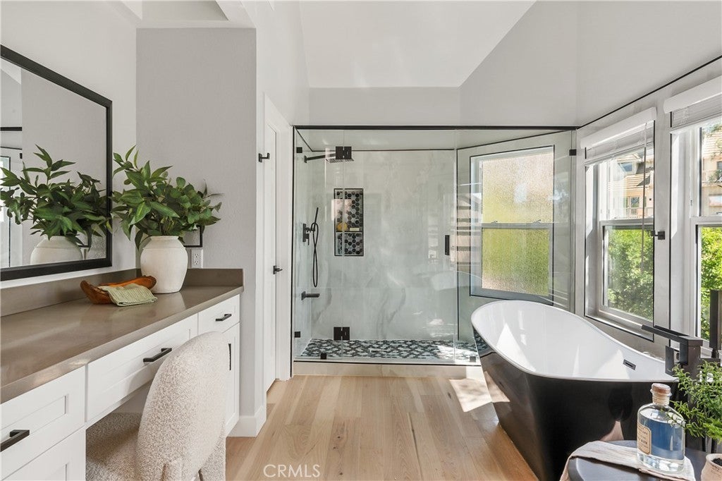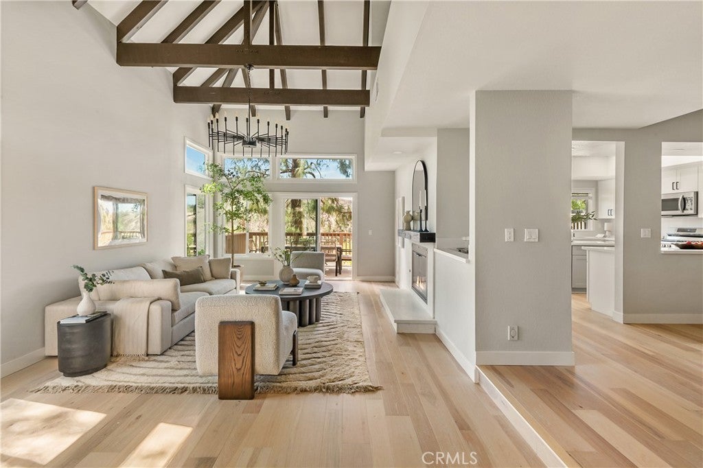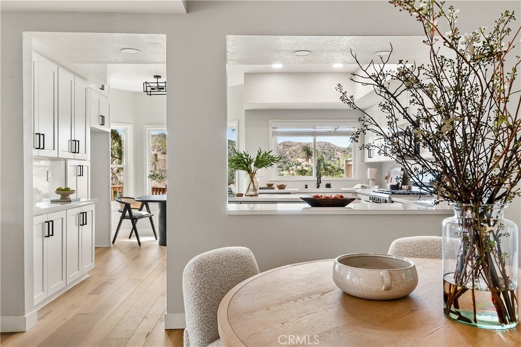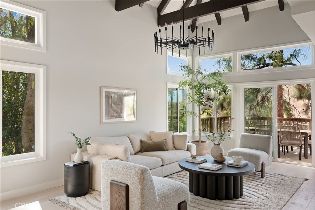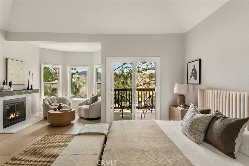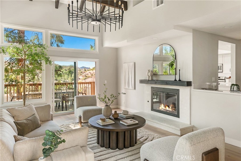 Welcome to the coveted gated community of Westlake Pointe, where this brand-new, fully reimagined residence is framed by sweeping valley and mountain vistas. This end-unit townhome blends timeless modern opulence with enduring quality, featuring vaulted ceilings with exposed wood beams where natural light pours across every corner of living space. The vast, open family room is steps away from a designer kitchen featuring quartz countertops, a standalone island, stainless steel appliances, a wine bar, and a formal dining area ideal for gatherings. The lower level offers a private en-suite bedroom or office with mountain views and a hand-laid tile shower. Upstairs, the serene primary suite boasts vaulted ceilings, a spa-inspired bath with a soaking tub, walk-in shower, two expansive closets, fireplace, and breathtaking views. Two additional spacious bedrooms open to a private deck for relaxing outdoors. Every detail has been upgraded, including sealed solid wood Mandalay Hickory engineered hardwood flooring throughout, copper plumbing, brand-new HVAC, electrical, and windows, fully waterproofed patios, and a drip irrigation landscape system. This is simply more than a renovation; this home is a complete reinvention of luxury living in Westlake Pointe.